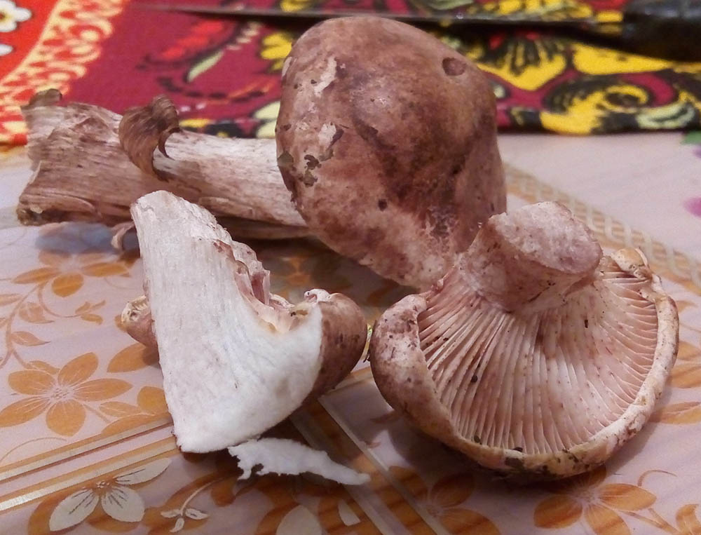 При сборе — тёмно-розовый цвет шляпки, цвет ножки почти не изменился. Волокна ножки крепкие, без пустот.