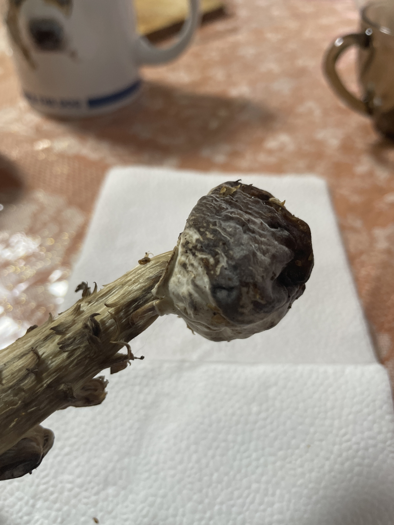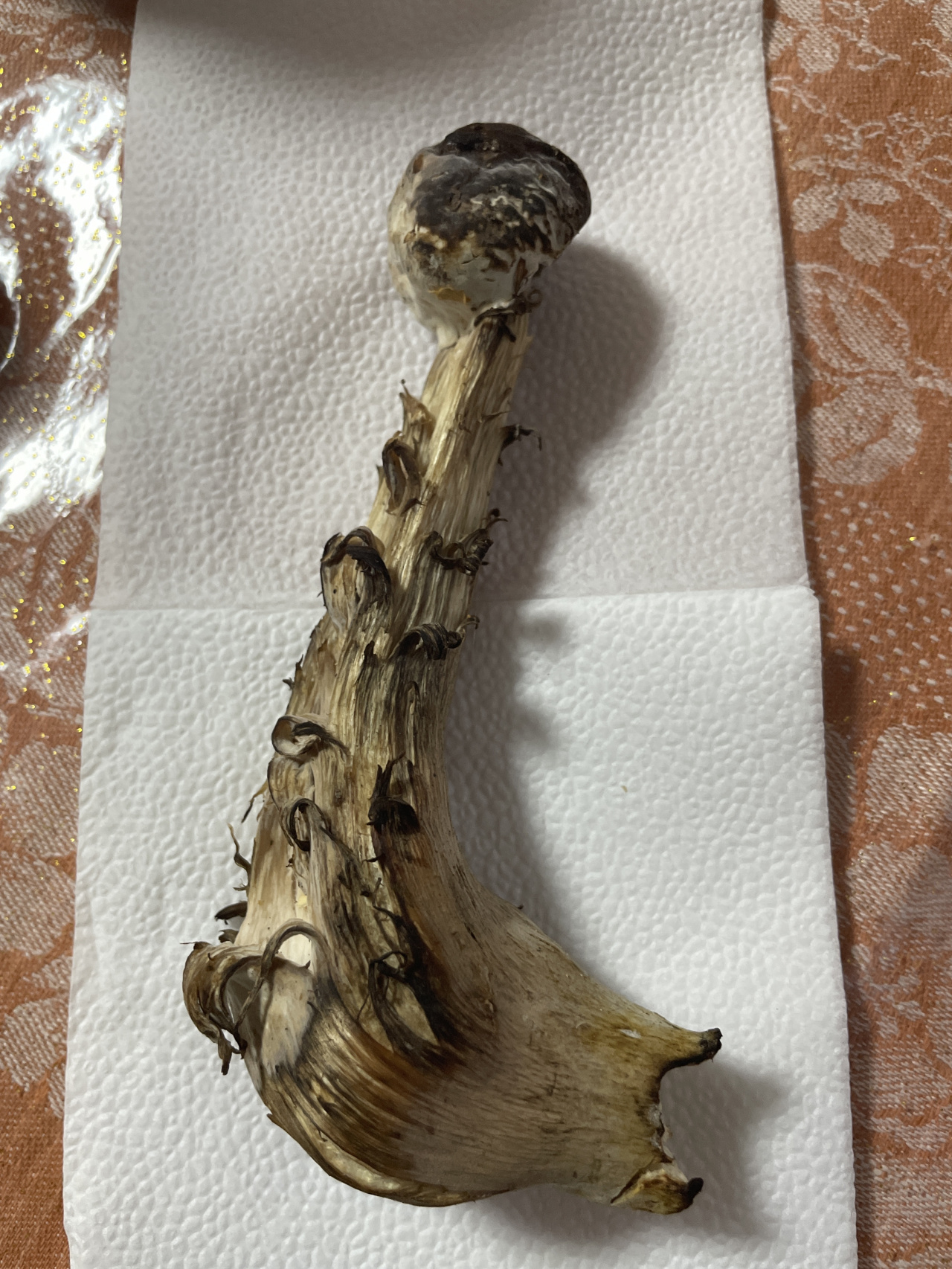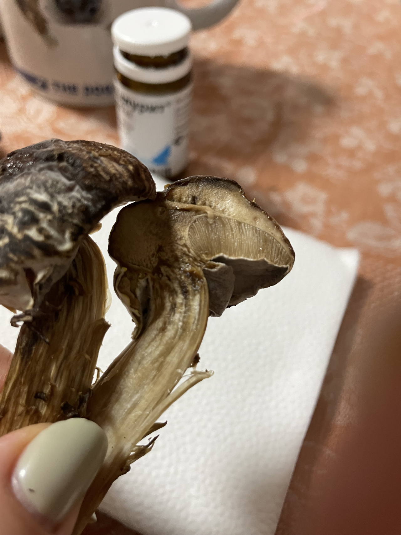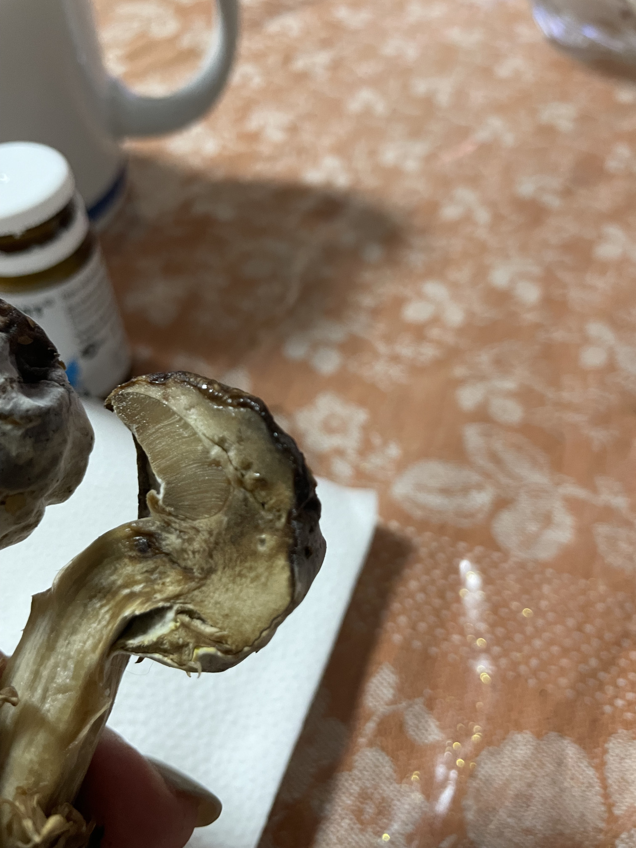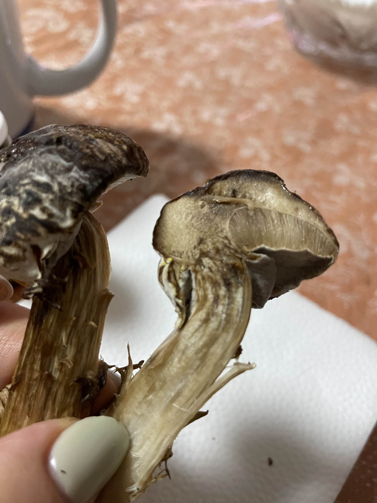 Пока не выбросили, сделайте, пожалуйста, фото гименофора (то, что с нижней стороны шляпки) максимально резко и максимально близко. Поверните гриб так, чтобы свет попадал под шляпку.