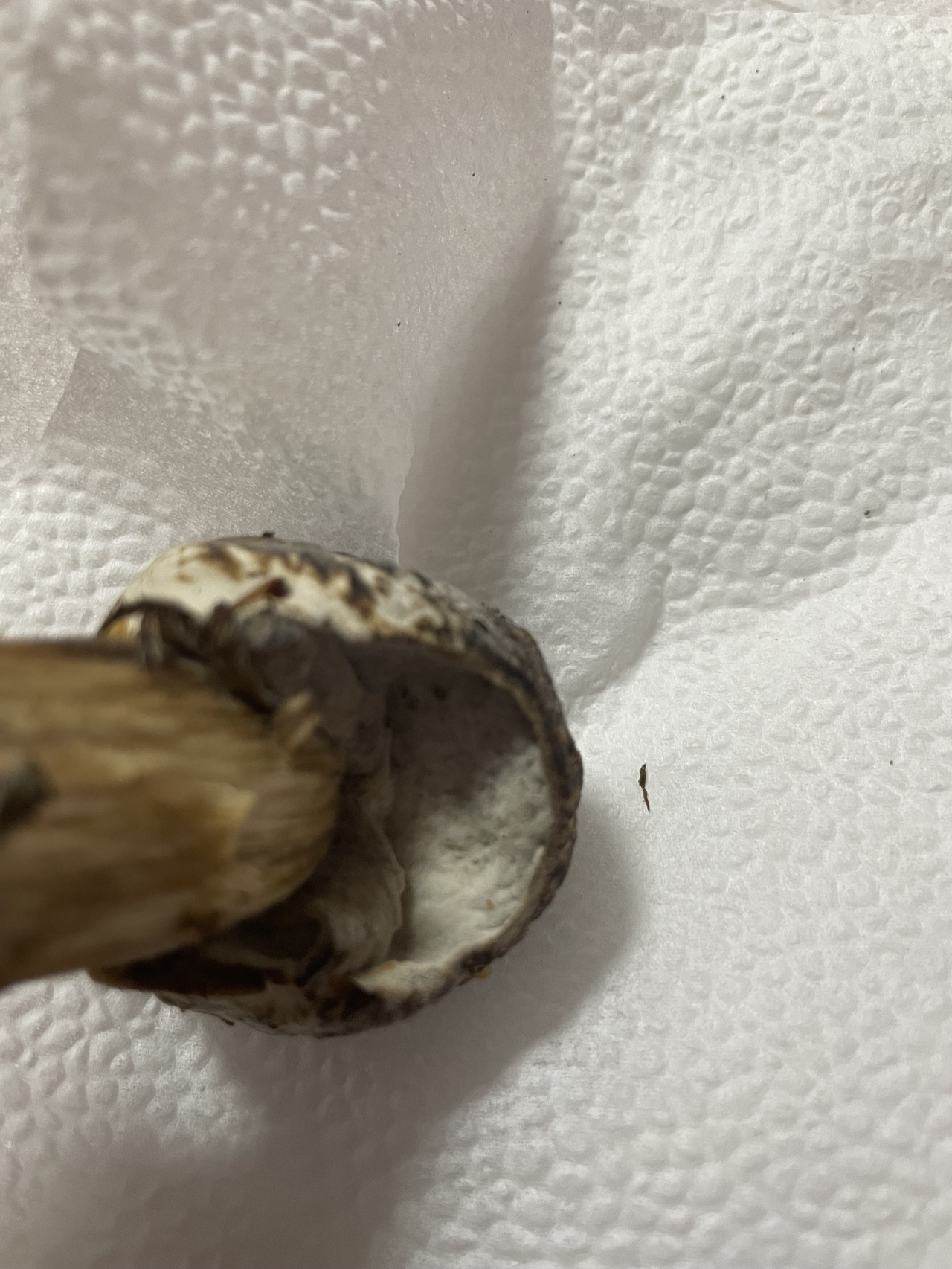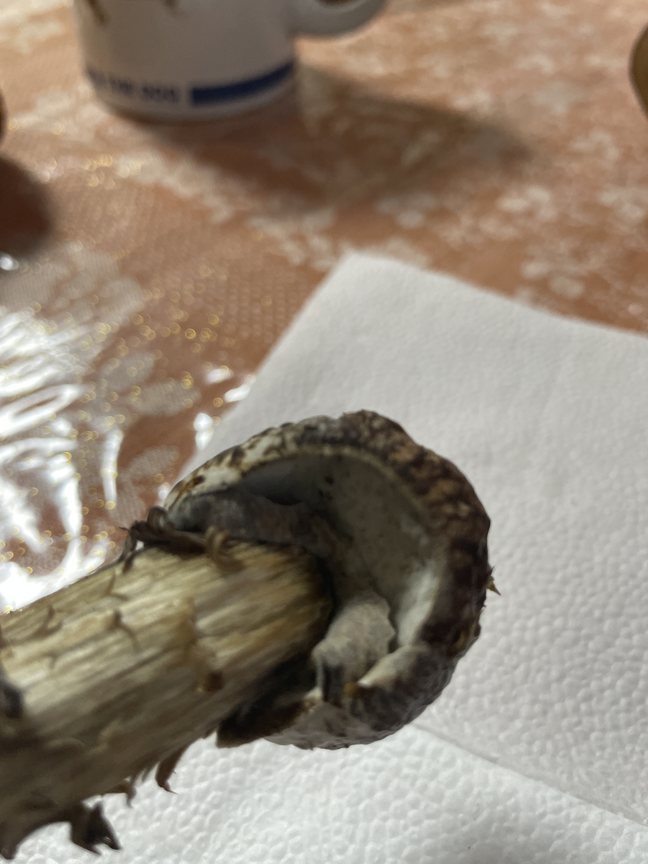 Ножка сухая, жесткая (как у старого опенка) внизу под шляпкой похоже на кольцо