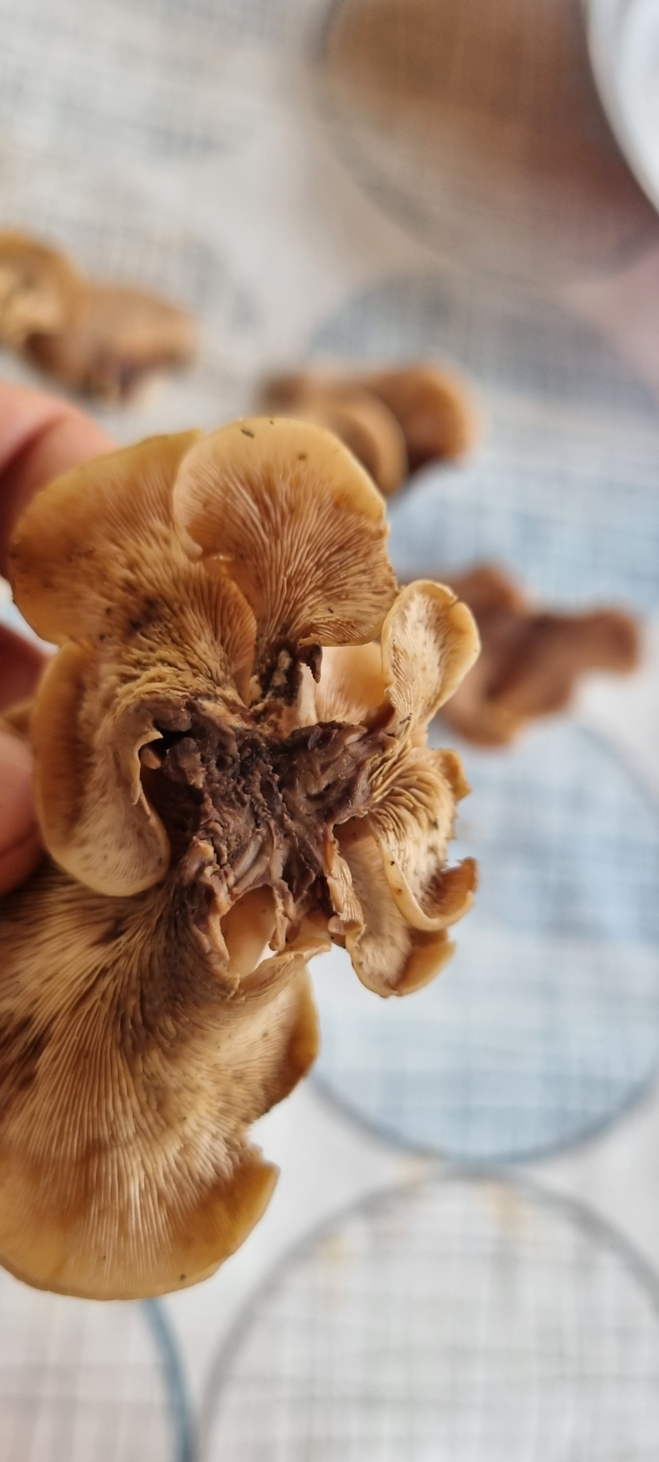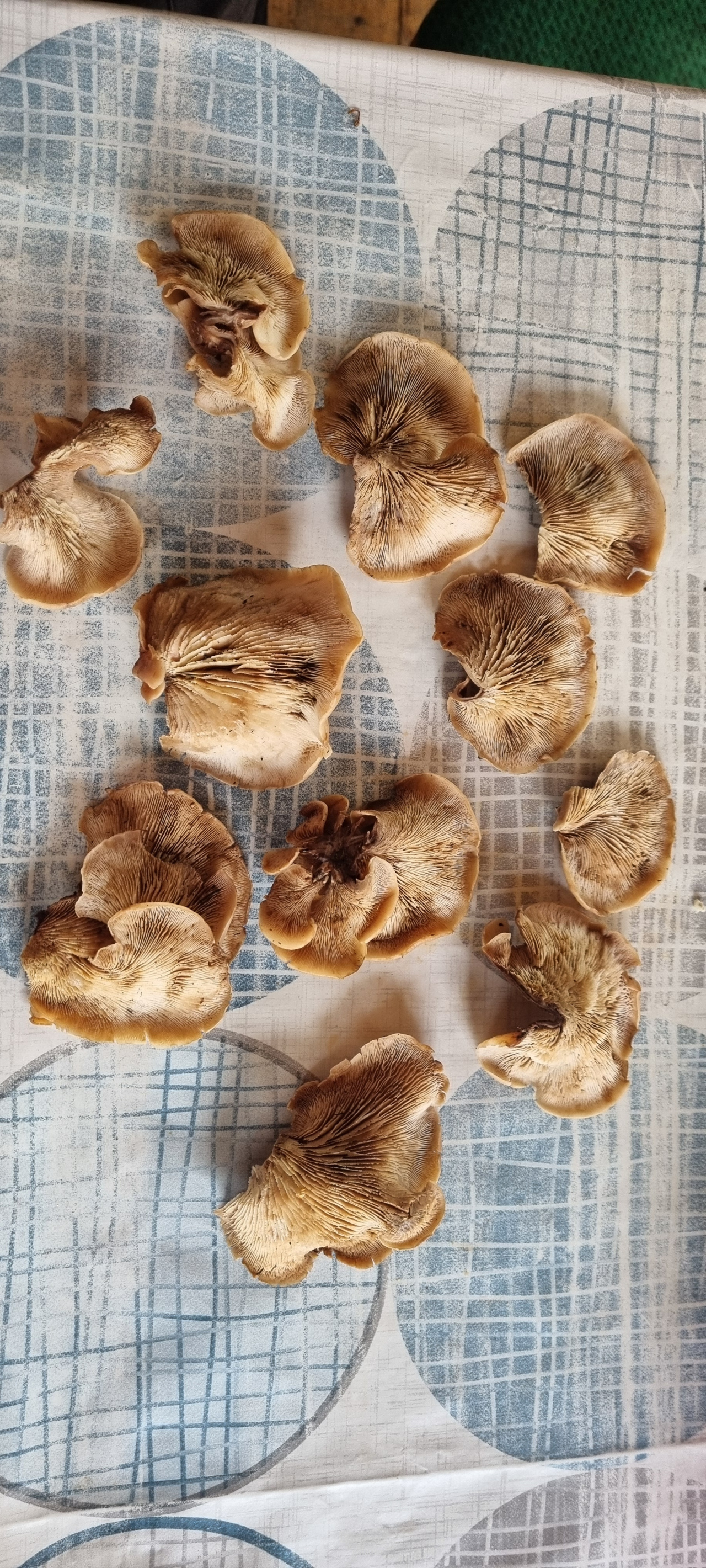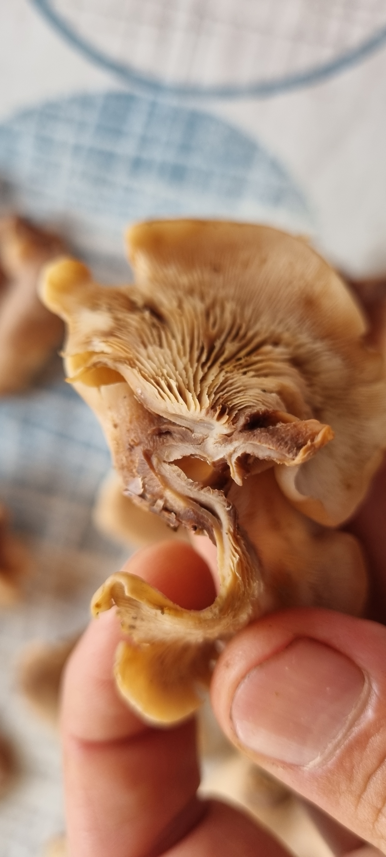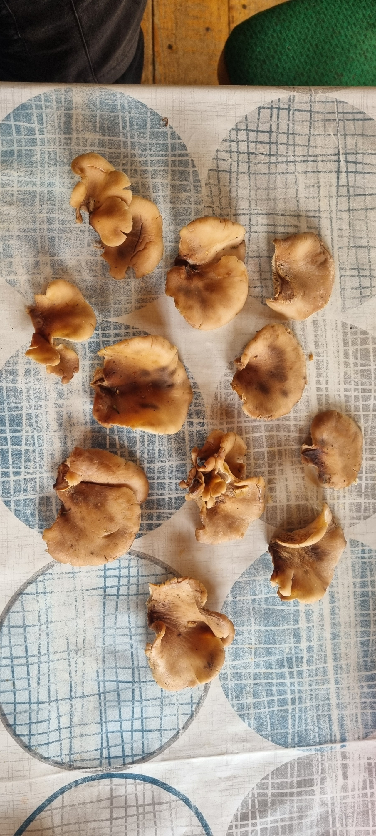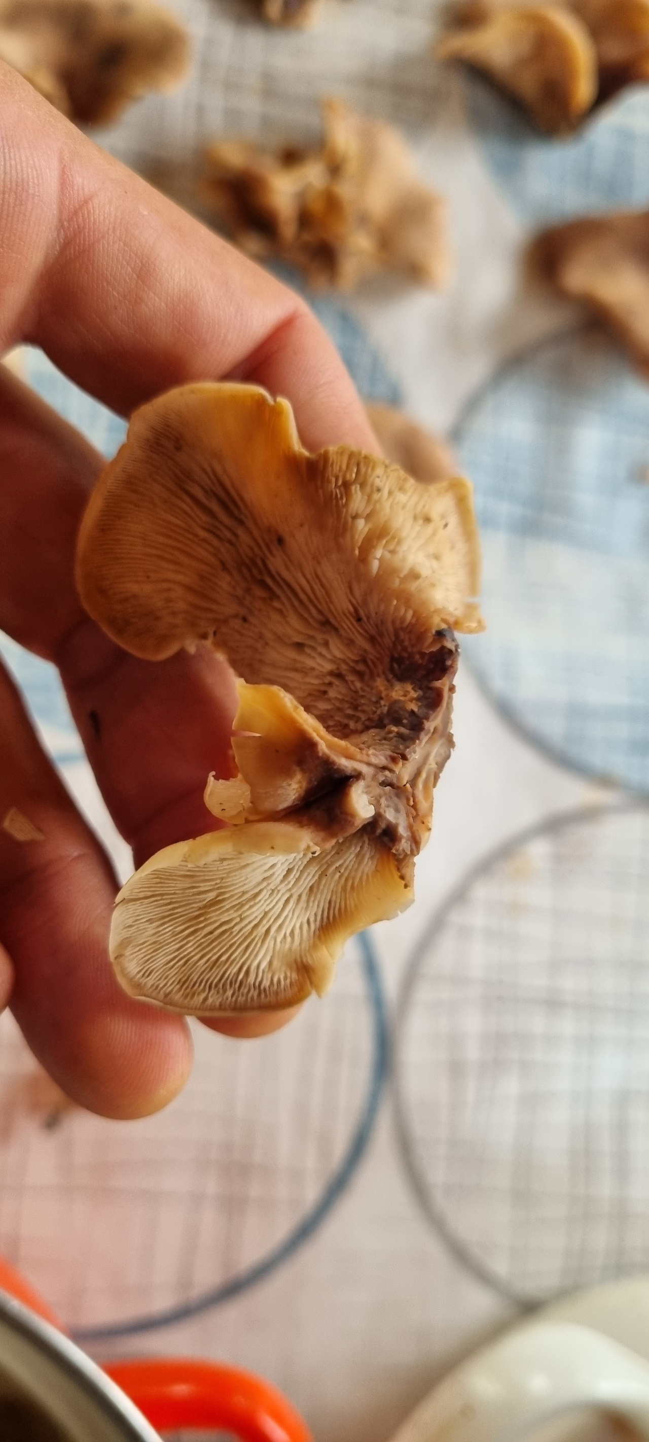 Описание гриба: Под Сергиевом Посадом обильно на лежащей мертвой берёзе. Цвет светло-серый. Похож на вёшенку, но нет ножки. Грибы срастаются шляпками между собой.