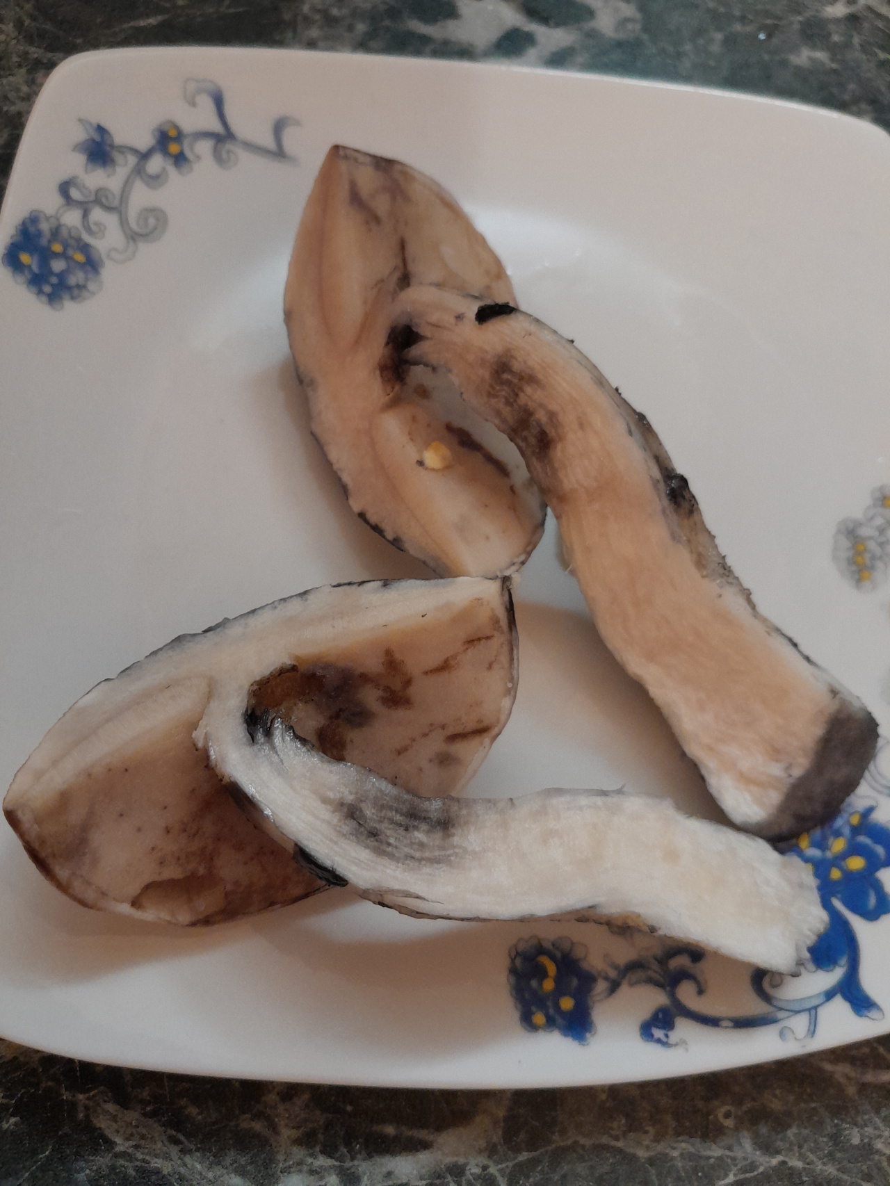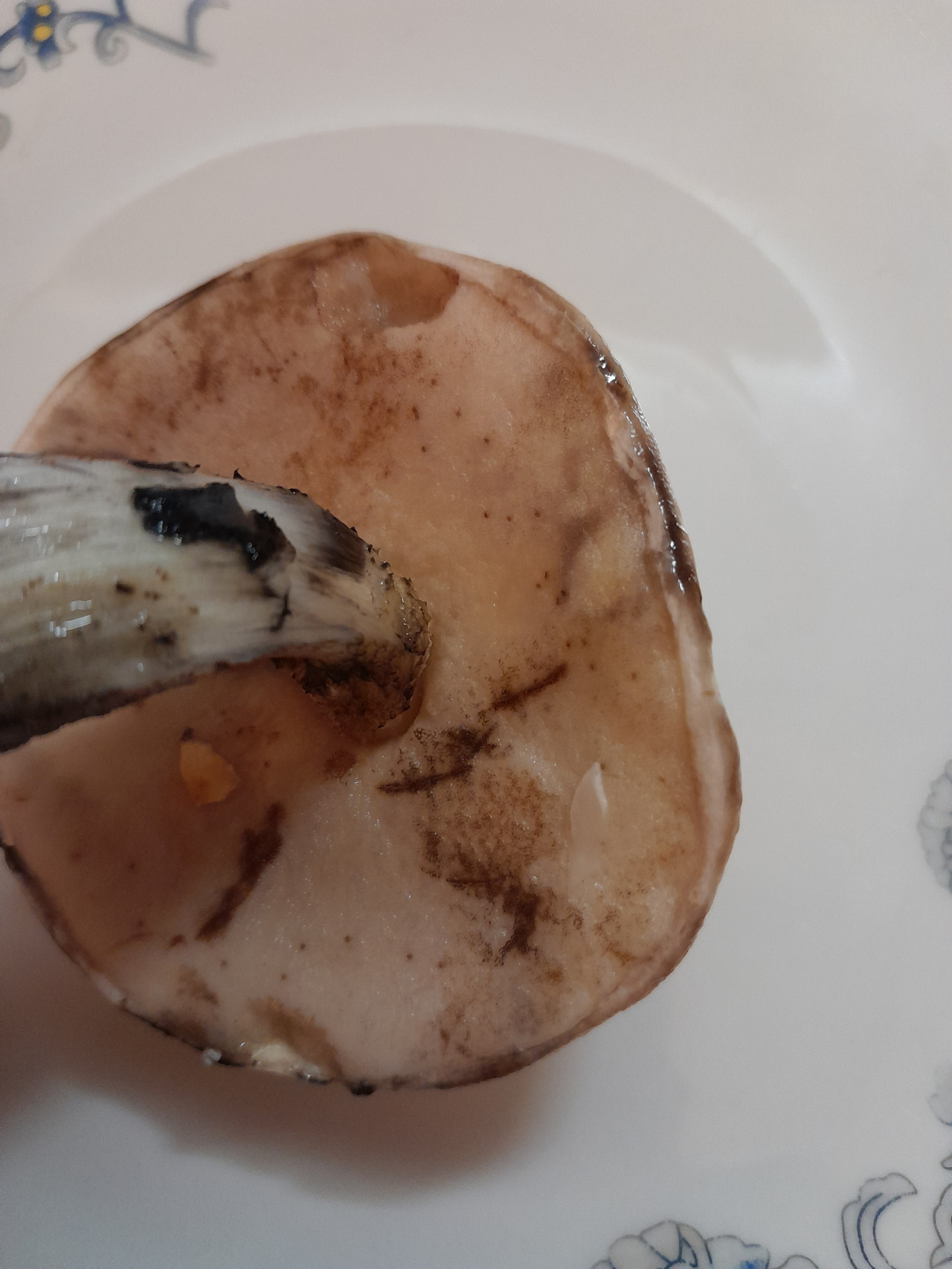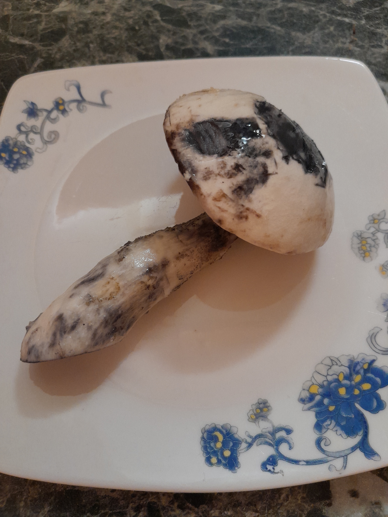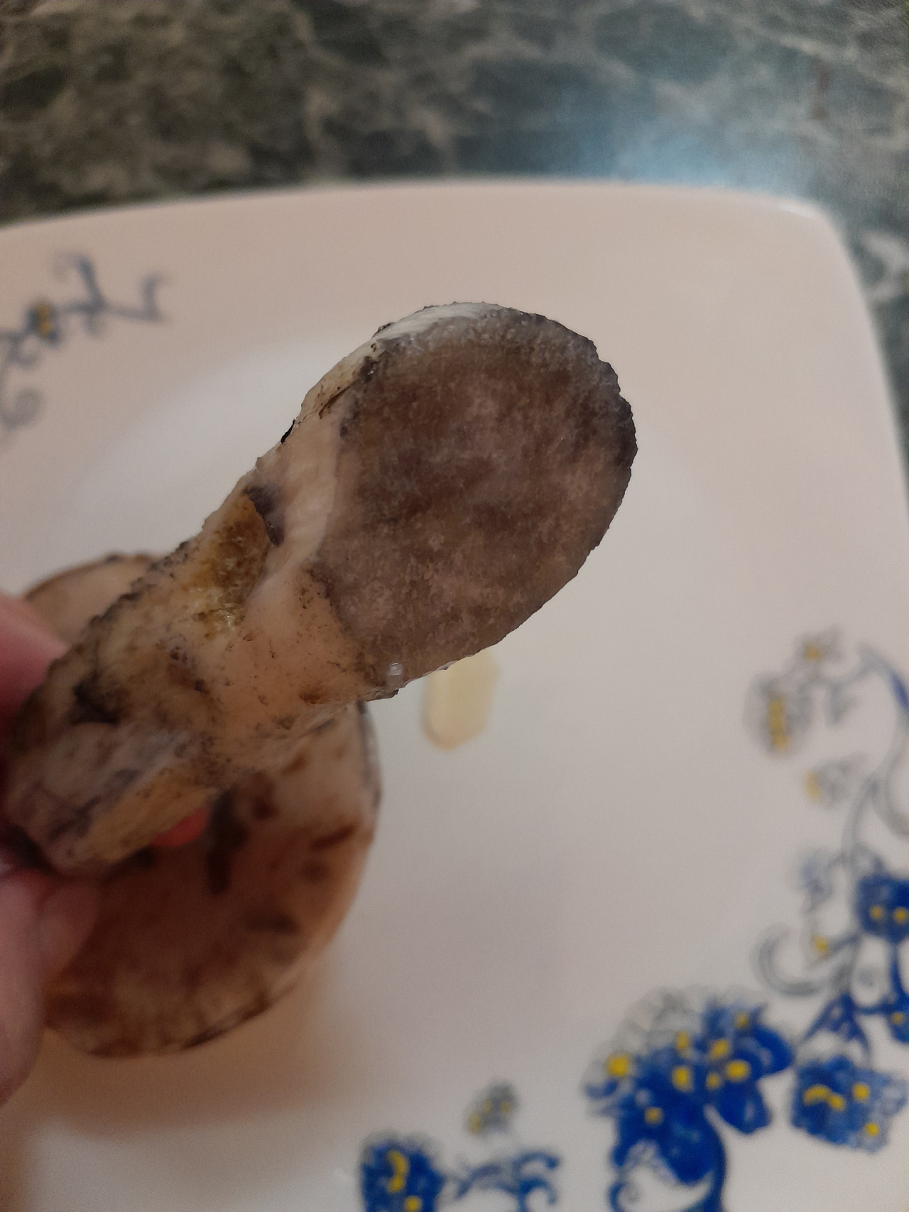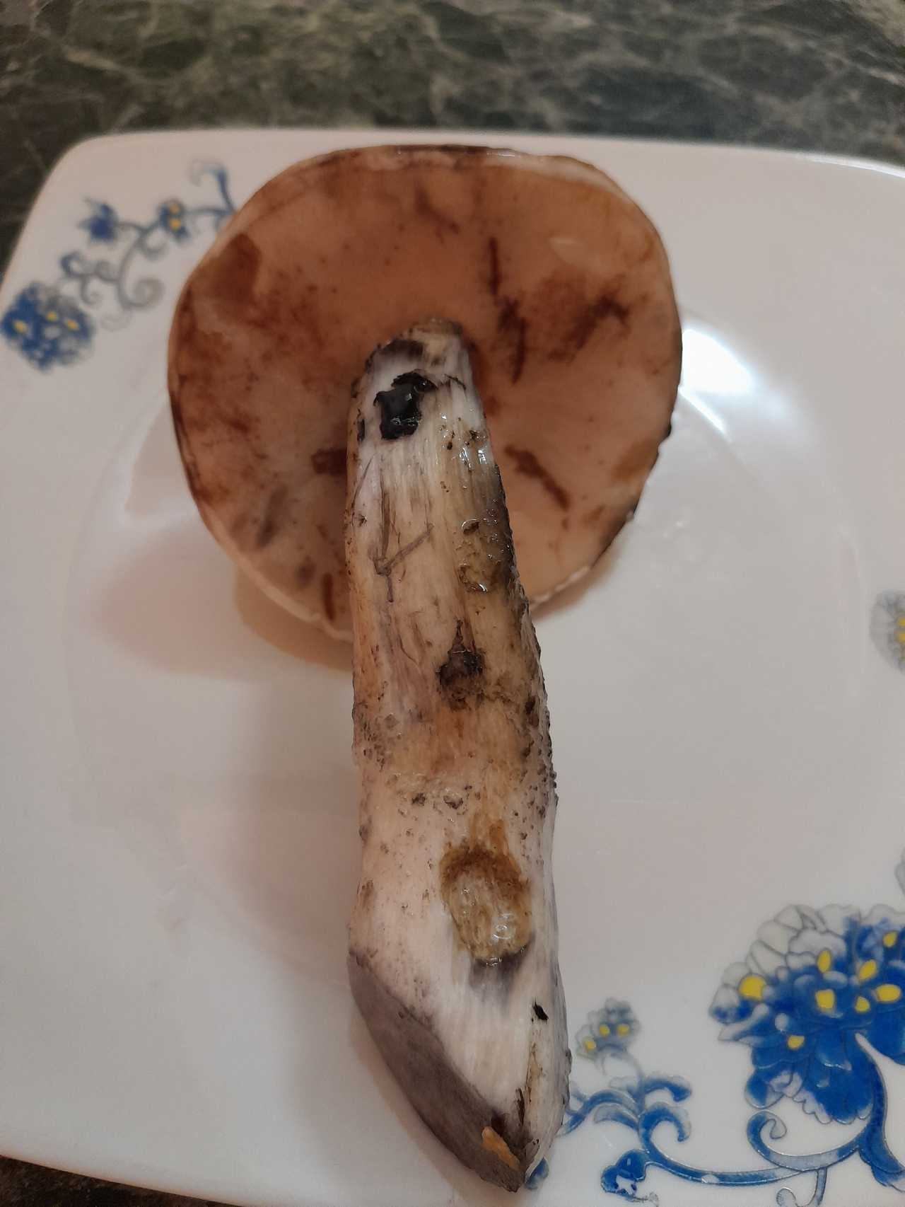Описание гриба: Белый, красивый, вкусно пахнущий, ножка утолщается к низу, под шляпкой мякоть, как губка. Повреждённые участки шляпки и ножки чернеют. Лес берёзовый.