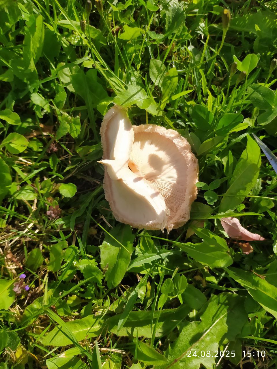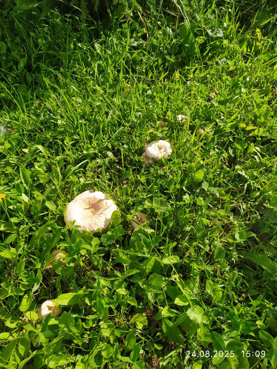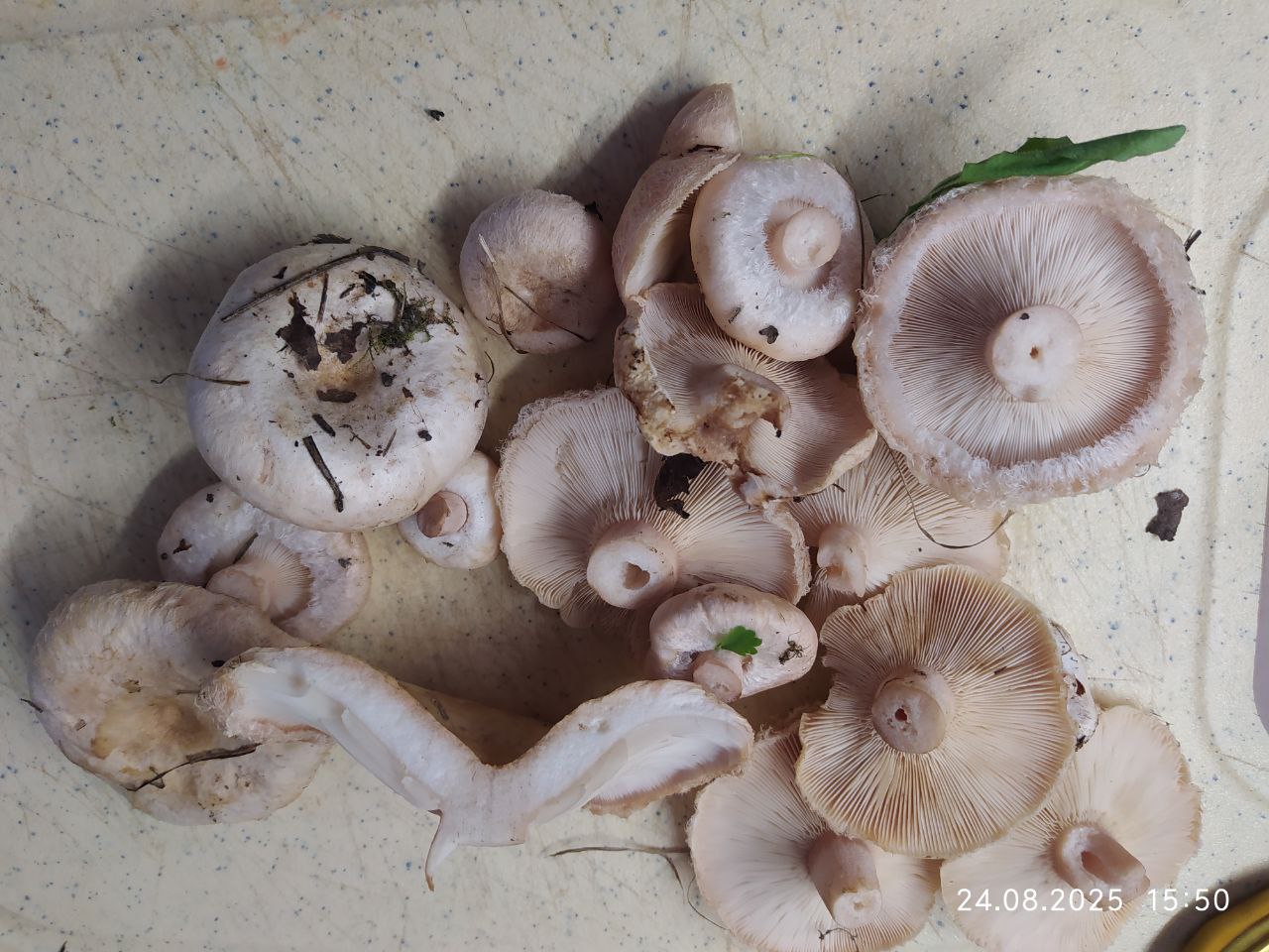 Описание гриба: Белого цвета, с слегка розоватым оттенком, по кнфигурации похож на груздь или волнушку. Лохматый как волнушка, ножки с дуплом но не у всех. Вырос между елками и березами в поле рядом с домом.