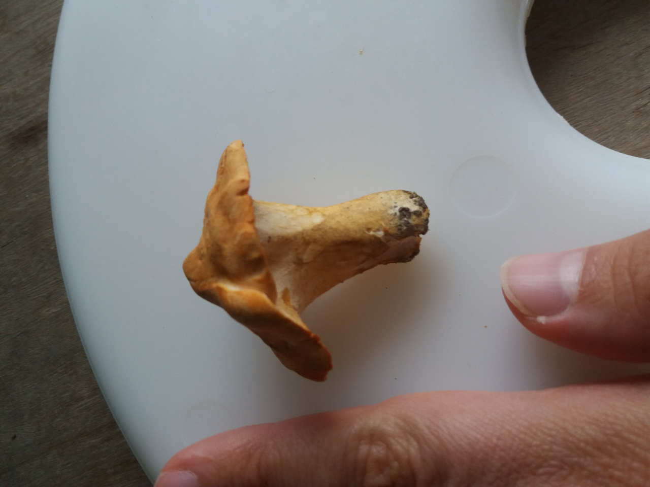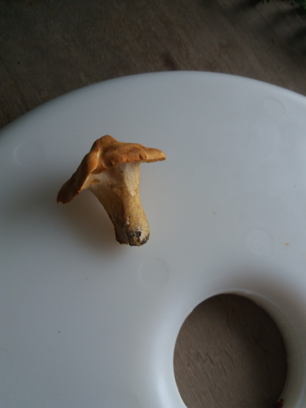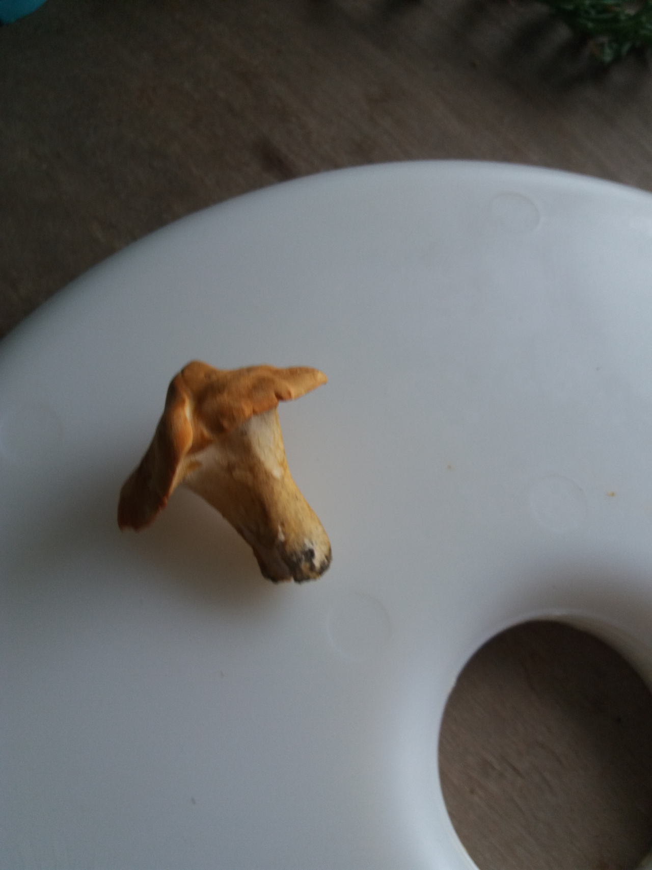 Цвет яркий, похожий на цвет лисички. Отличительной особенностью является гименофор — никогда раньше не видел такого, это не пластинки, не трубочки, а какие-то сосочки или иголочки. Шляпка остроконечная. Запах грибной.