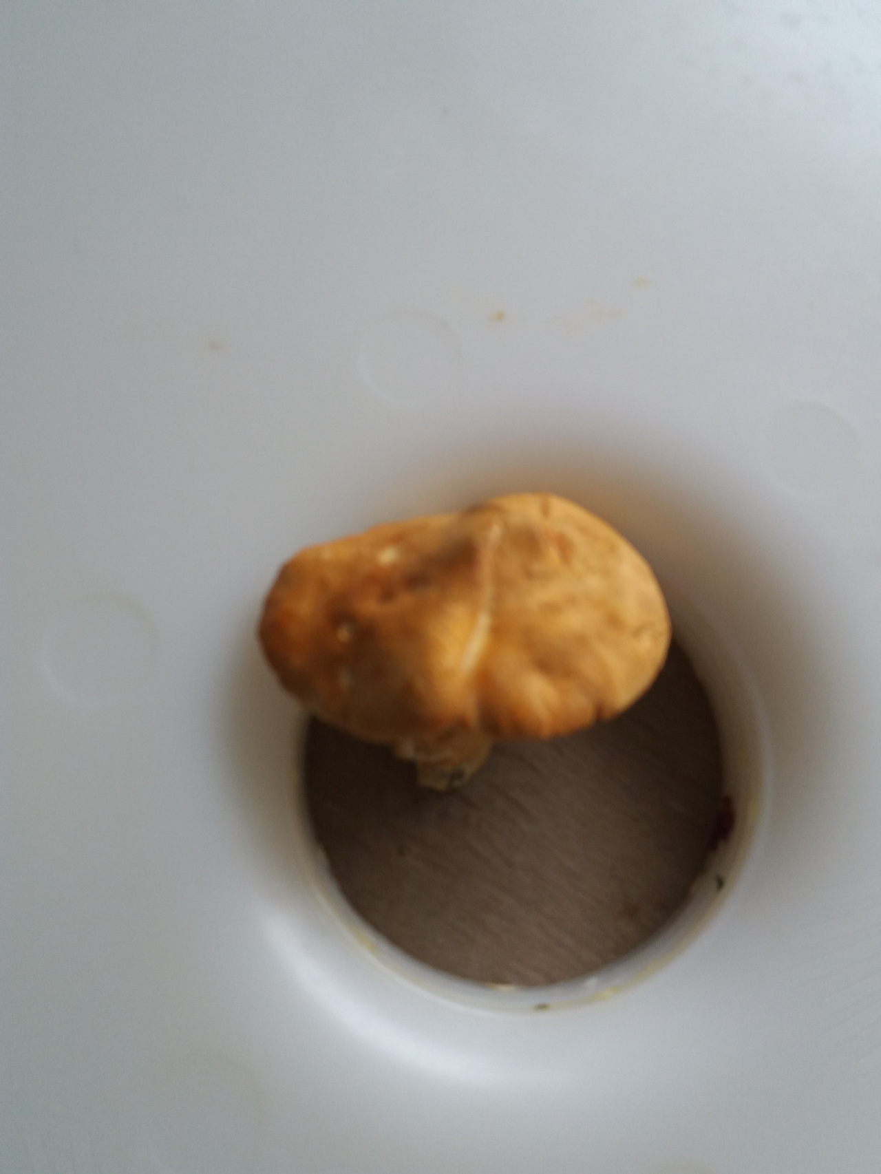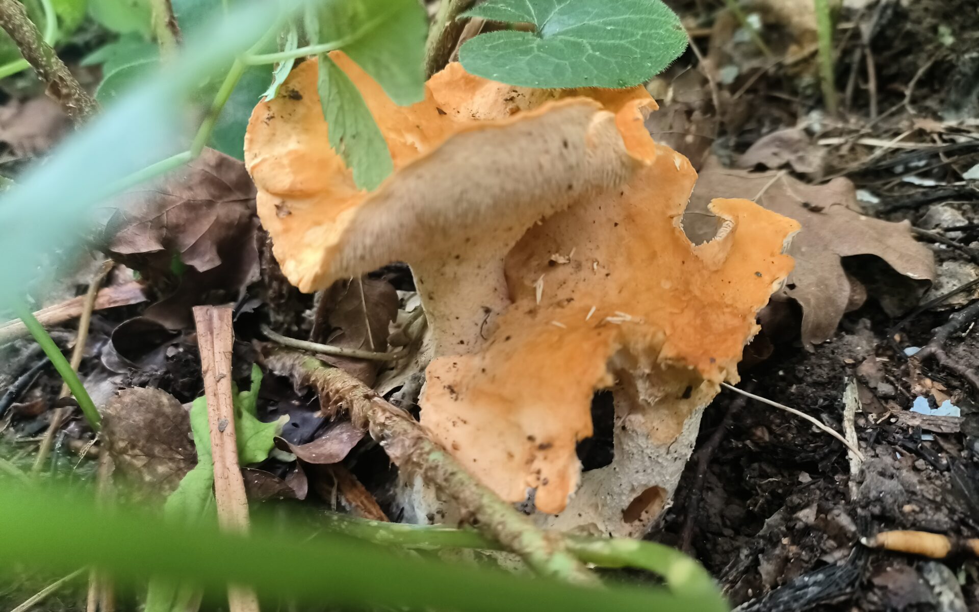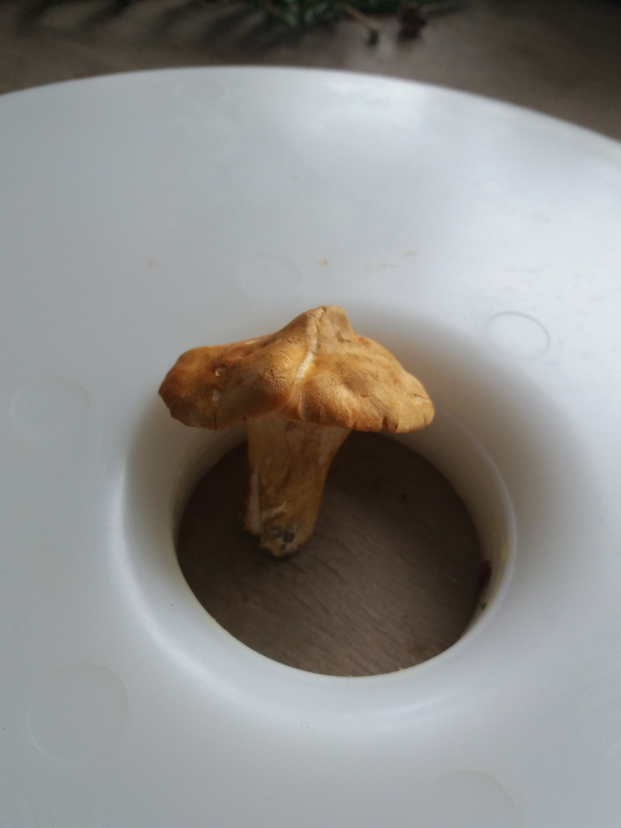 Цвет яркий, похожий на цвет лисички. Отличительной особенностью является гименофор — никогда раньше не видел такого, это не пластинки, не трубочки, а какие-то сосочки или иголочки. Шляпка остроконечная. Запах грибной.