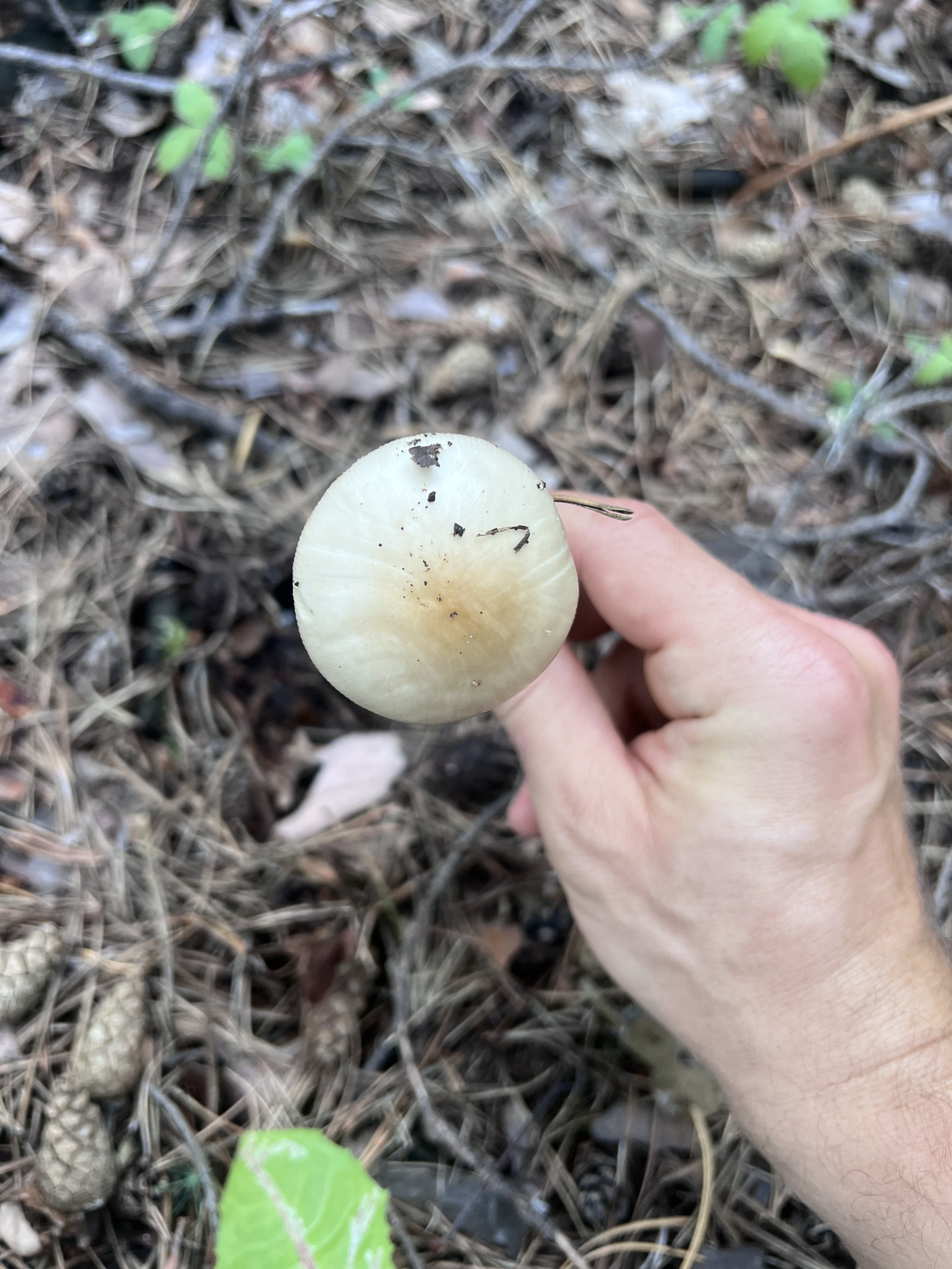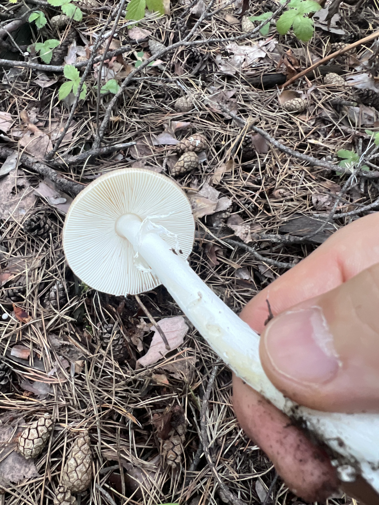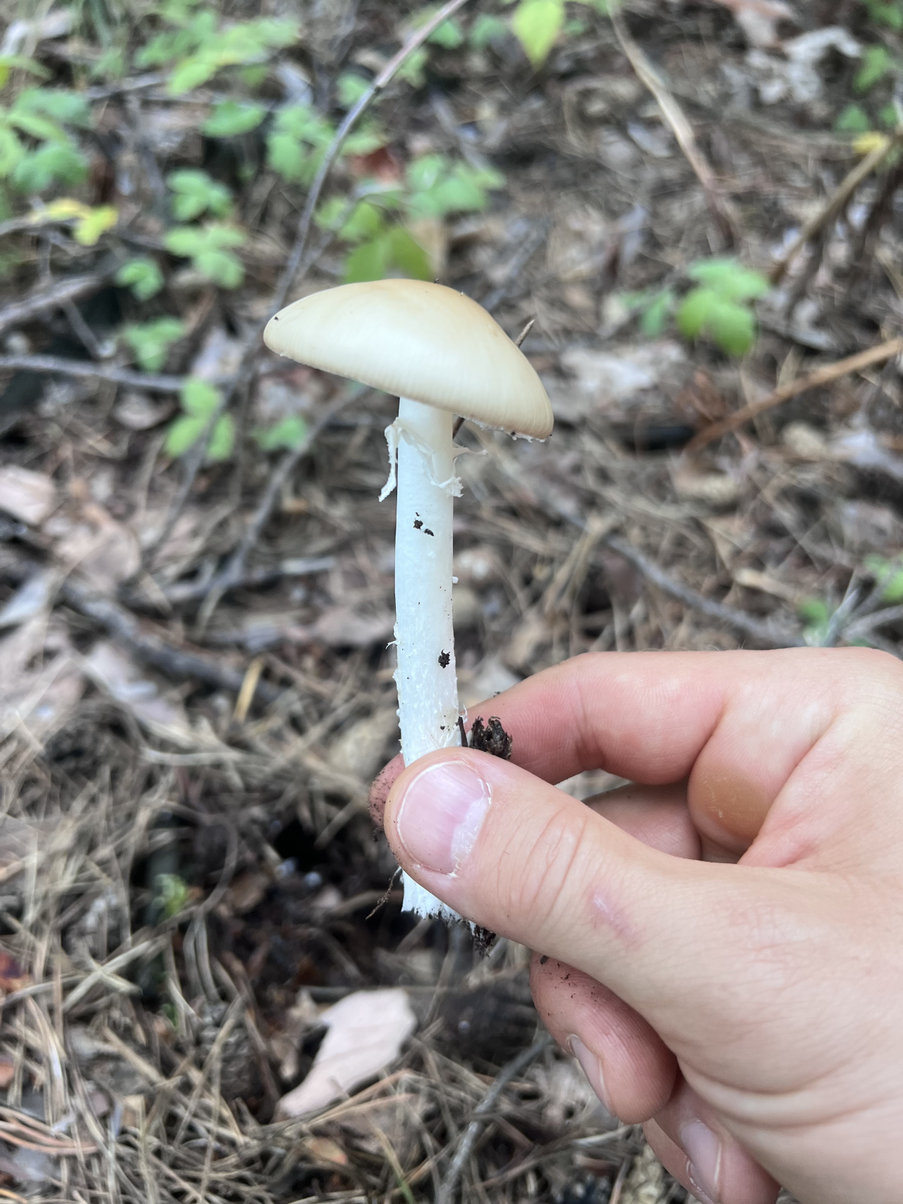 Описание гриба: Мухомор, светло-бежевый. Как будто пантерный, но дождь смыл крапинки и светловат для пантерного. Рос рядом с пантерным.