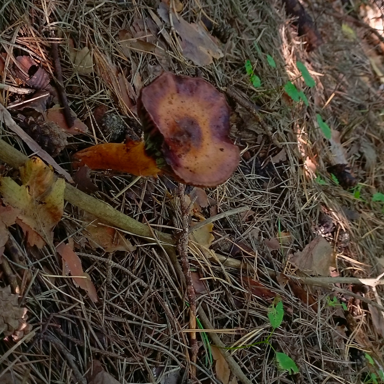 Описание гриба: что это за гриб?? растёт в хвойных лесах. по крайней мере там где я его нашла , были сосны. Трогать и срезать гриб не стала так как вдруг ядовитый , к сожалению только одна фотография.