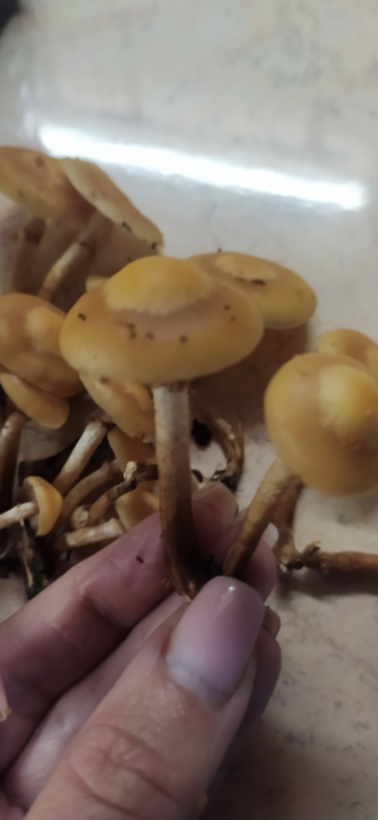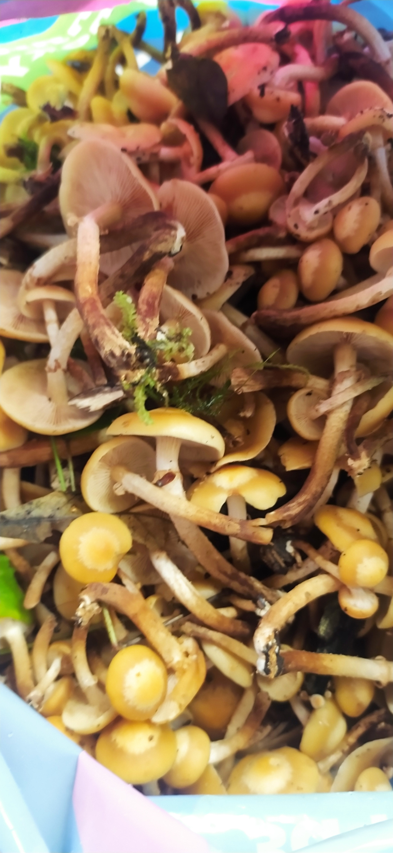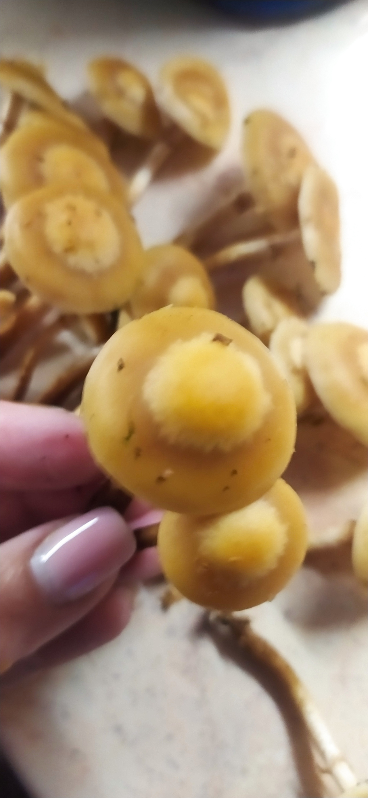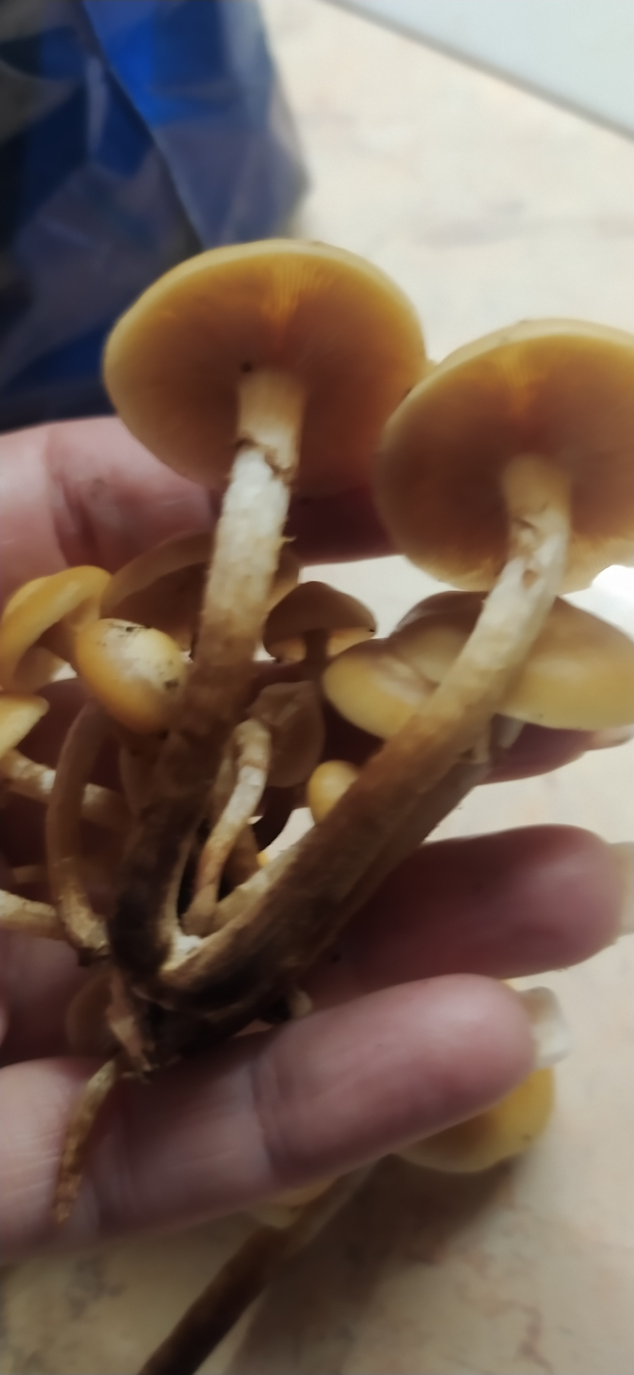 Описание гриба: Собраны в Терлецком лесопарке (Москва) в гуще деревьев. Произростали на поваленой берёзе, облепленна ими со всех сторон, целым семейством, густыми партиями, Ножка чуть изогнута в сторону, как буд то они растут из-по дерева сбоку, чуть огибая его, срывались сразу по несколько штук, как буд то бы скреплены между собой в небольшие пучки. Шляпки небольшие тëмно бежевого цвета или приглушëнно грязно светло оранжевые с жëлтым кругом в середине. Запах свежий, грибной, приятный. С дерева собрано пол полиэтиленового пакета с ручками.