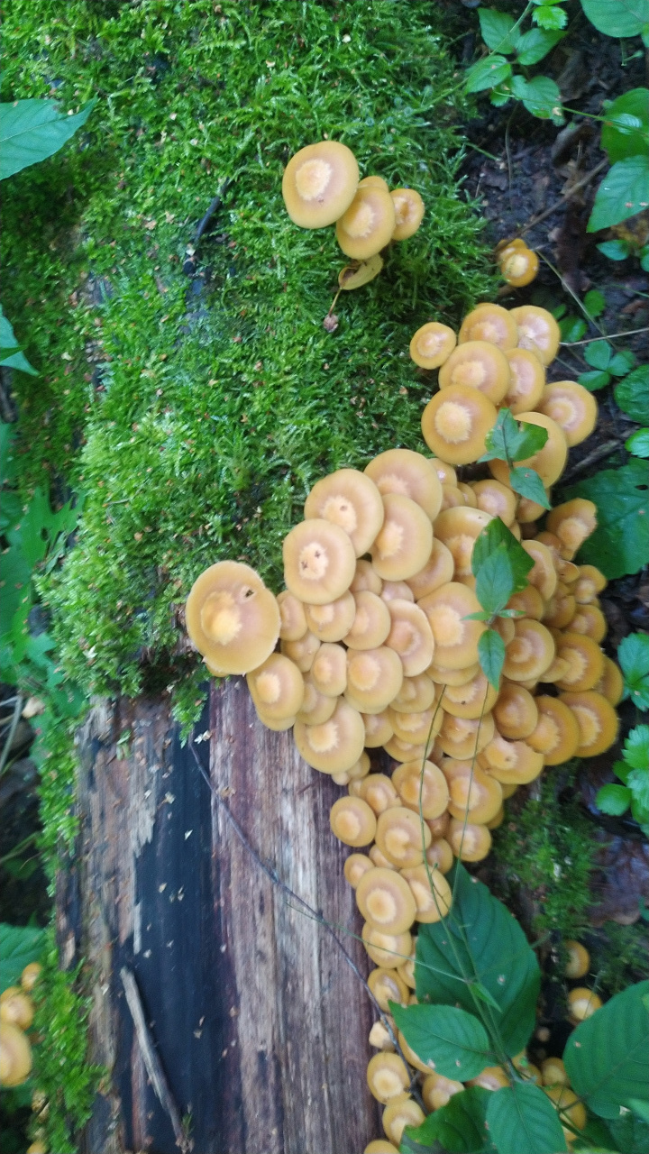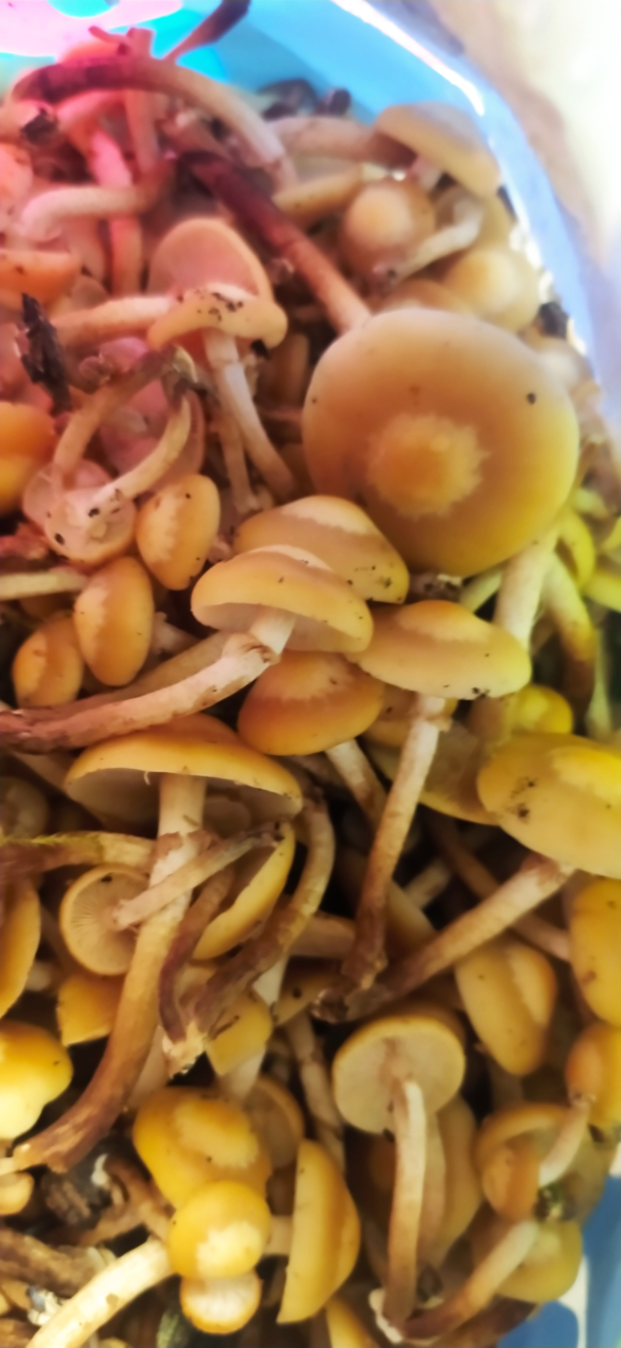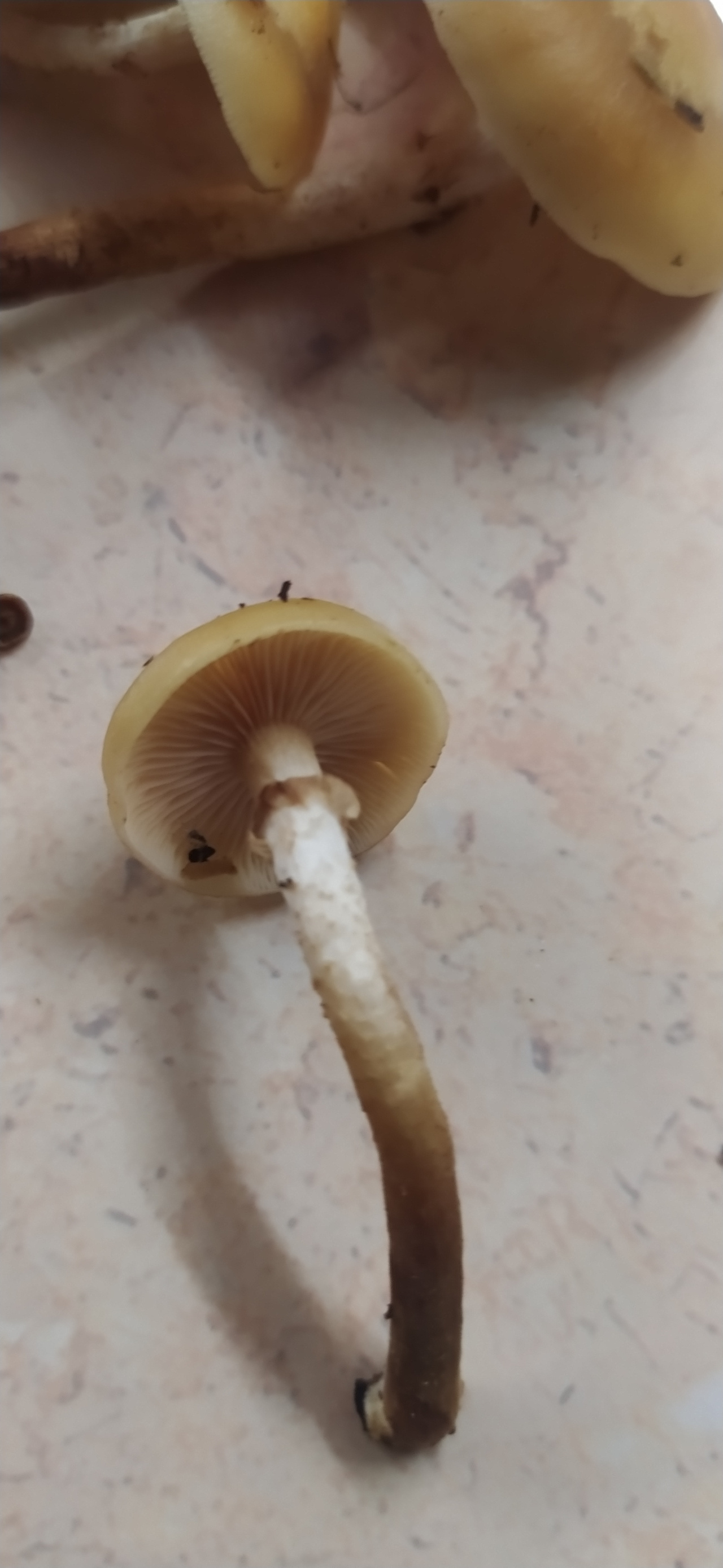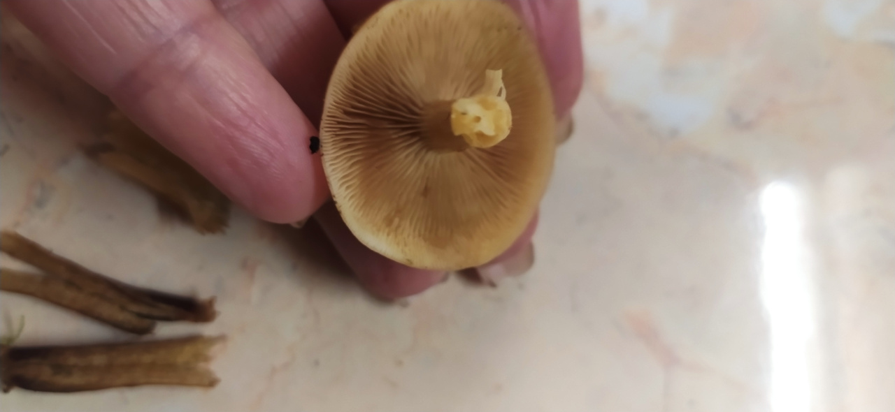 Описание гриба: Собраны в Терлецком лесопарке (Москва) в гуще деревьев. Произростали на поваленой берёзе, облепленна ими со всех сторон, целым семейством, густыми партиями, Ножка чуть изогнута в сторону, как буд то они растут из-по дерева сбоку, чуть огибая его, срывались сразу по несколько штук, как буд то бы скреплены между собой в небольшие пучки. Шляпки небольшие тëмно бежевого цвета или приглушëнно грязно светло оранжевые с жëлтым кругом в середине. Запах свежий, грибной, приятный. С дерева собрано пол полиэтиленового пакета с ручками.