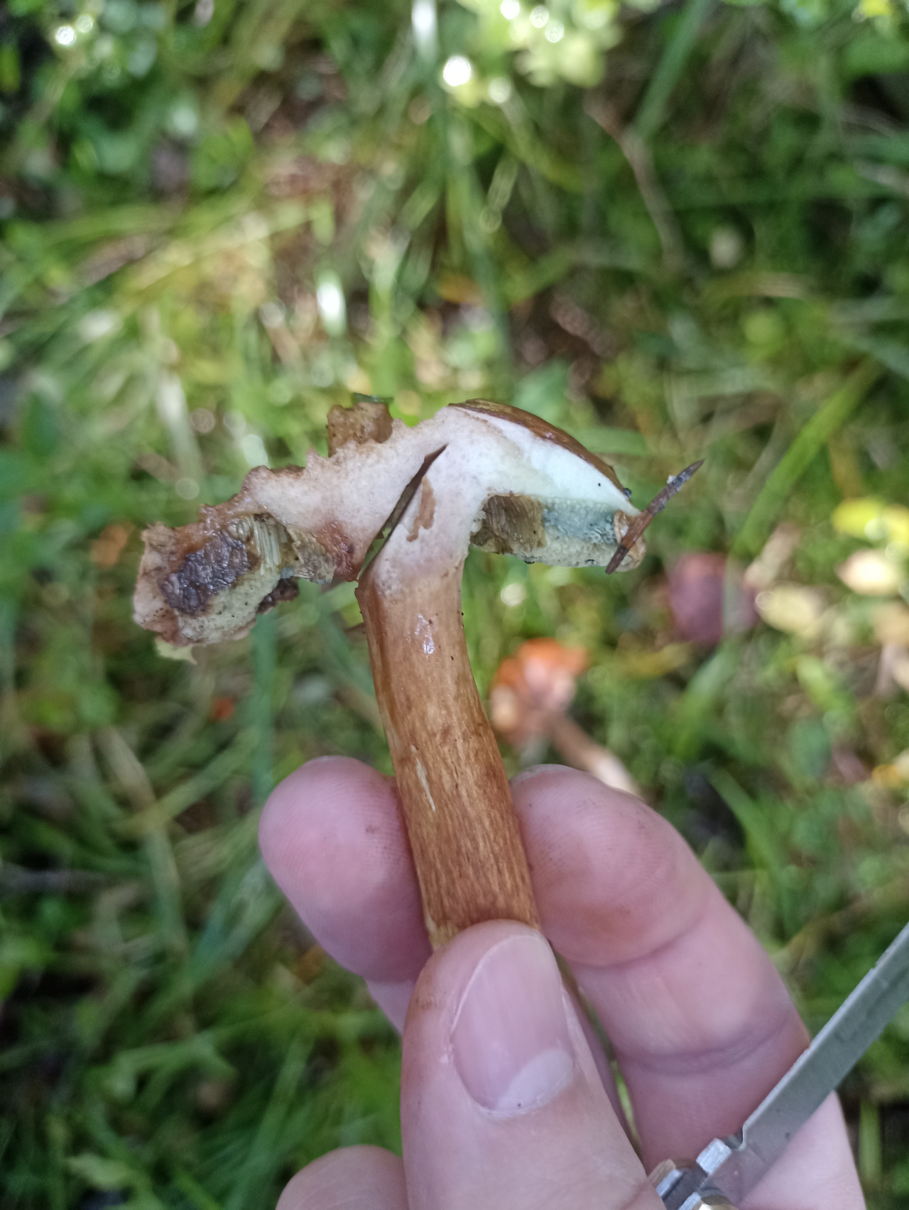 Описание гриба: Растут группой на пяточке, при надавливании на шляпку синеют, при срезе цвет ножки не меняется