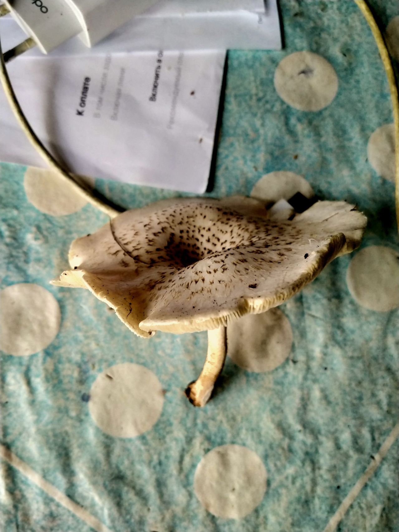Описание гриба: Гриб белого или сливочного цвета пластинчатый с чешуйками на шляпке и большим углублением в центре шляпки на тонкой ножке