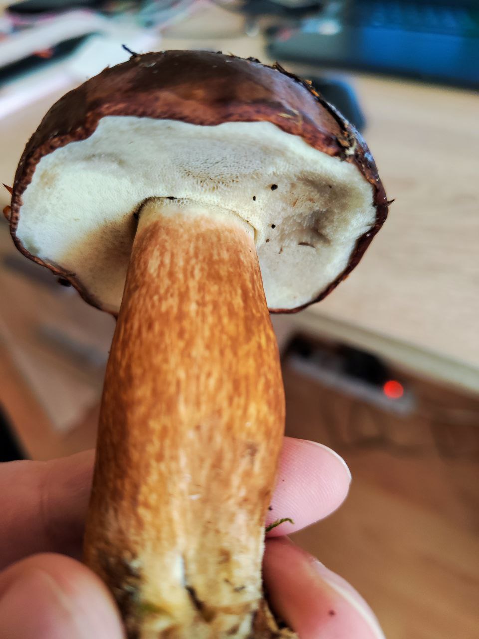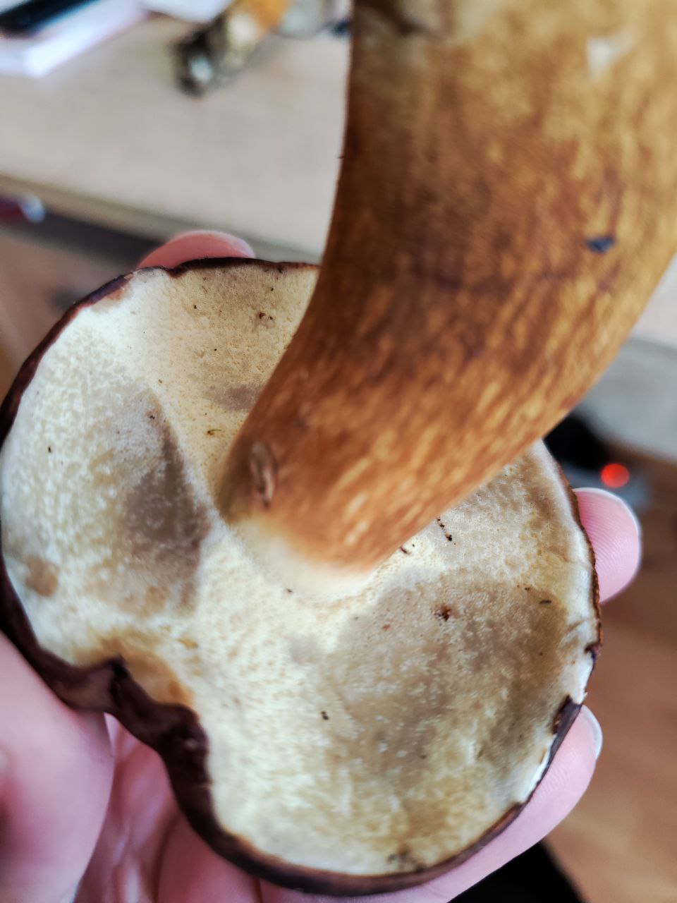 Описание гриба: Трибы похожи на белые, но это не они, точно. Запах приятный, цвета на срезе не знаю, никогда их не срезаю. При нажатии под шляпкой цвет меняется с жёлтого на зеленоватый.