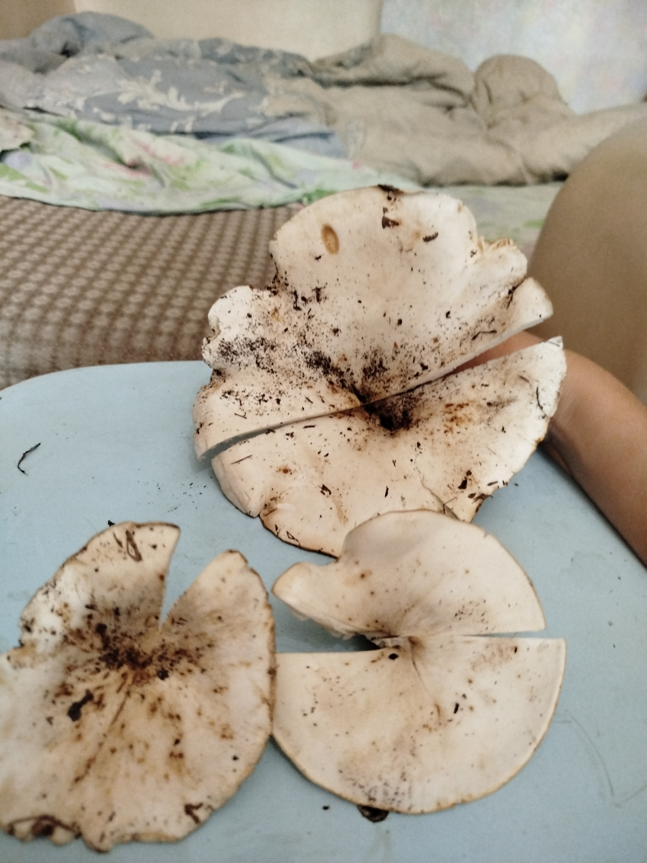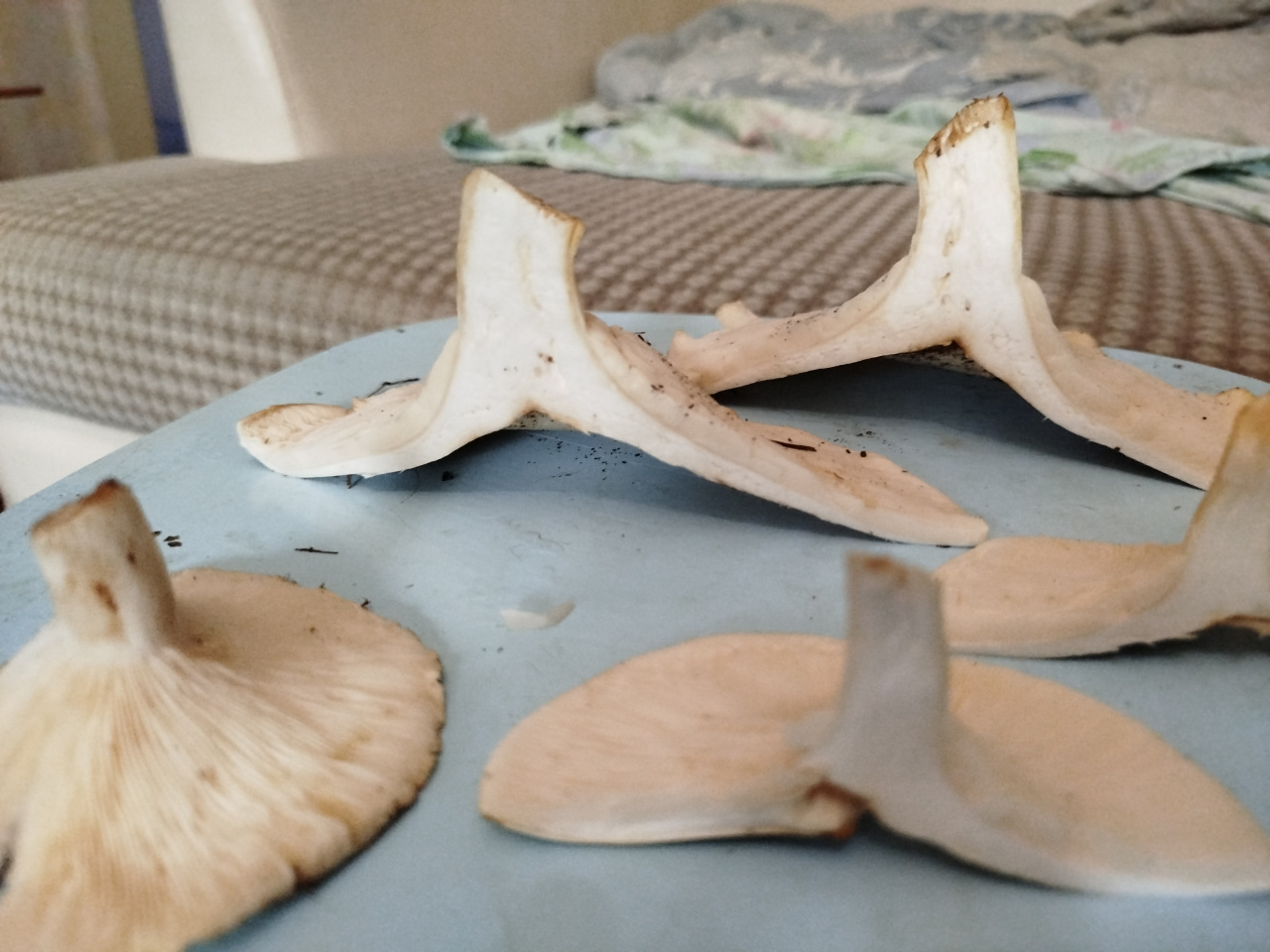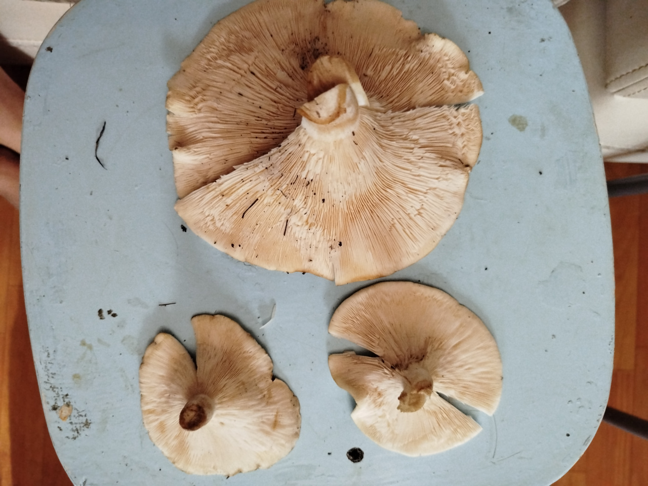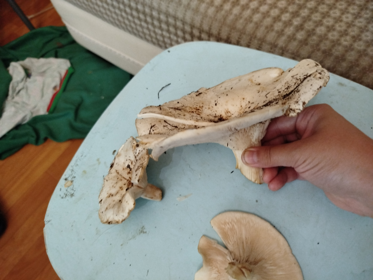 Описание гриба: Запах грибной, скорее мучнистый. Собрано в подлеске, скорее хвойный, чем смешанный. Вокруг сосны, кусты, высокая трава. Гриб цвет не меняет. Сок не выделяется. Мякоть плотная. Росли большой плотной поляной от маленьких(5см) до больших(25 см)