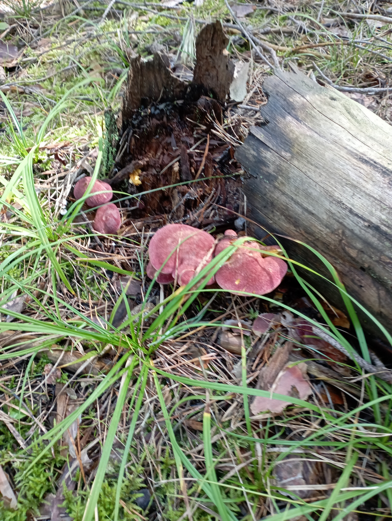 Описание гриба: Здравствуйте,мох,трава, пенёк. Шляпка шершавая.