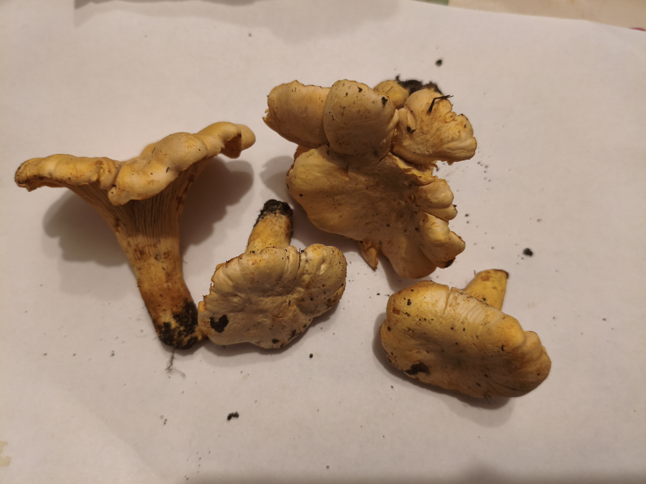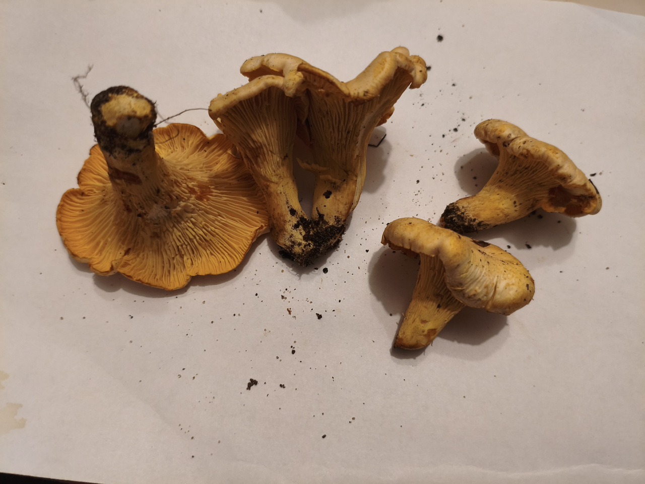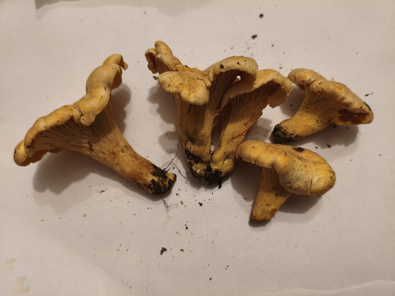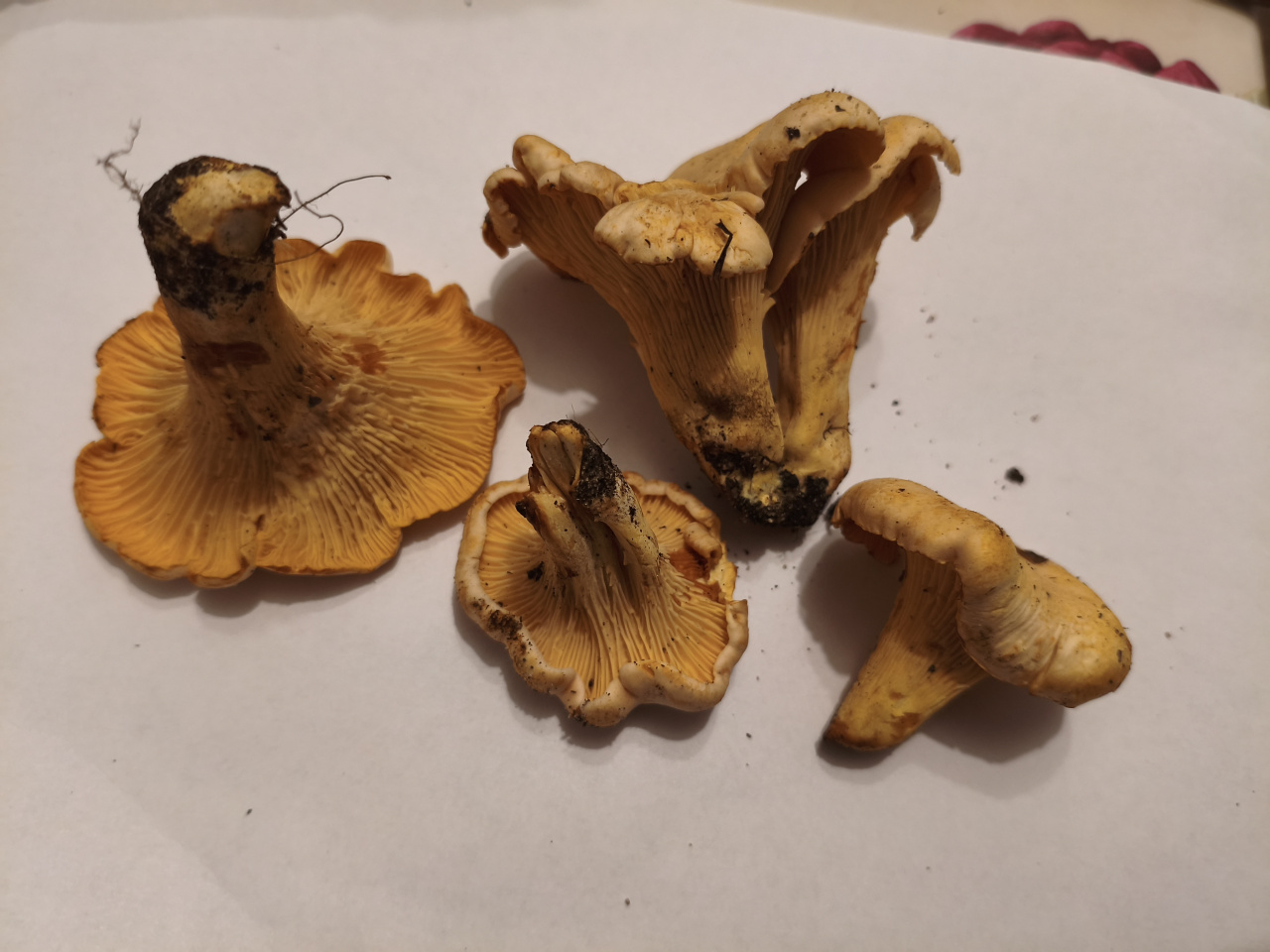 Обычные лисички. Возможно, часть из них бледные — это разновидность жёлтой лисички. Абсолютно съедобны.