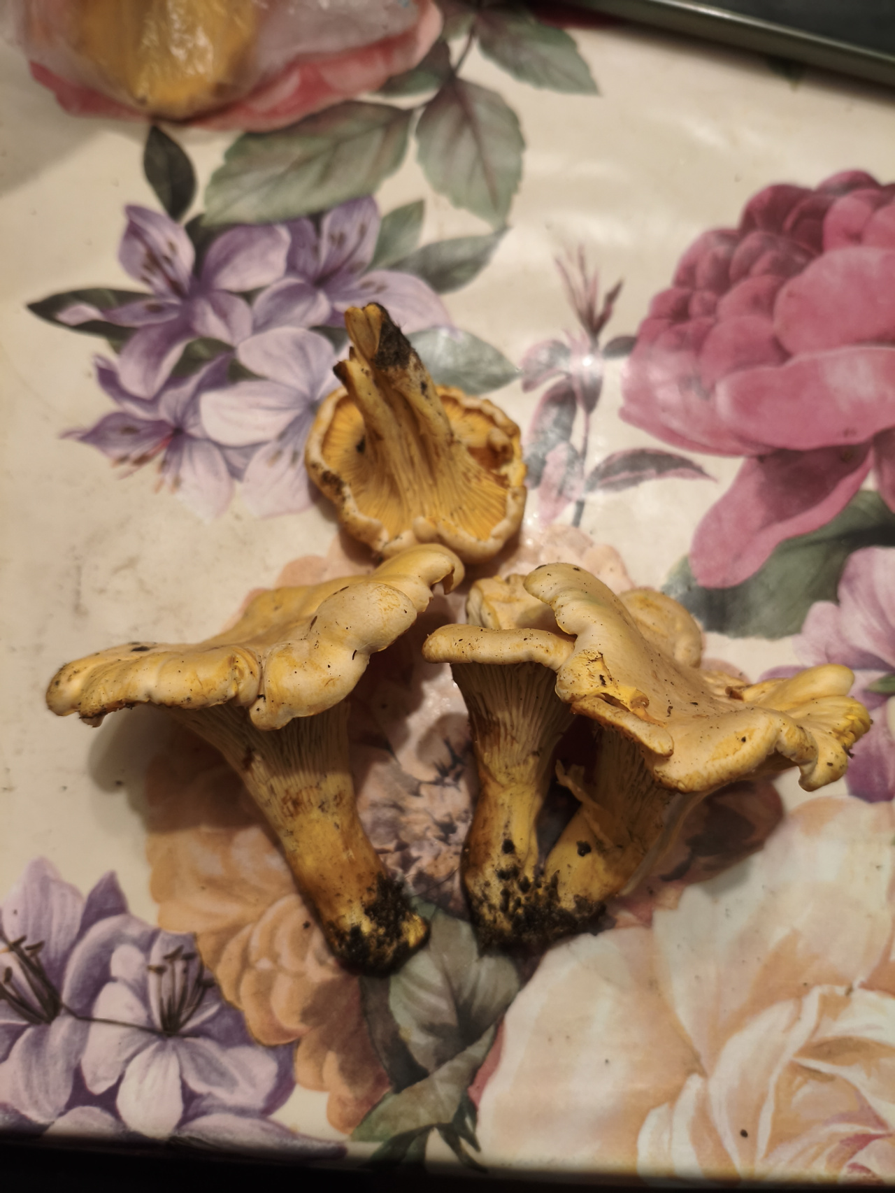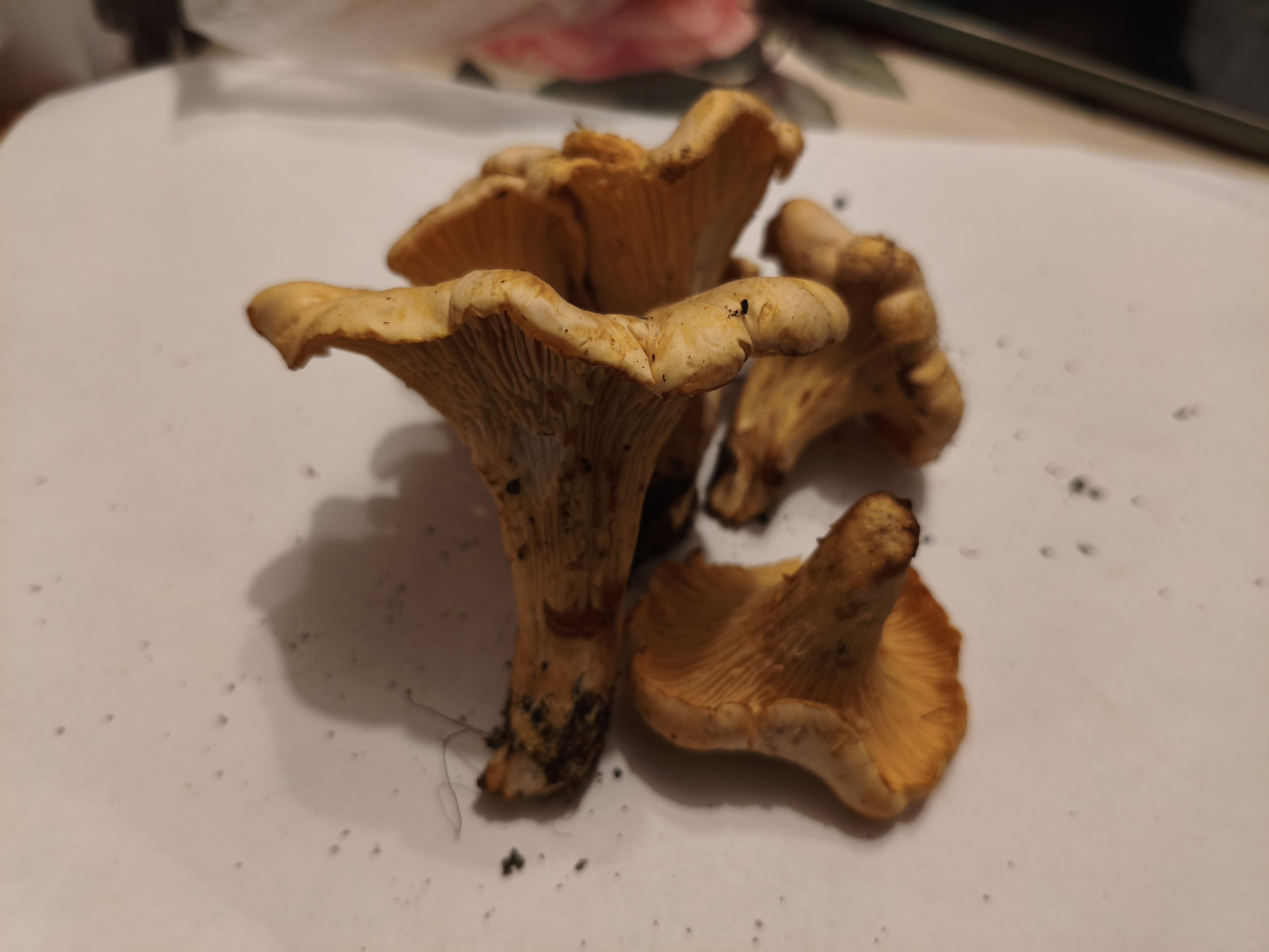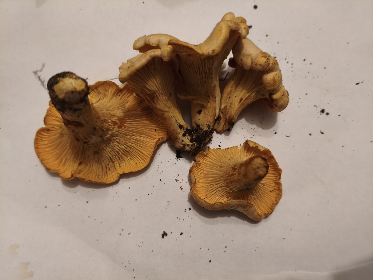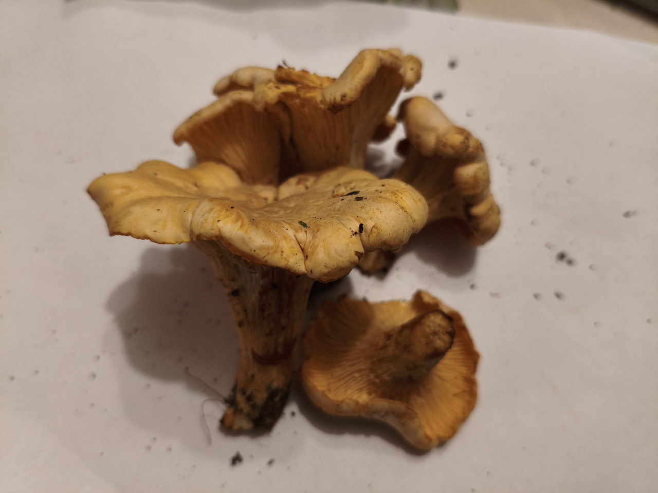 Обычные лисички. Возможно, часть из них бледные — это разновидность жёлтой лисички. Абсолютно съедобны.