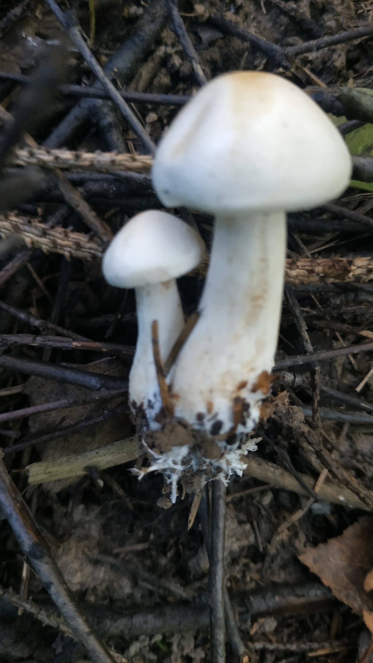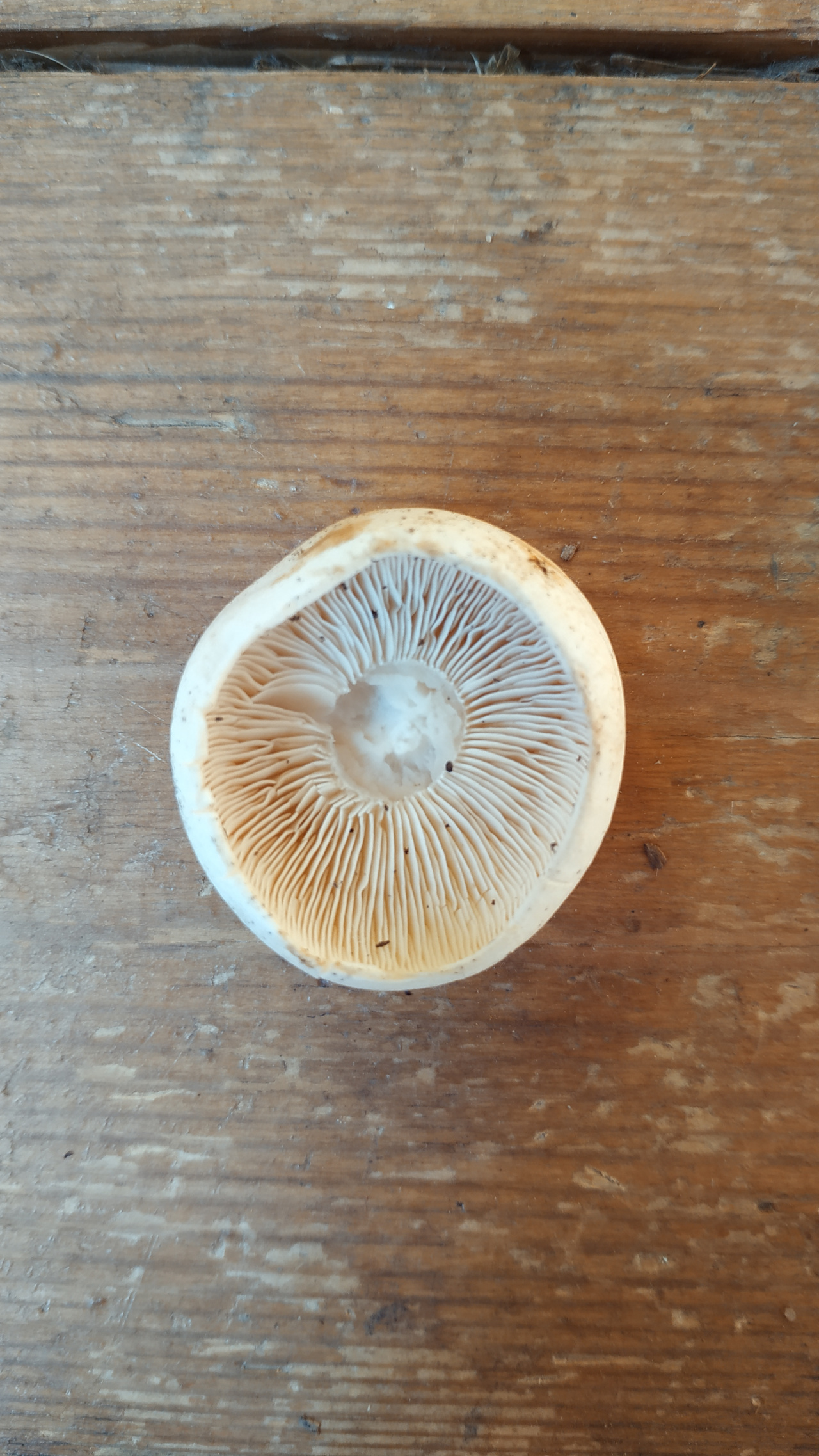 Описание гриба: Лес, недалеко от дороги, в основном ели и березы. Грибов много, мелкие, растут в основном кучками по 2-5 штук. Размеры от 3см до 7см в высоту, видно что грибы недавно вылезли, чистые. На срезе в области шляпки светло розоватый цвет. Запах приятный, грибной, но не ярко выраженный. Недалеко от этой поляны мелких грибов нашел взрослые классические шампики с сиреневыми пластинками и кольцом.