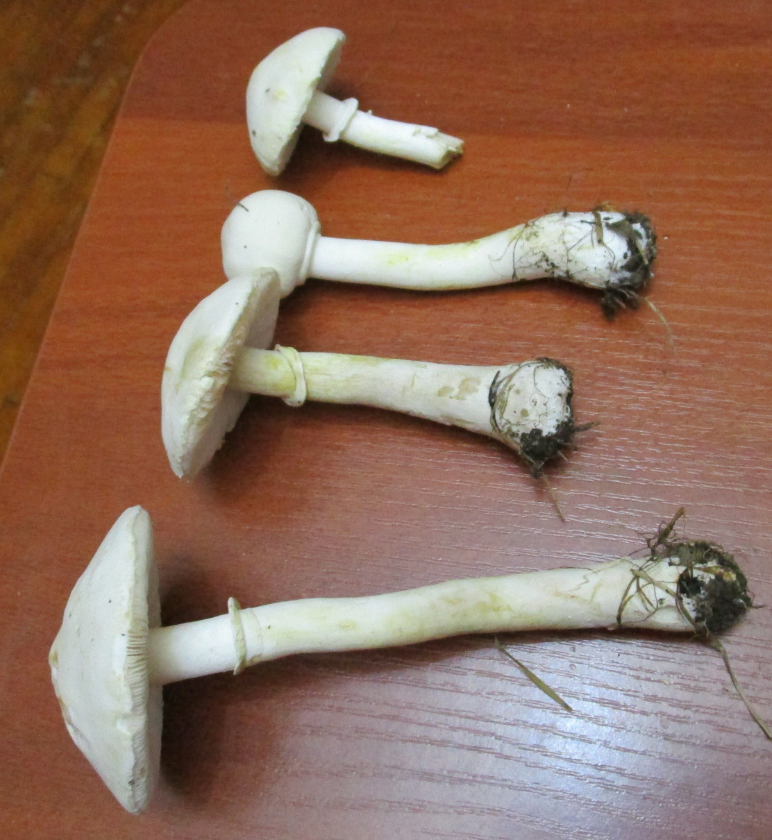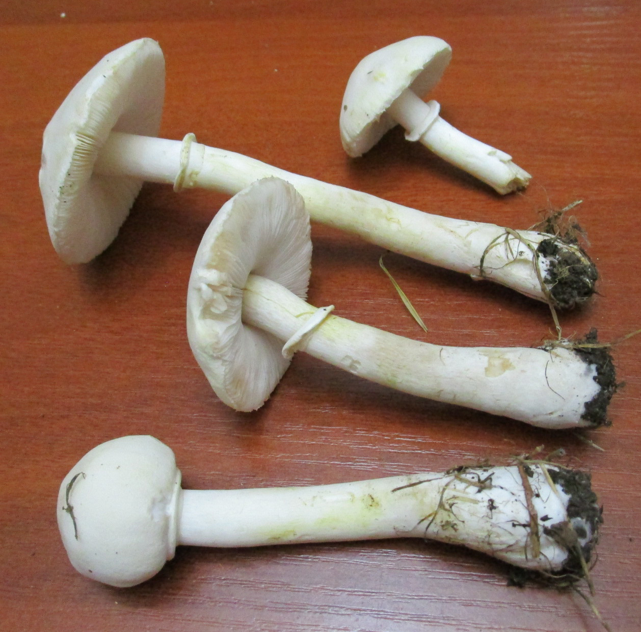 Описание гриба: Что за грибы? Шампиньоны или Бледные поганки? Нашла в парке, недалеко от ёлки. Не похожи на шампиньоны, которые я обычно собираю. Снизу вольвы не было.