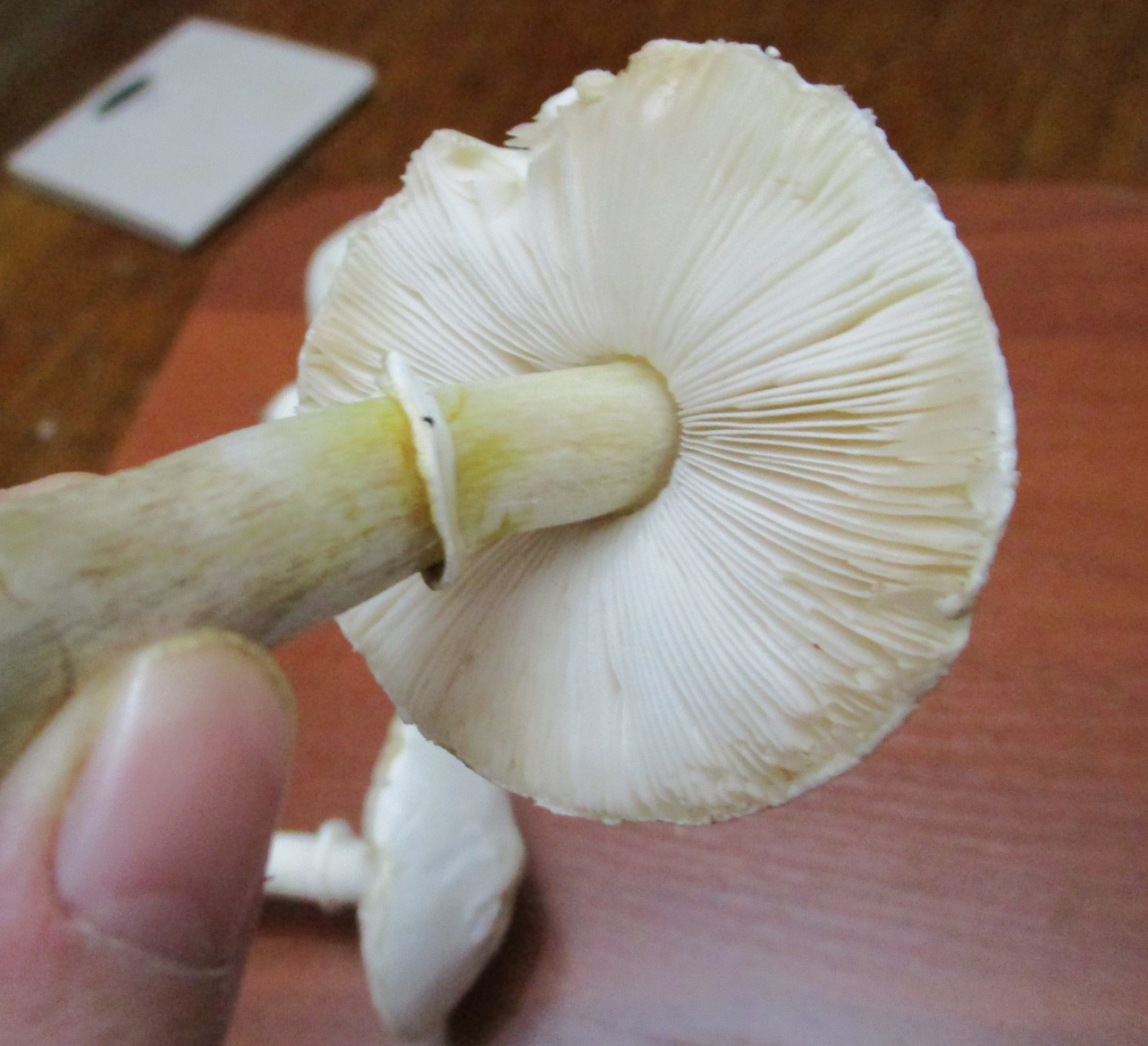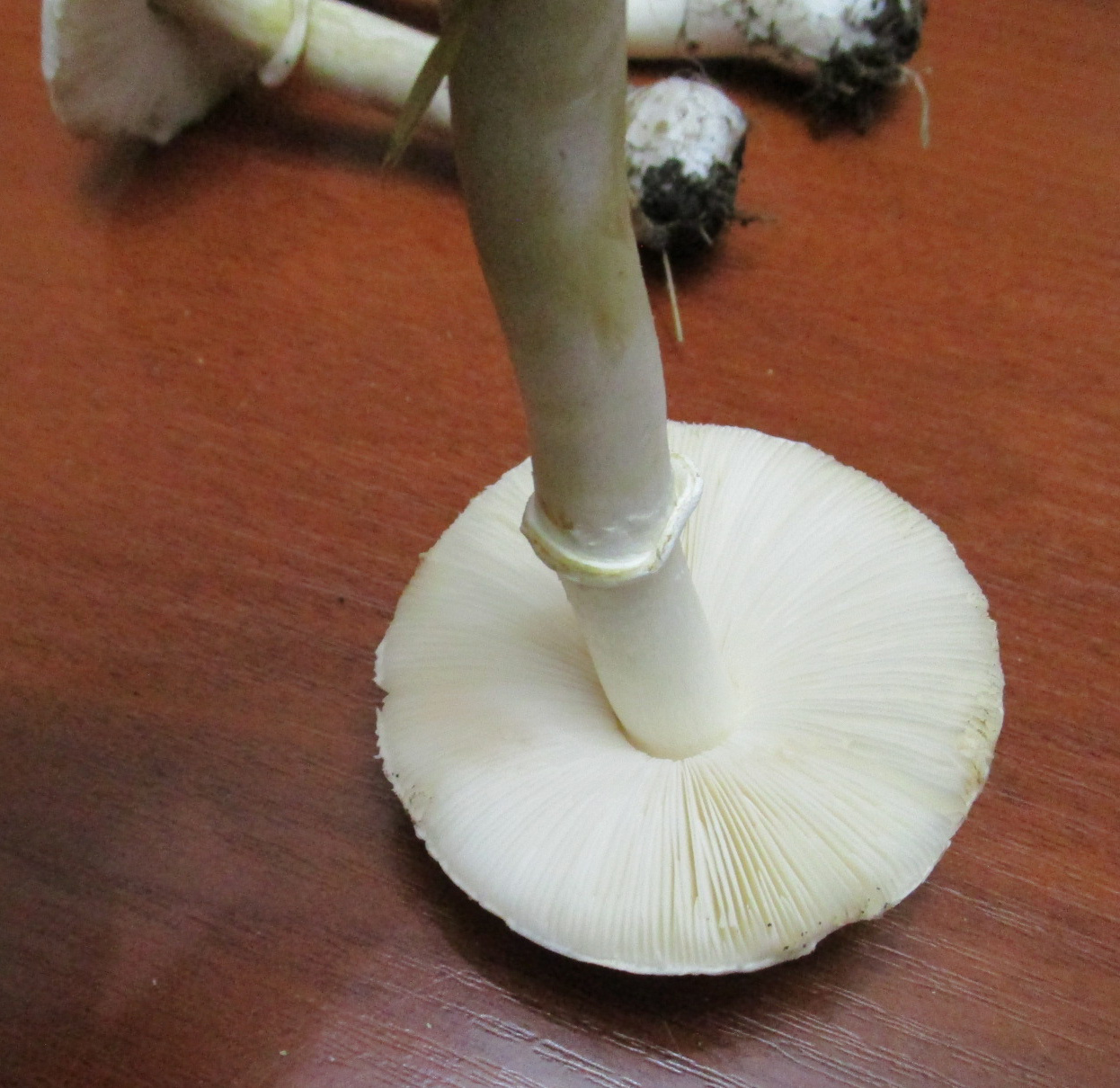 Если вольвы не было, то белошампиньон краснопластинчатый, хотя ножка длинновата для него. Не ешьте, чтобы не рисковать.