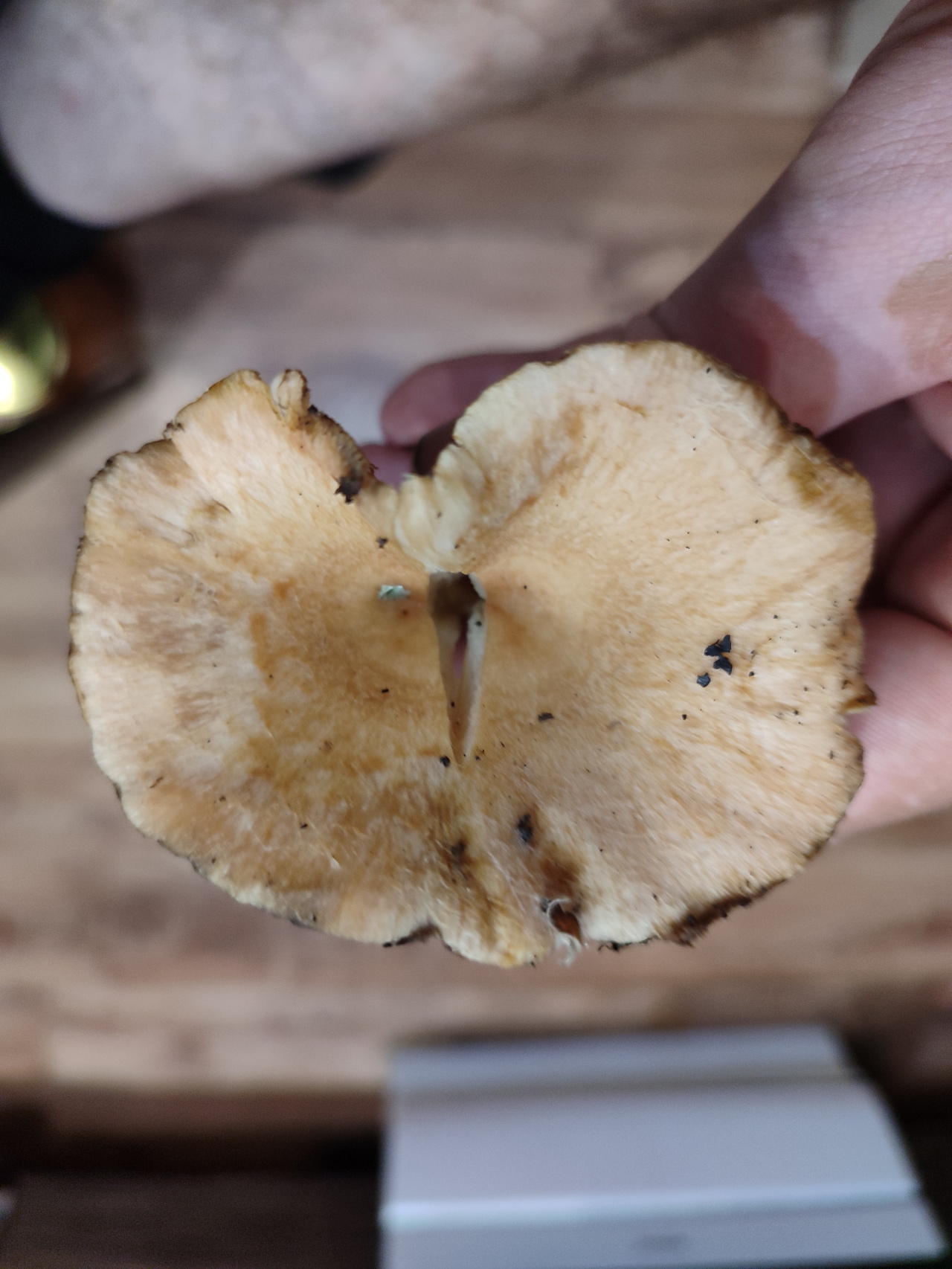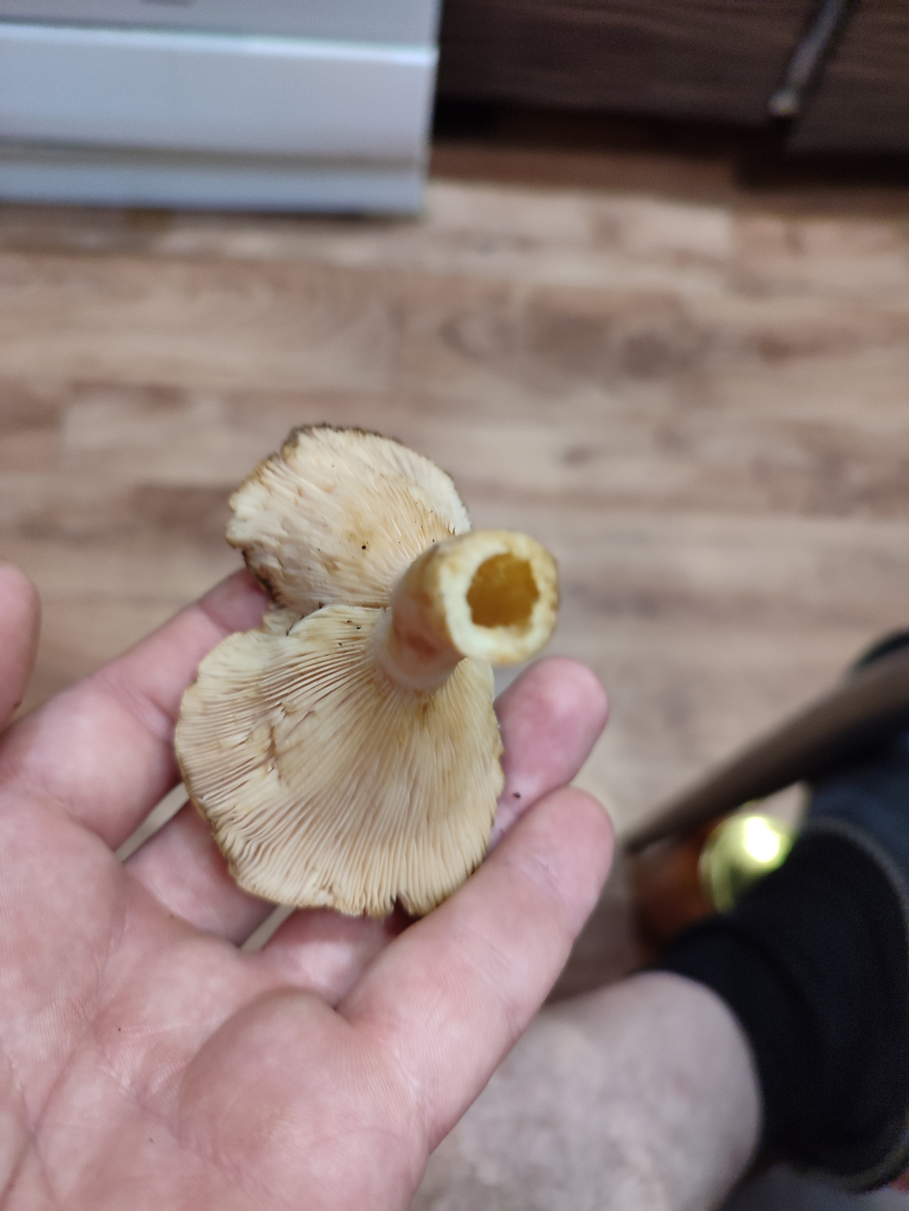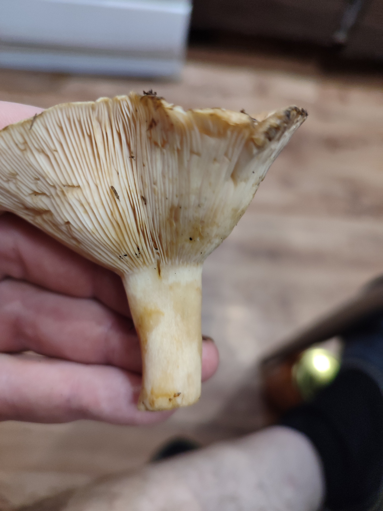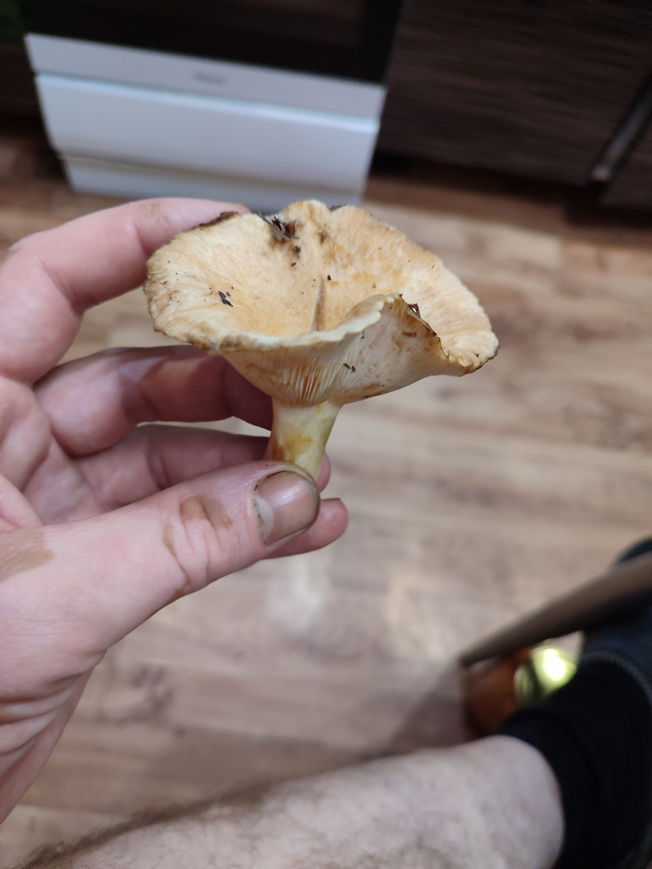 Описание гриба: Пластинчатый светло оранжевого цвета гриб, шляпка с небольшими ворсинками, на срезе шляпки выделяет немного Млечного сока белого цвета, сок цвет не меняет со времянем. Растет в березовом лесу.