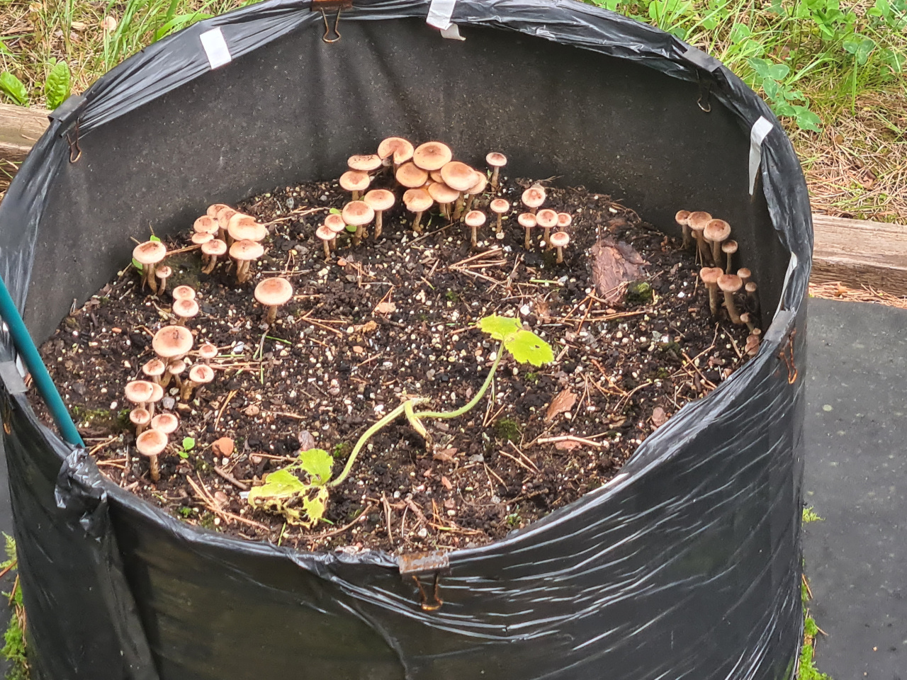 Описание гриба: Выросли в габионах, где высаживала ранее кабачки, цветы. Грунт — вн зу всякие ветки, сверху садовая земля.