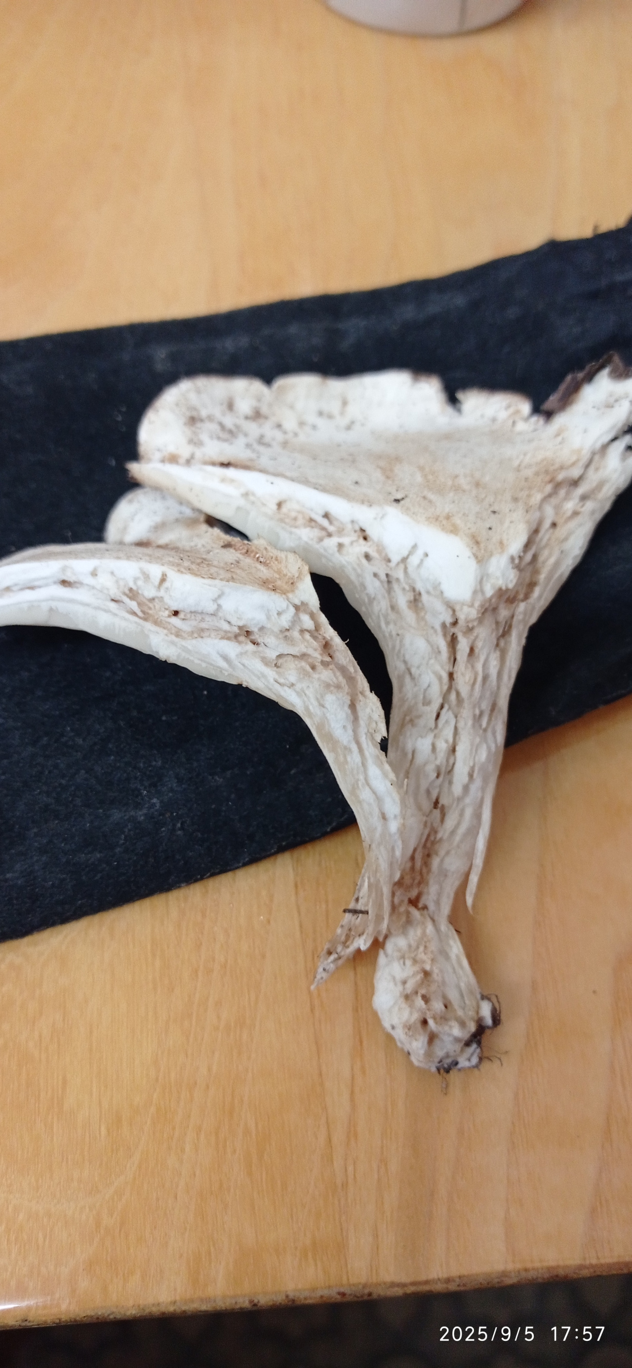 Шляпка диаметр до 15-18 см. Пластинки низбегающие. Ножка полая, волокнистая