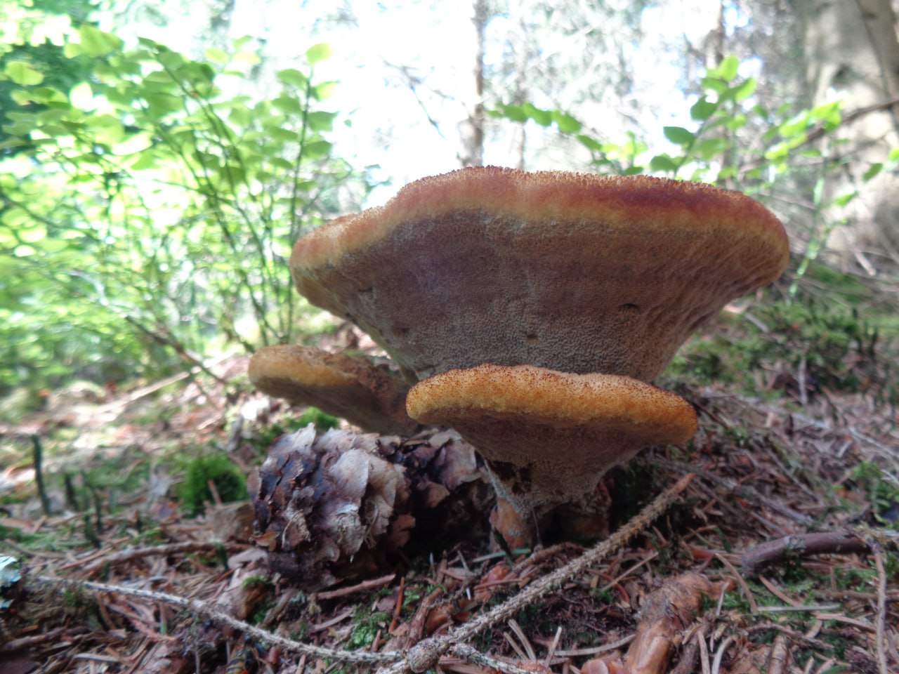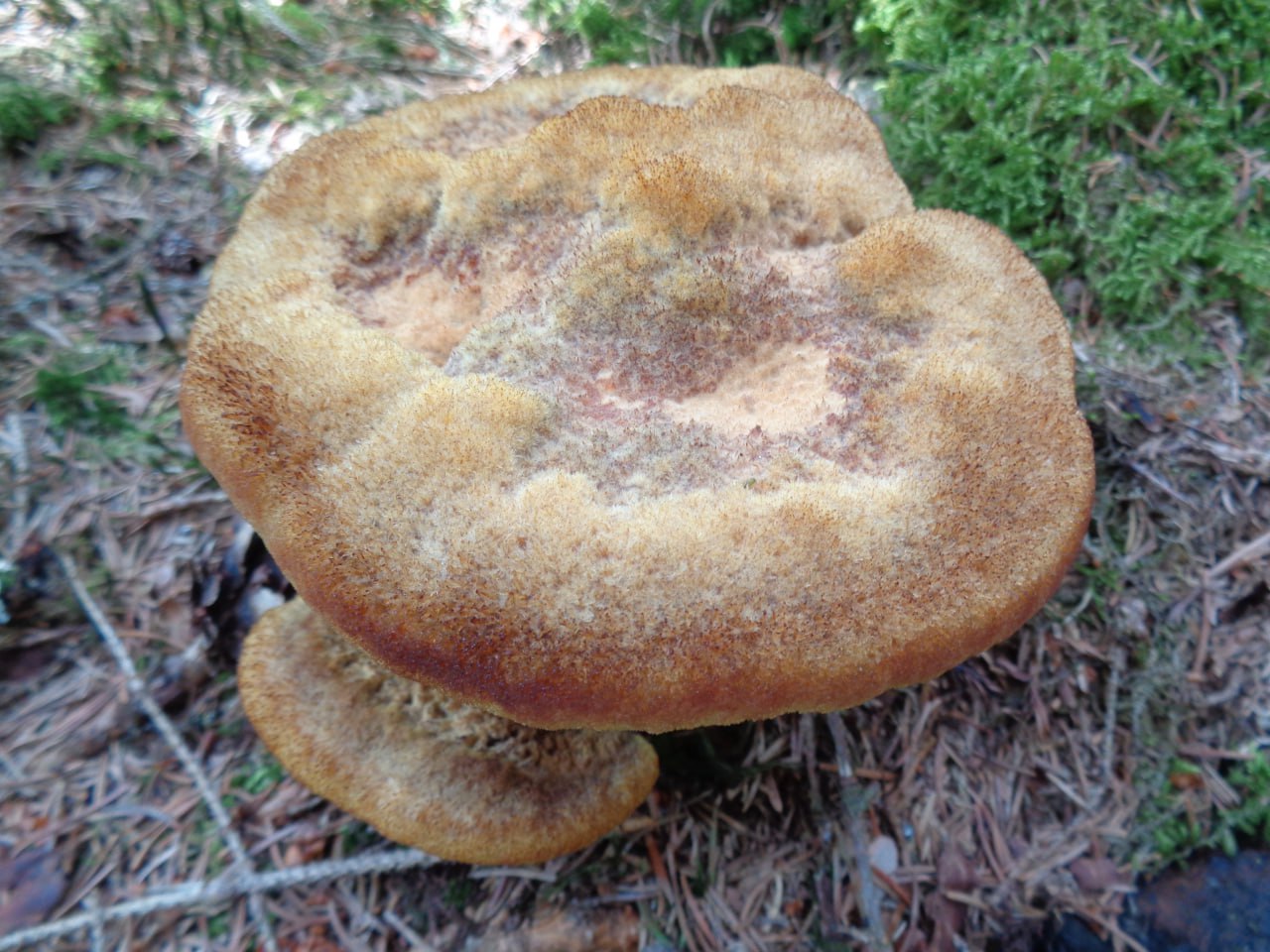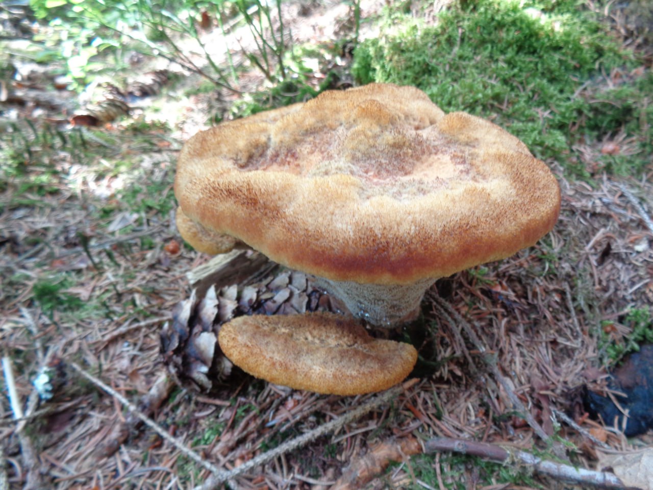 Описание гриба: Бархатистый коричневый гриб размером примерно 20 см.