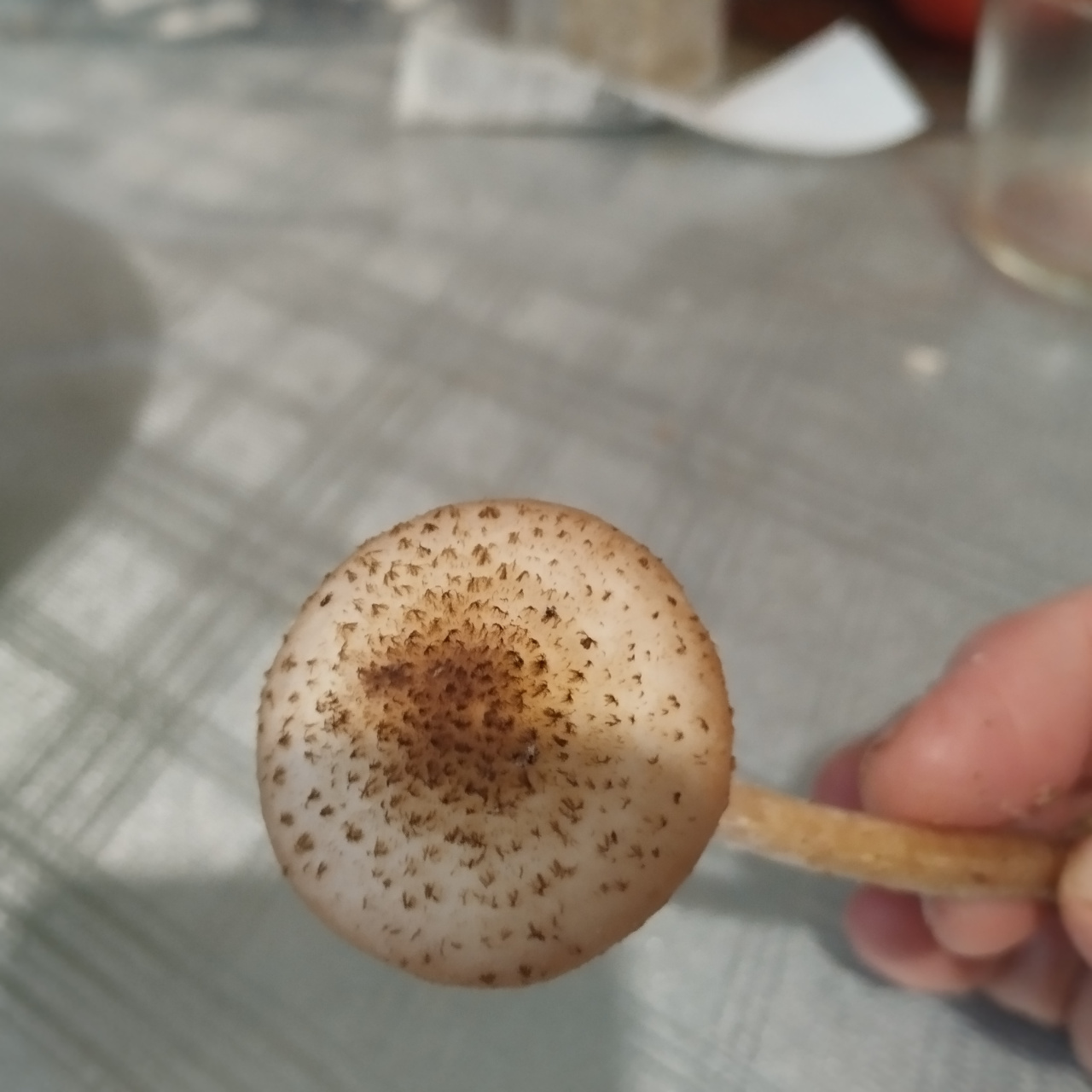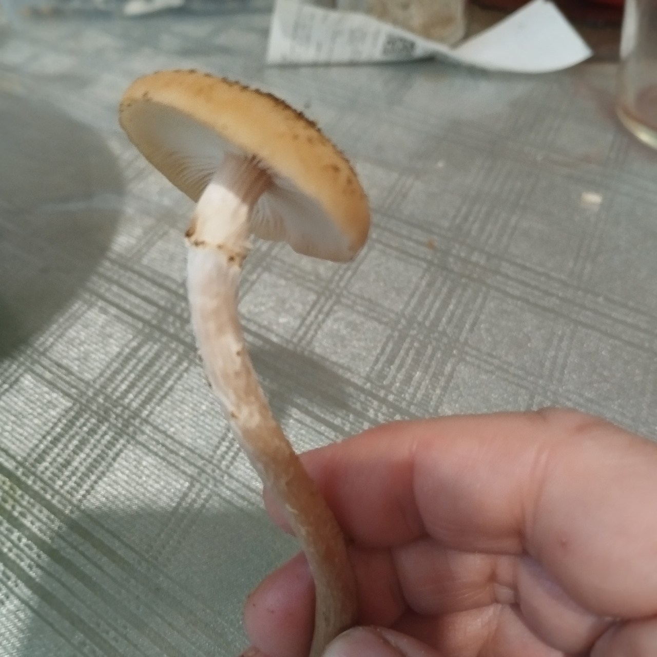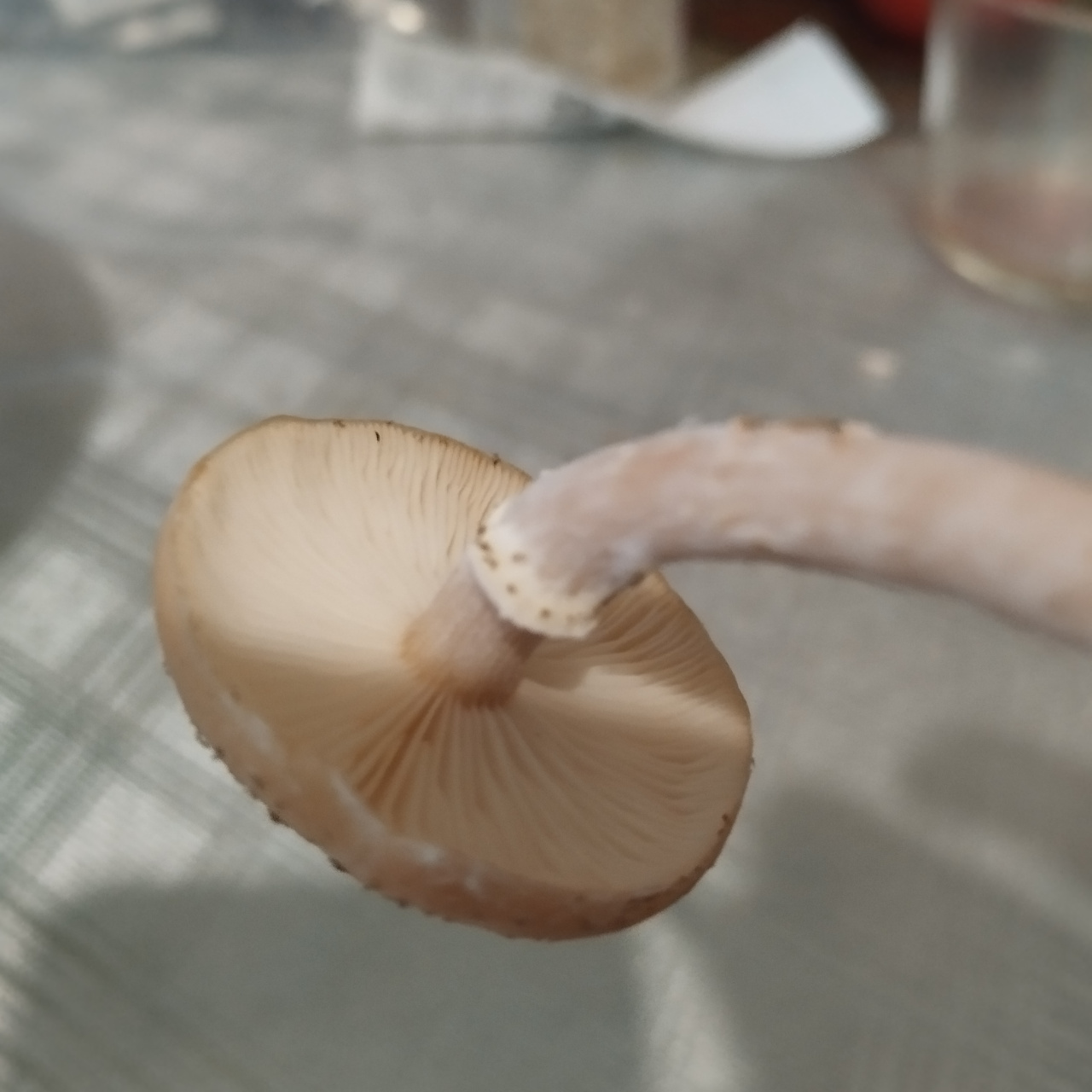 Описание гриба: Бежевого цвета с конапушками на шляпке ,юбка под шляпой ,рос на пне семейкой