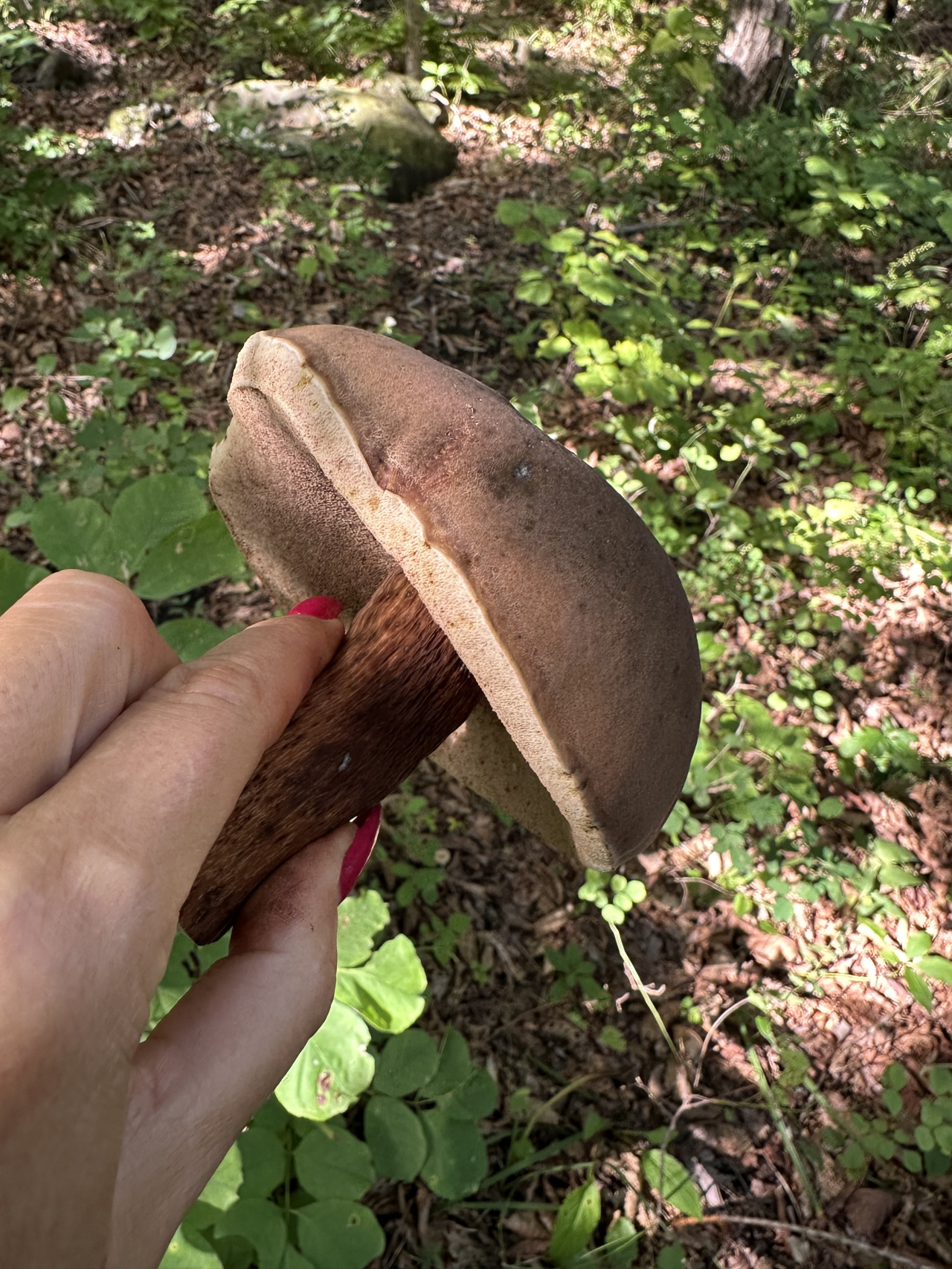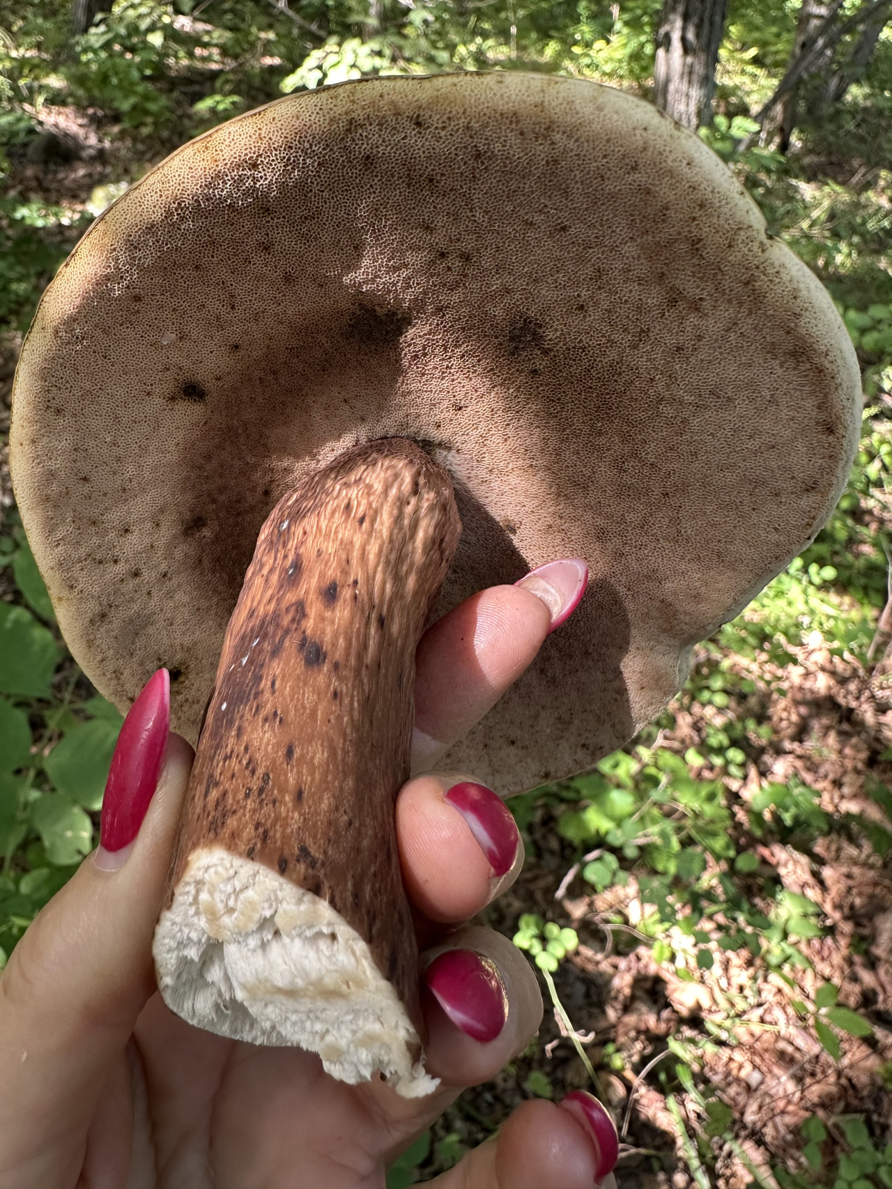 Описание гриба: Темно-коричневая шляпка, светлая нижняя, трубчатая часть, ножка толстая, темноватая
