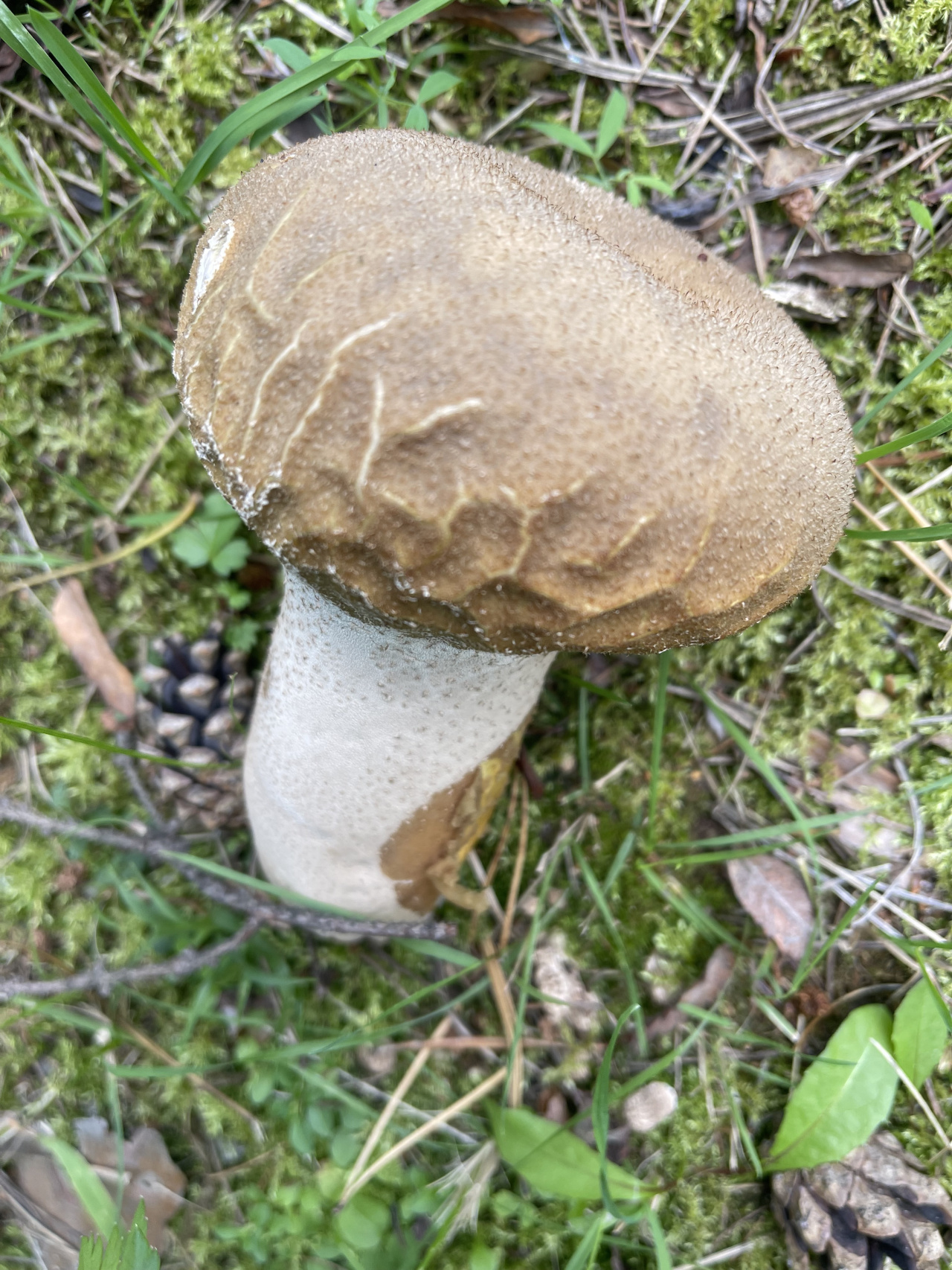 Похож на какой-то из дождевиков, но уже переросток. В любом случае не съедобен