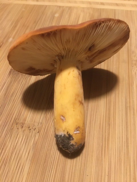 Описание гриба: Смешанный лес, гриб без запаха, белый млечный сок, пластинки белые, становятся коричневыми после надавливания, ножка плотная, без полости.