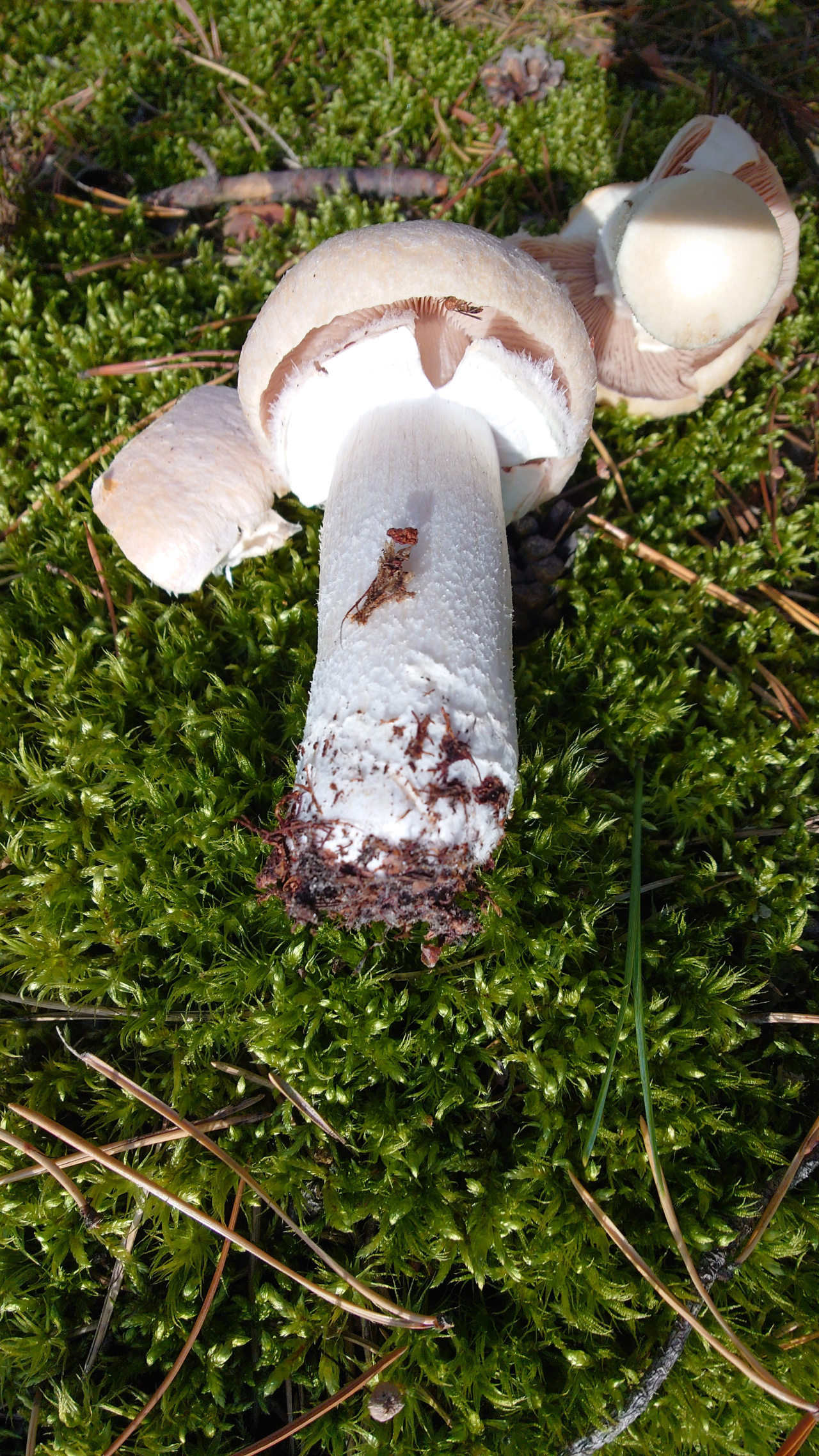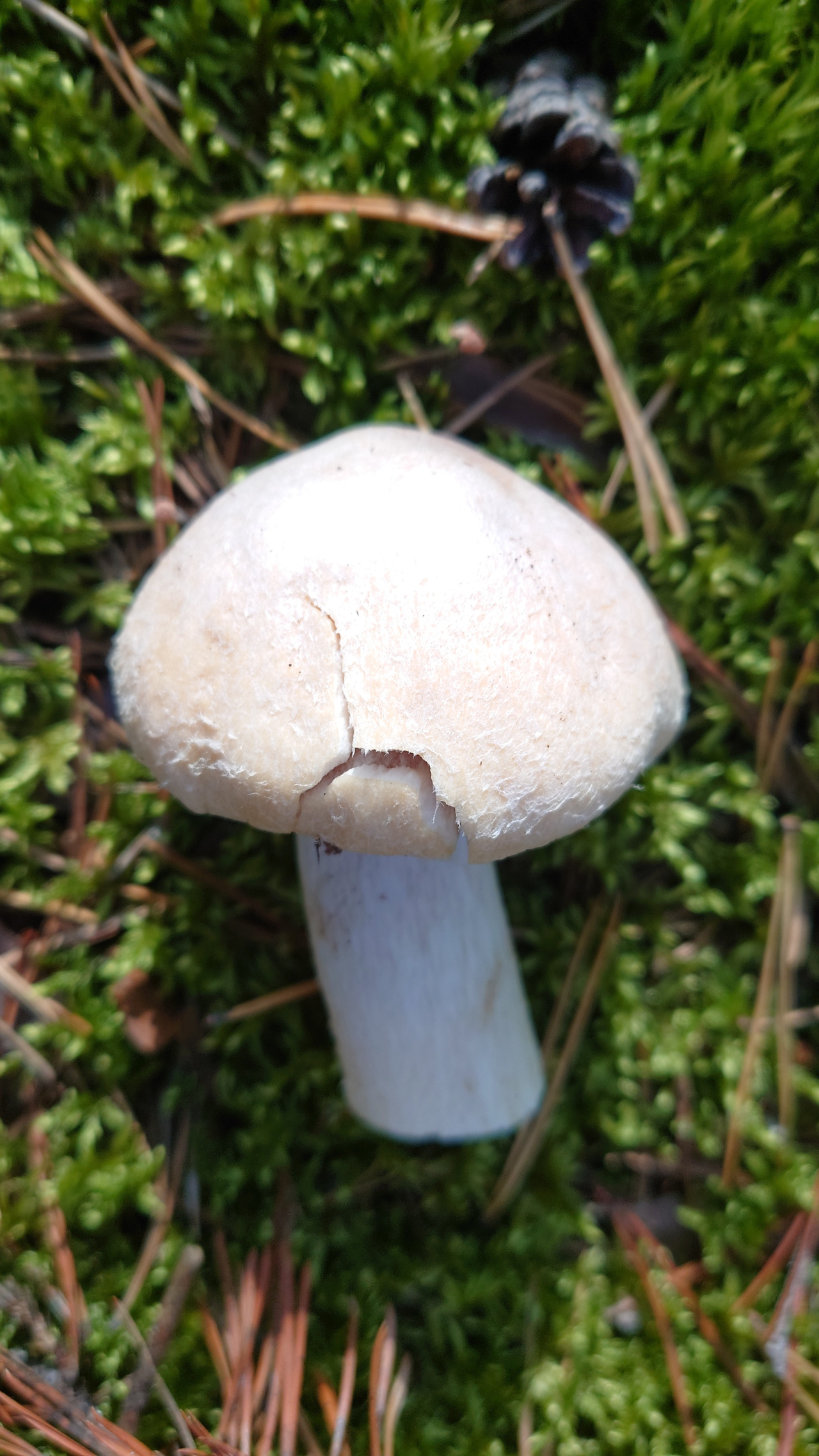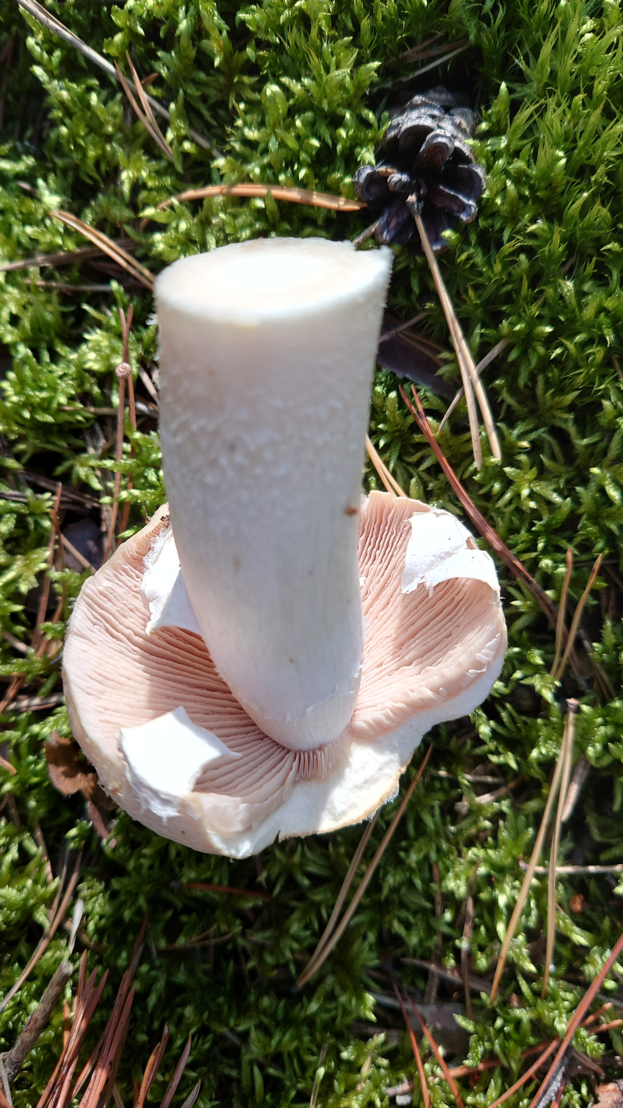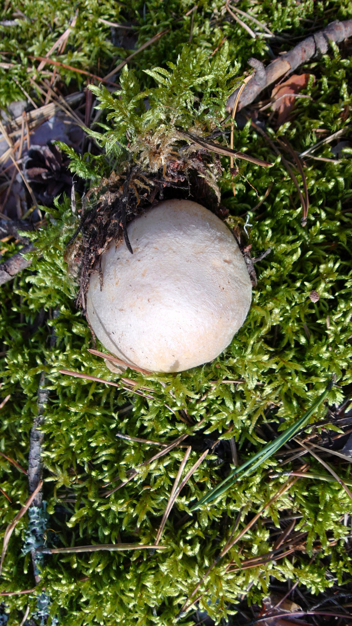 Шляпка бежевая, опалесцирует немного на макушке. Ножка белая, гименофор от бежевого до светло-коричневого у грибов постарше.