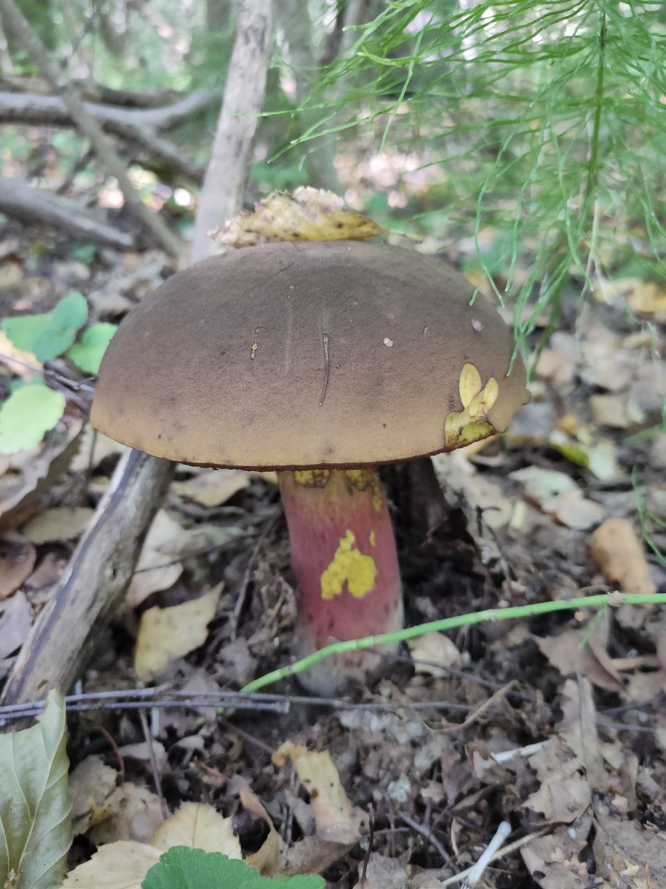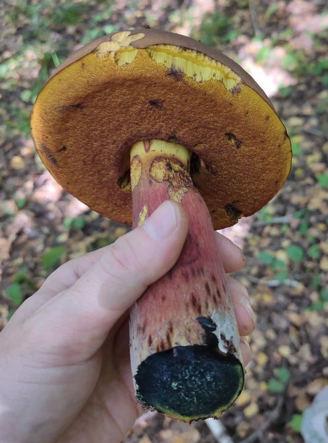 Описание гриба: Здравствуйте. Нашел сегодня в Московской области, лес лиственный, на срезе сразу посинел. Запах грибной. Подозреваю что дубовик крапчатый, но не уверен.
