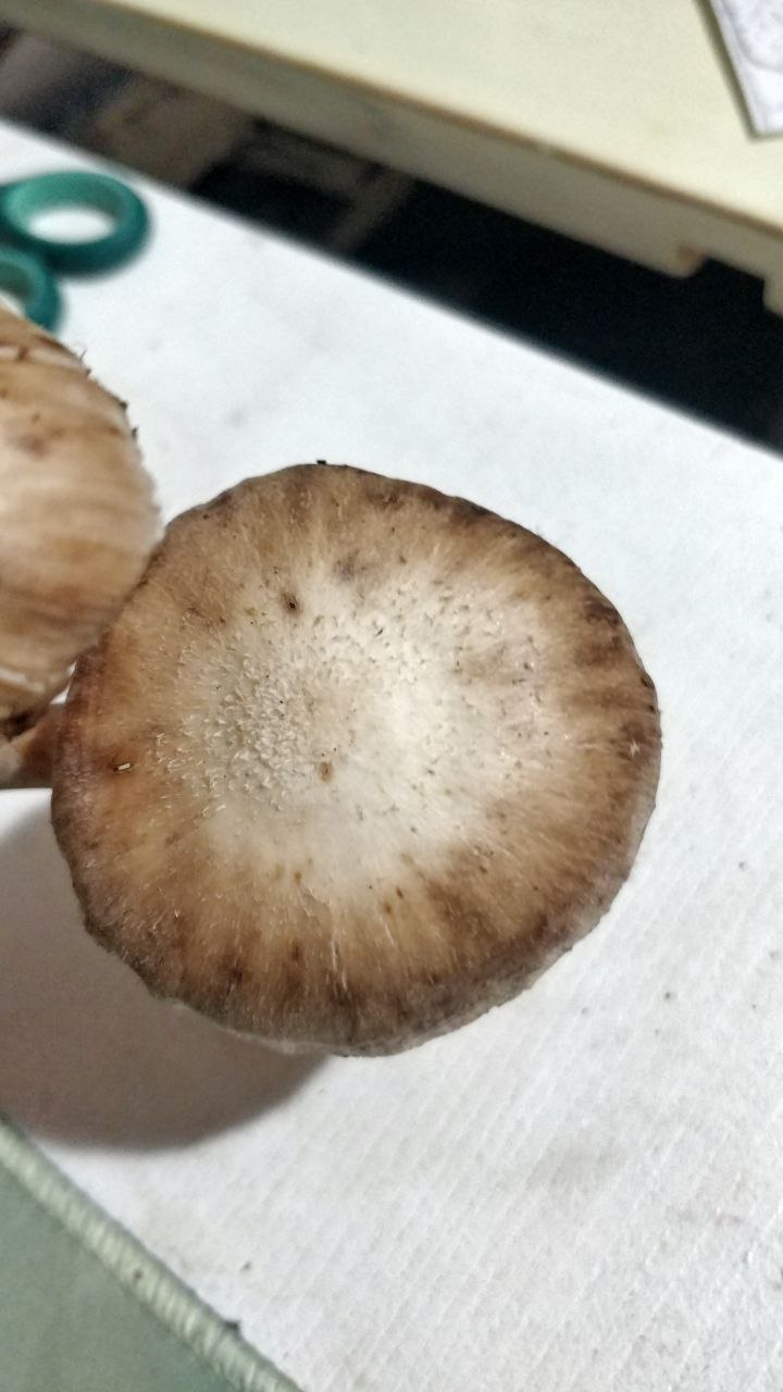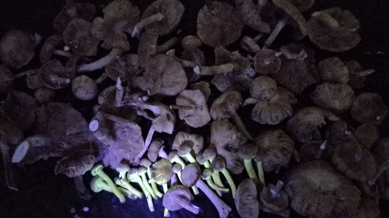 Описание гриба: Собран со старого упавшего дерева у болота. Рядом со смешанным лесом, ели, осины, березы. Гриба было много, как старого, так и молодого. На фото, где много грибов, лежит еще опенок сернисто желтый (просто для сравнения), видно, что в ультрафиолете гриб не светится, в отличие от ядовитого сернисто-желтого. Пахнет приятно, как опенок. Гриб не меняет цвет, мякоть бегая, упругая.