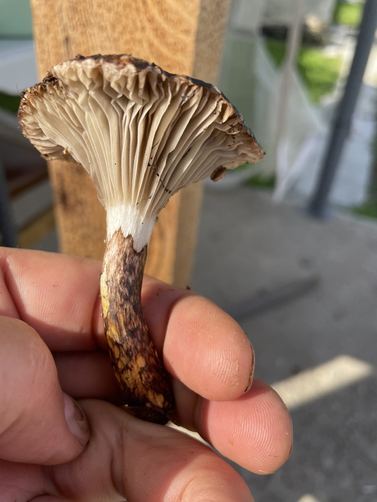 Это мокруха пятнистая. Она тоже под елями растёт, как и еловая. Съедобна, но маломясистая и невзрачная на вид.