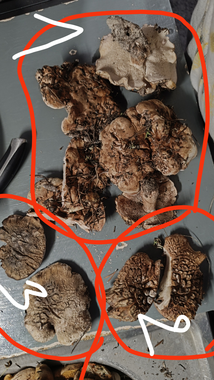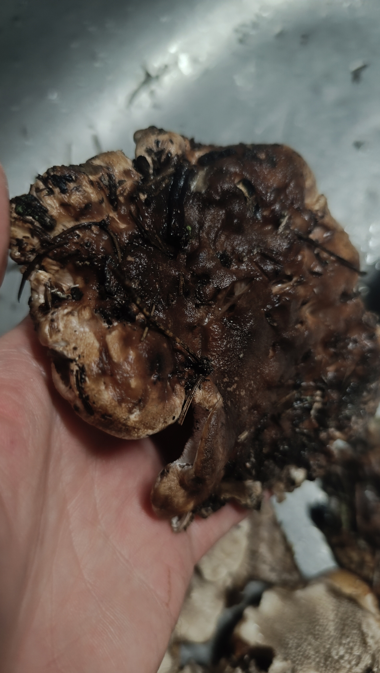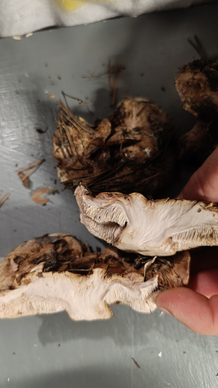 Запах приятный, грибной. Собраны в сосновом лесу. Нет характерных чешуек на шляпке. При этом она вся какая-то бугристая, как комки в каше, много мусора на ней закрепилось. Бархатная на ощупь. Цвет -оттенки коричневого. На срезе белый, стал серым на следующий день (фото в раковине).