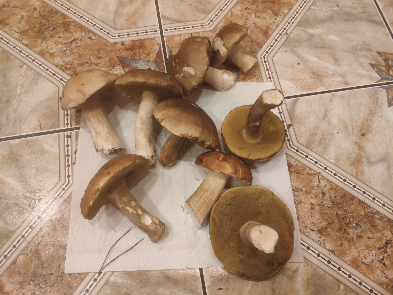 Еловые белые вроде бы. Вызывают сомнение только 3 гриба с тёмными ножками. Но грибов с розоватыми трубочками у вас нет — значит не желчные (ложные белые). Так что можете есть спокойно.