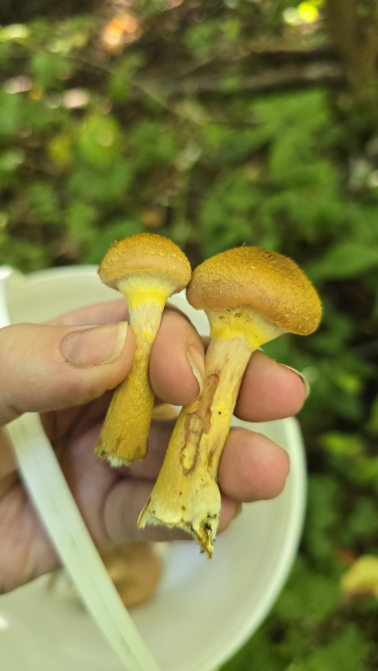 Описание гриба: Собирали опята на старых берёзовых пнях. На нескольких пнях грибы были с заметной желтизной на ножке, цвет шляпки и чешуек тоже немного отличается от привычных толстоногих опят (немного темнее и желтее).