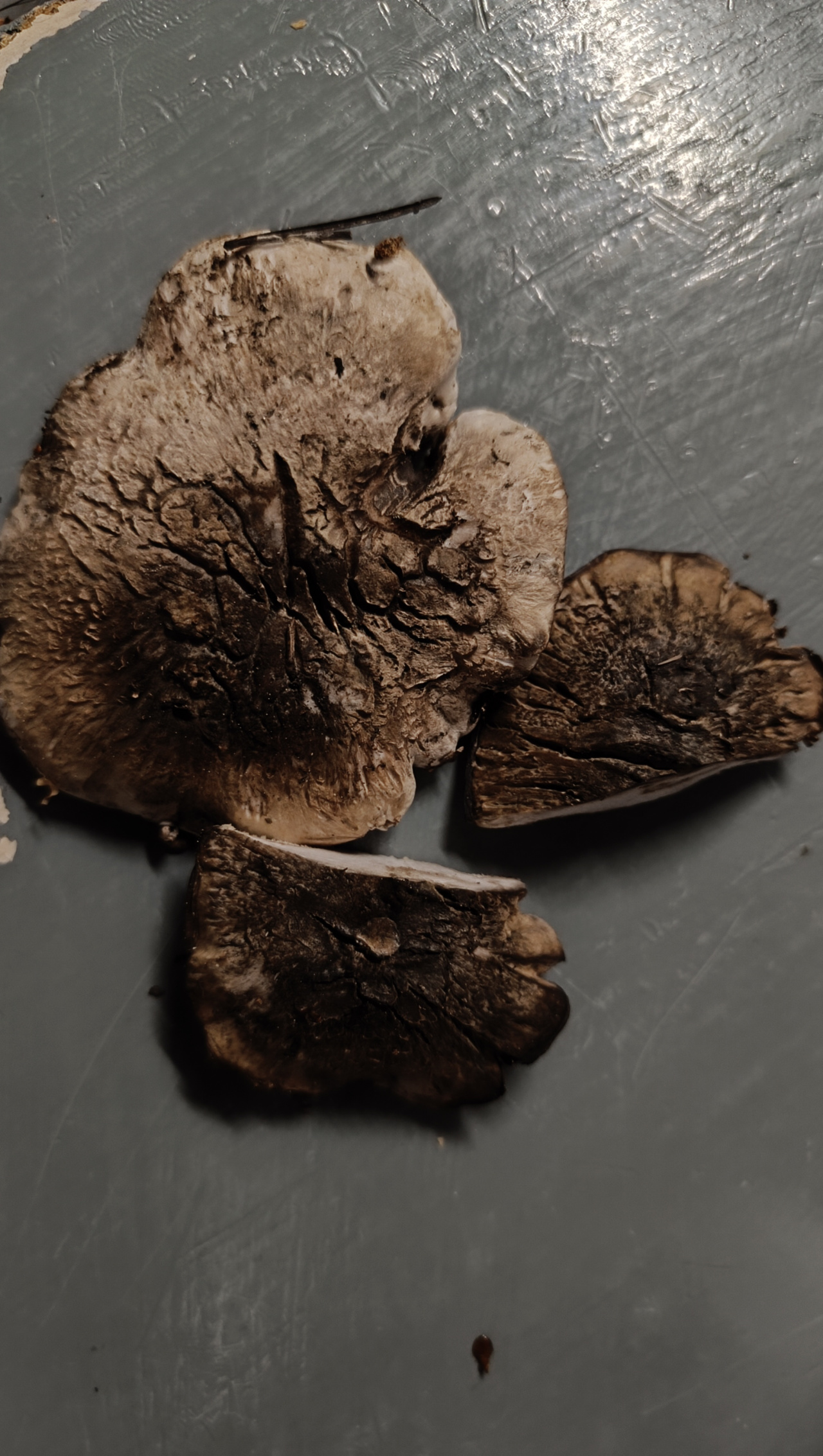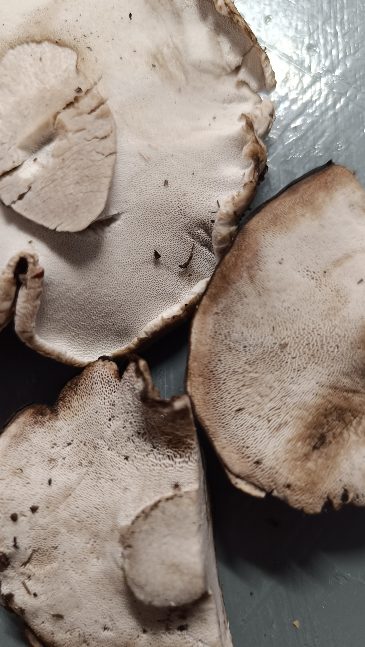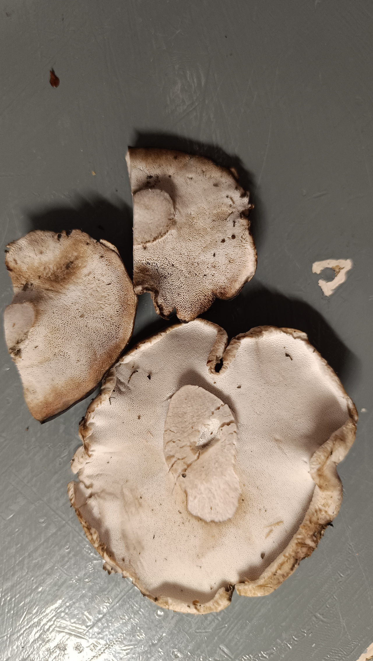 Запах нейтральный. Собраны в сосновом лесу. Единичные находки. Росли рядом с ежевикой черепитчатым. Собирала в сумерках, гриб был в грязи, думала он и есть. Дома разглядела, что совсем не то что-то. На срезе белые, на следующий день цвет не изменился. Проба мякоти на язык — не горькие