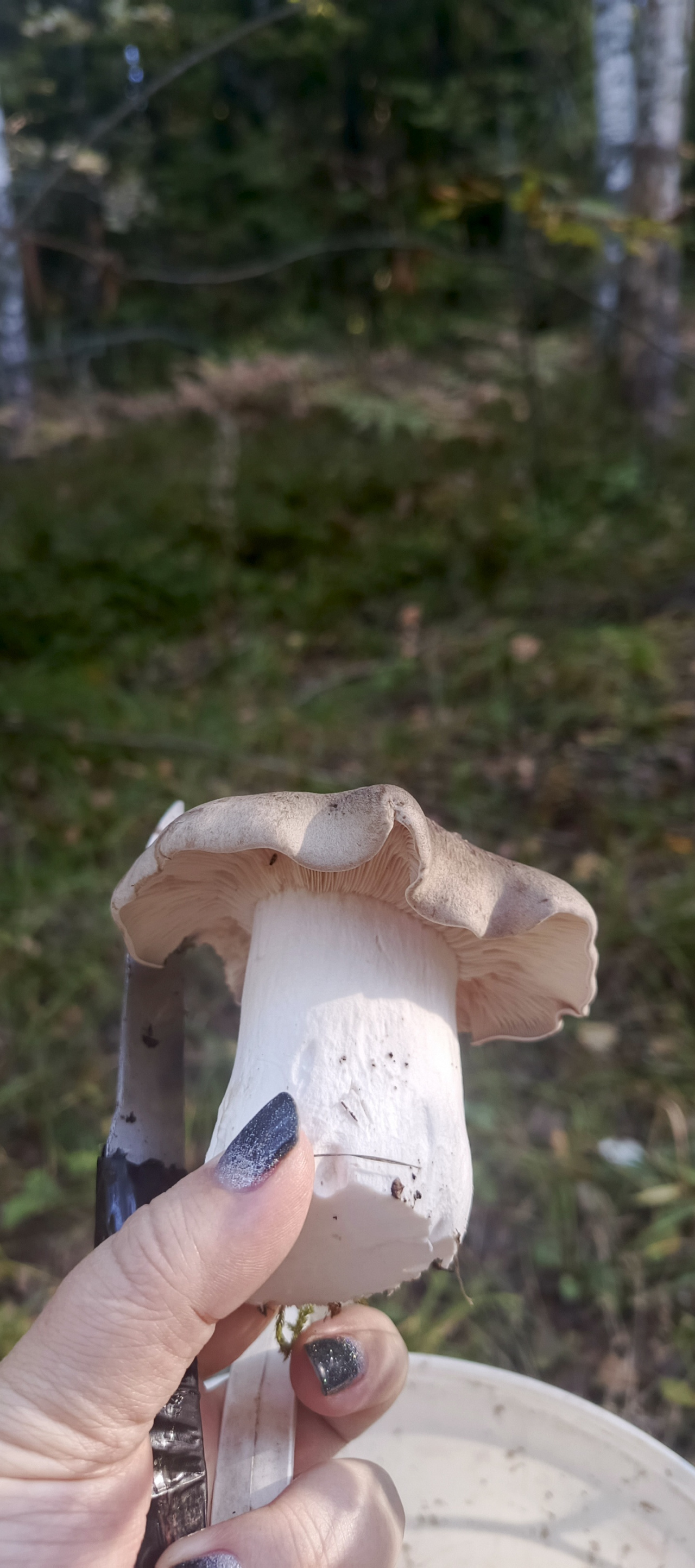 Описание гриба: Нашла в лесу вот таких красавцев: большого размера , ножки толстенькие, плотные, беленькие. Шляпка серенька, скрученная немного, под шляпой пластиночки. Пахнет приятно