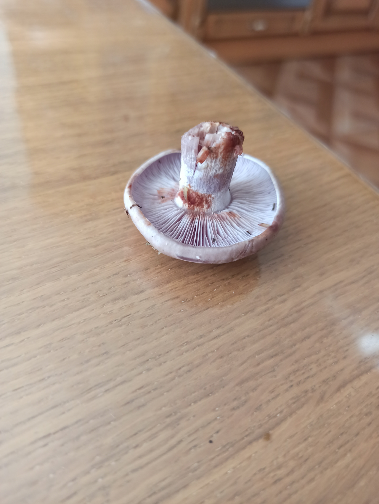 Описание гриба: Нашёл гриб возле ёлки, шляпка бледнокоричневая , ножка и под шляпкой — бледнофиолетовая, срез стал коричневым. Подскажите что за гриб?