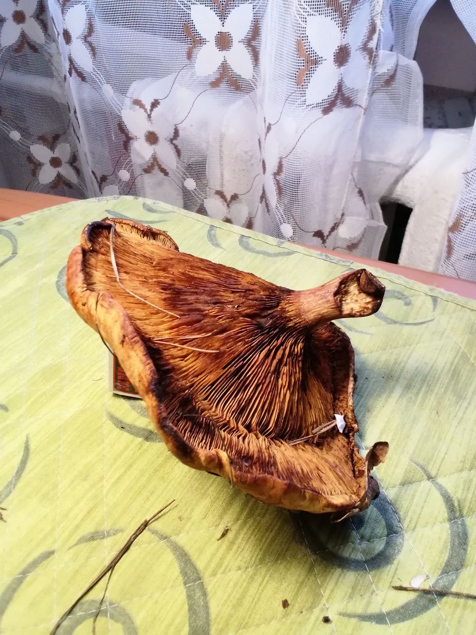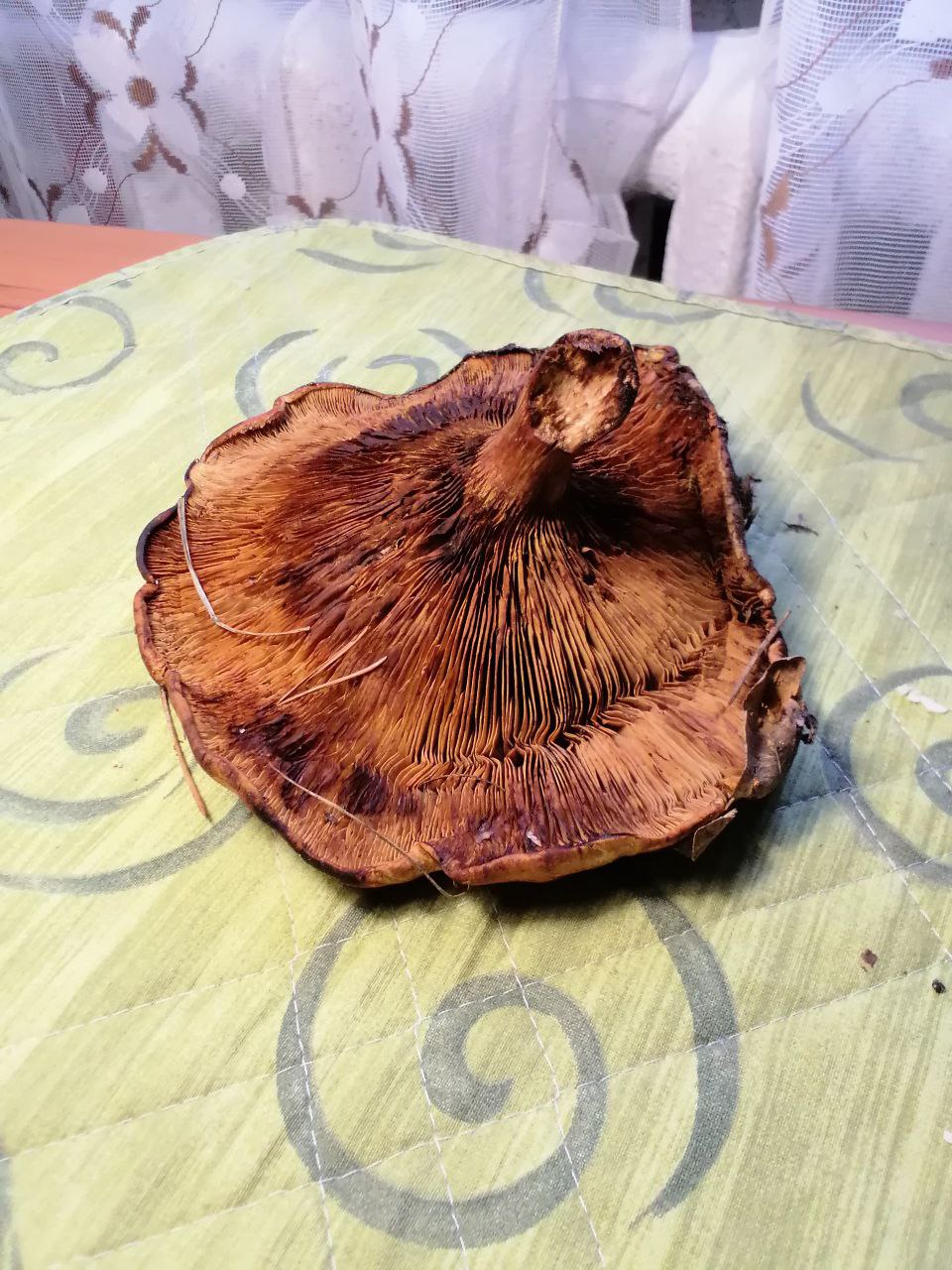 Описание гриба: Место сбора: смешанный (в основном хвойный) лес в Пуще-Водице под Киевом; запаха никакого нет — разве что сыростью; ножка гриба жесткая; на сломе ножки гриба цвет светло коричневый — как и цвет шляпки гриба; пластины имеют цвет густо коричневый, а обжатые (травмированные) пластины темнеют до черно-коричневого цвета