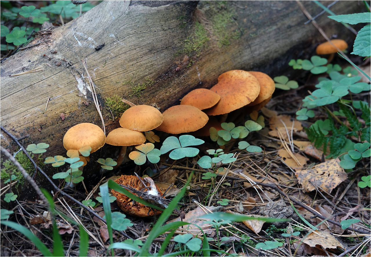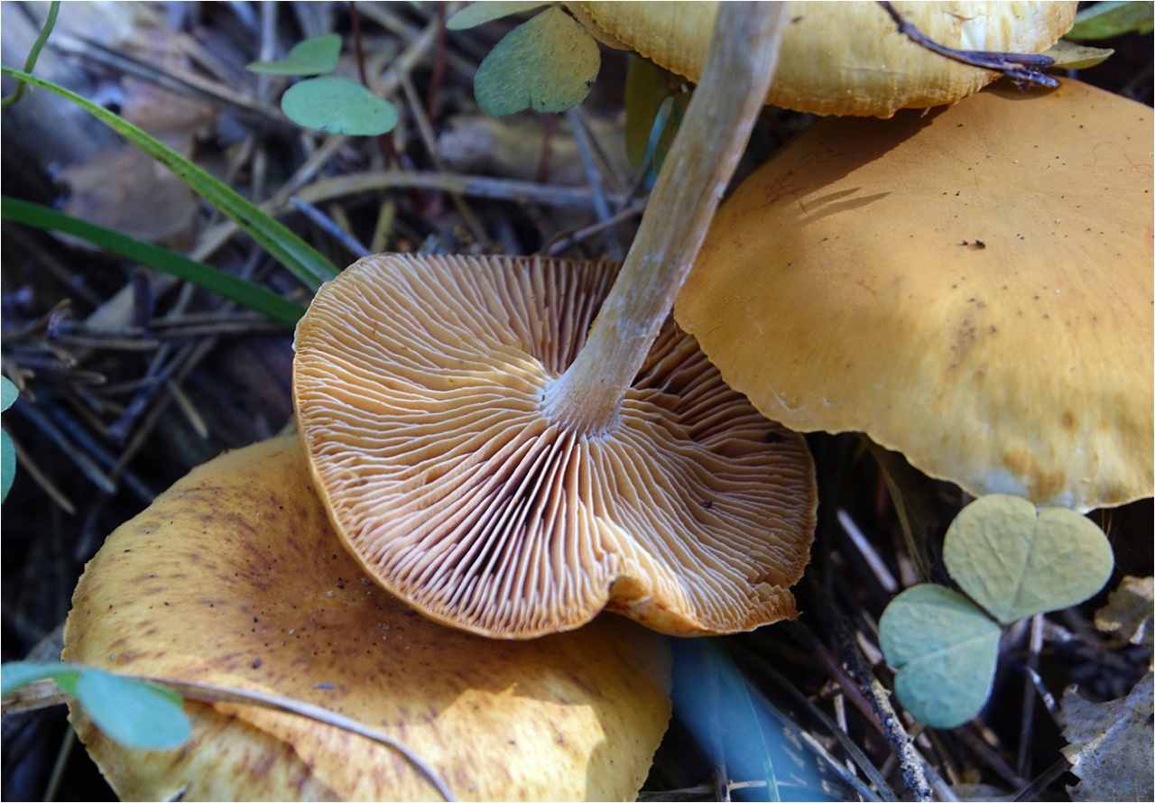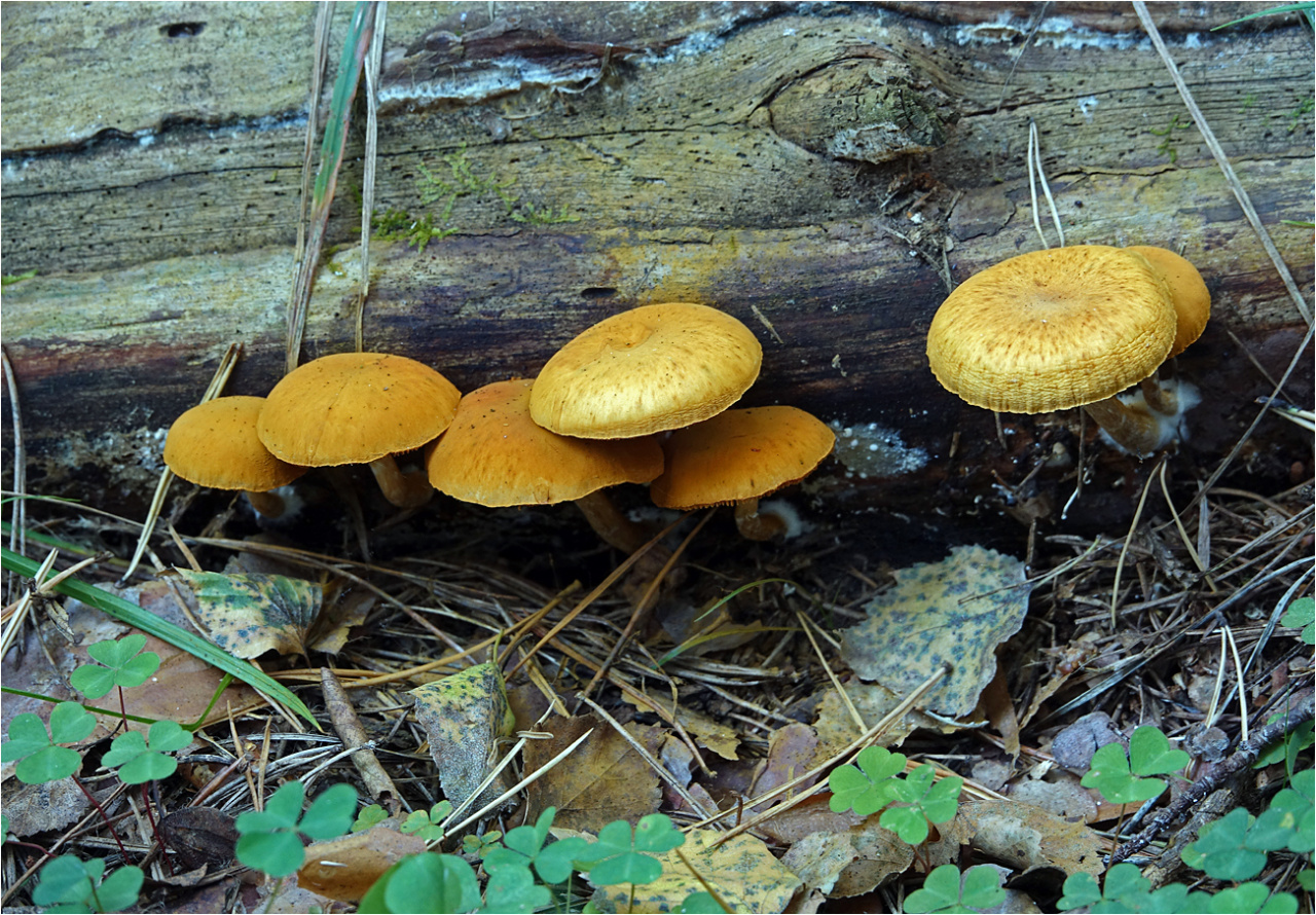Я ориентировался на ваше же описание вопроса. Если теперь вы уверены, что это сосна, то это меняет моё мнение о ваших грибах на противоположное. То есть теперь я думаю, что на фото Гимнопил проникающий — просто он больше похож внешне на ваши грибы.