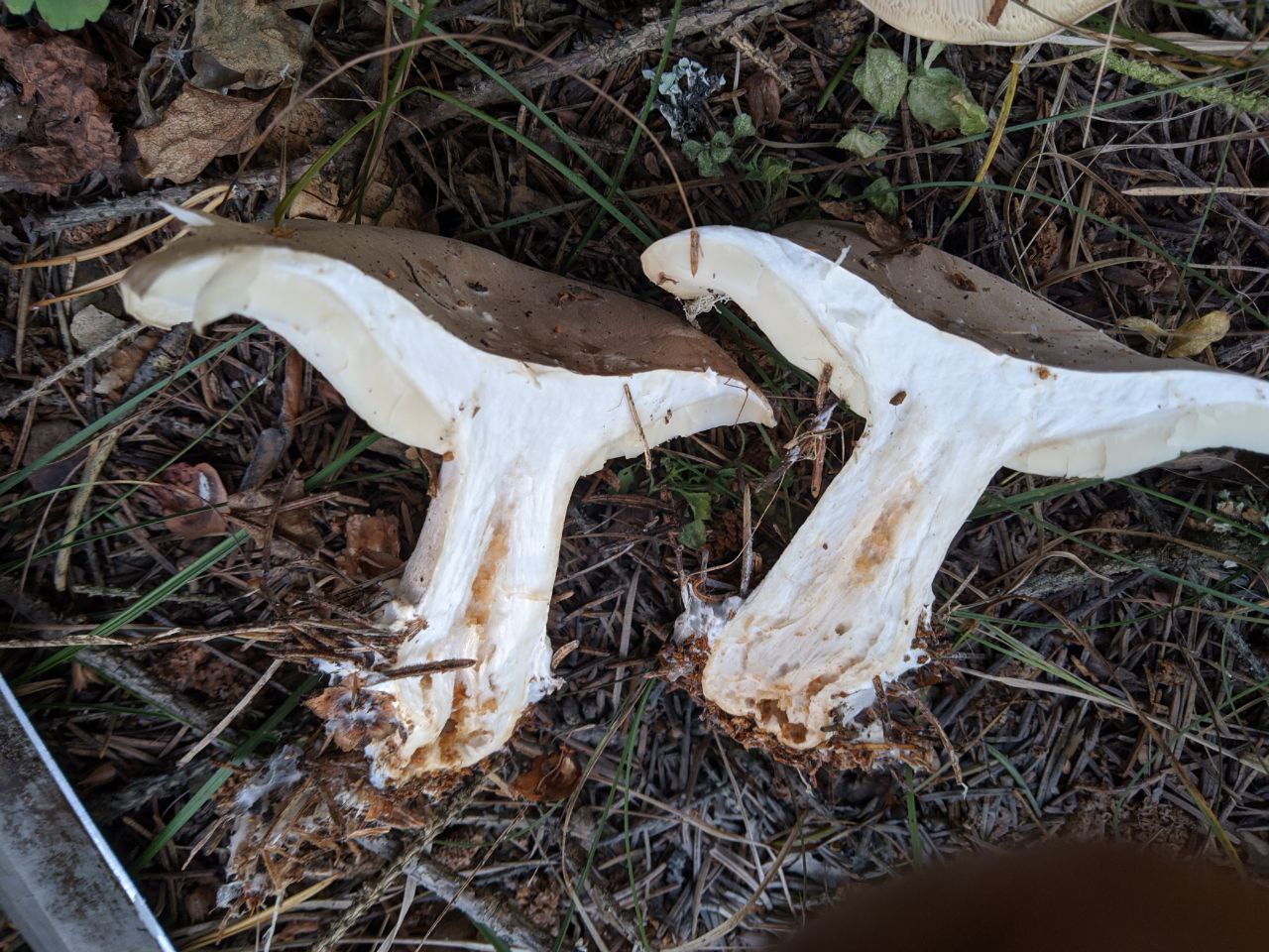 Гриб рос под елью. Такое ощущение, что многие экземпляры росли из шишек. Грибов 20 «выкорчевал», у 6 из них сбоку основания гриба намертво прицеплена шишка.
