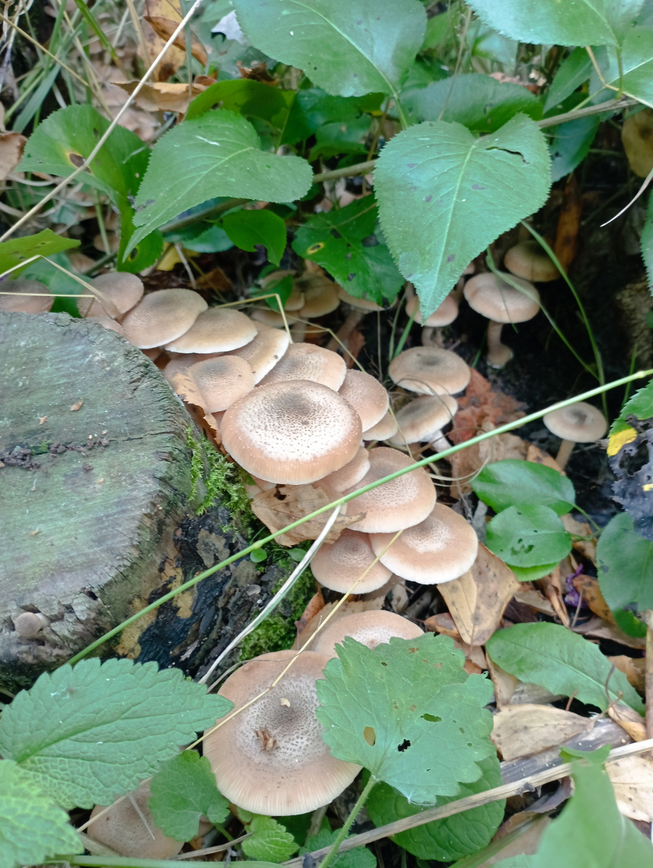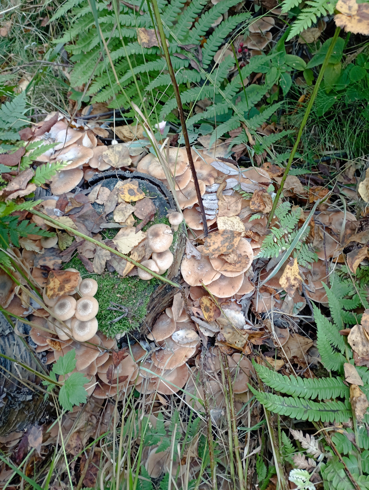 Описание гриба: Ленинградская область Приозерский район. Выросли на участке в очень большом количестве, раньше никогда такого не было. Я так понимаю что это один из подвидов опëнка, прочитала что оказывается их очень много. Выросли на пнях и прямо на земле, целыми дорожками.