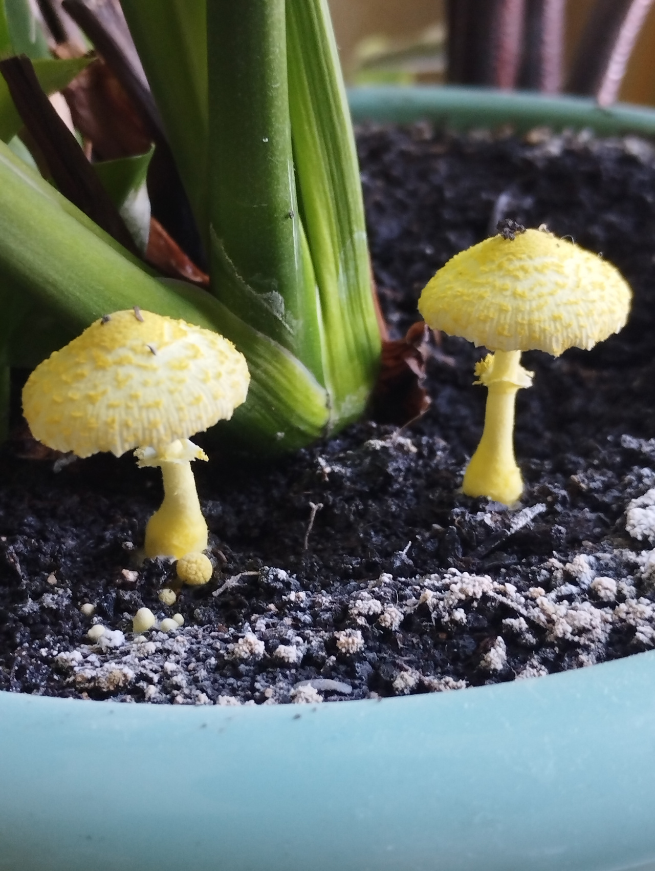 Описание гриба: Желто -зеленого цвета, маленький, шляпка с чешуйками есть маленькая юбочка, утолщение внизу. Вырос в цветочном горшке