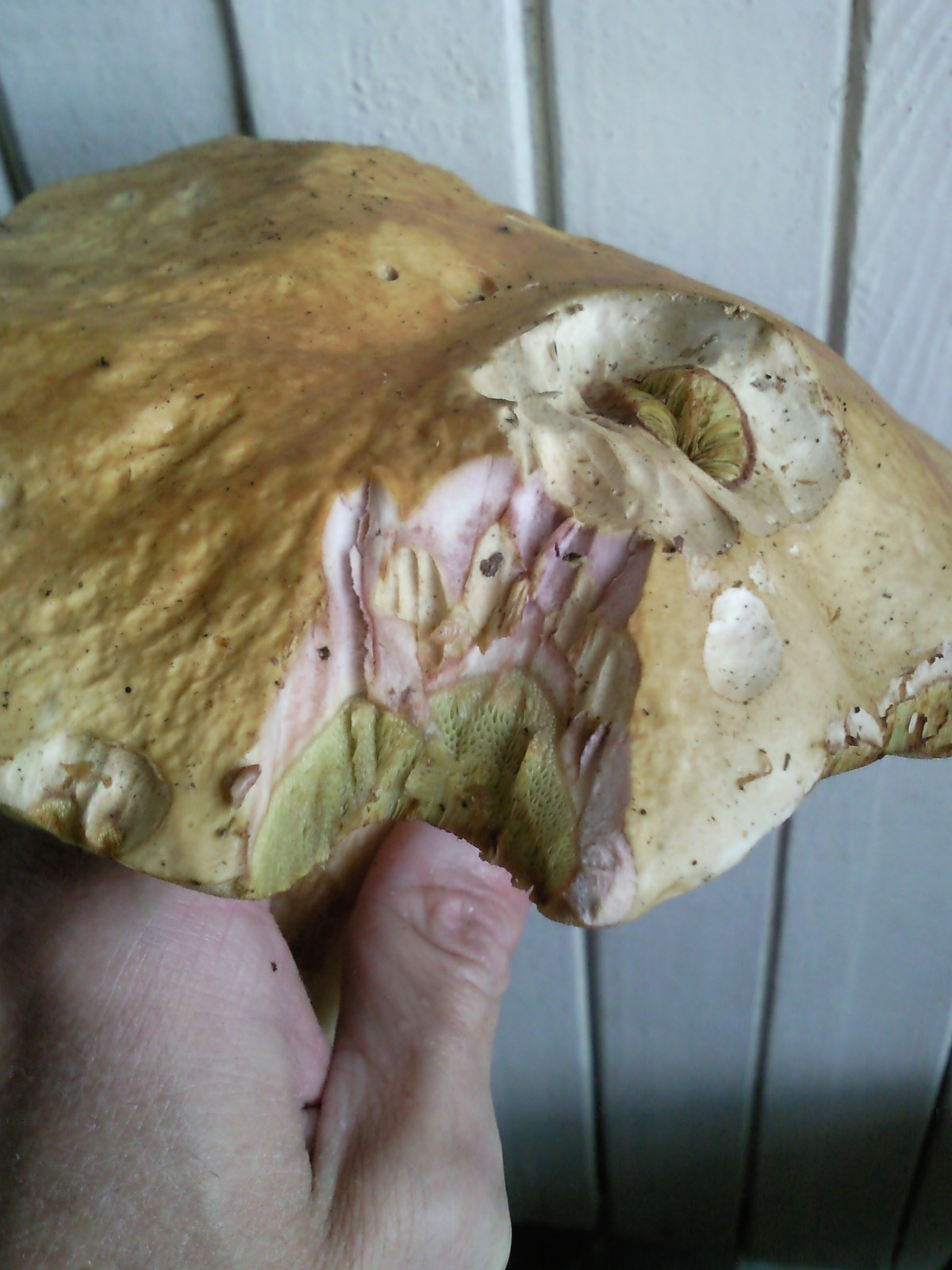 Описание гриба: Это белый. Вопрос в другом — нигде не читал, что при срезе он меняет цвет на розовый. У вас тоже об этом не сказано. Эволюция, что ли? Или новая форма? Раньше как-то не обращал на это внимания