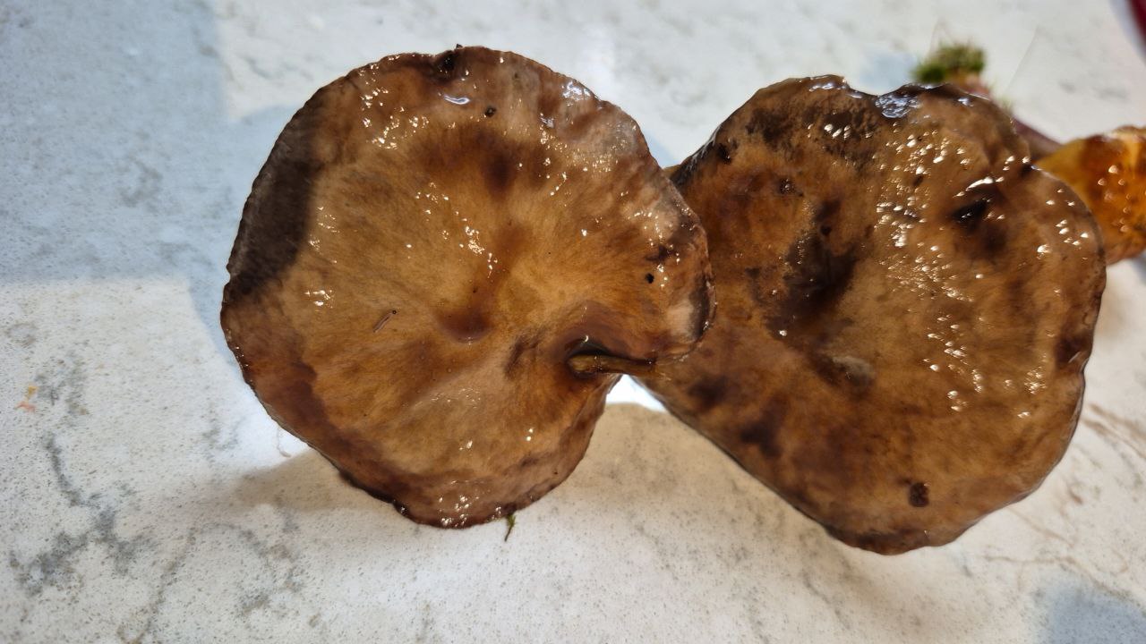 Описание гриба: похож на маслята, смешанный лес, Западная канадацвет не меняет, скользкая шляпка, пористая поверхность под шляпкой, ножка твердая