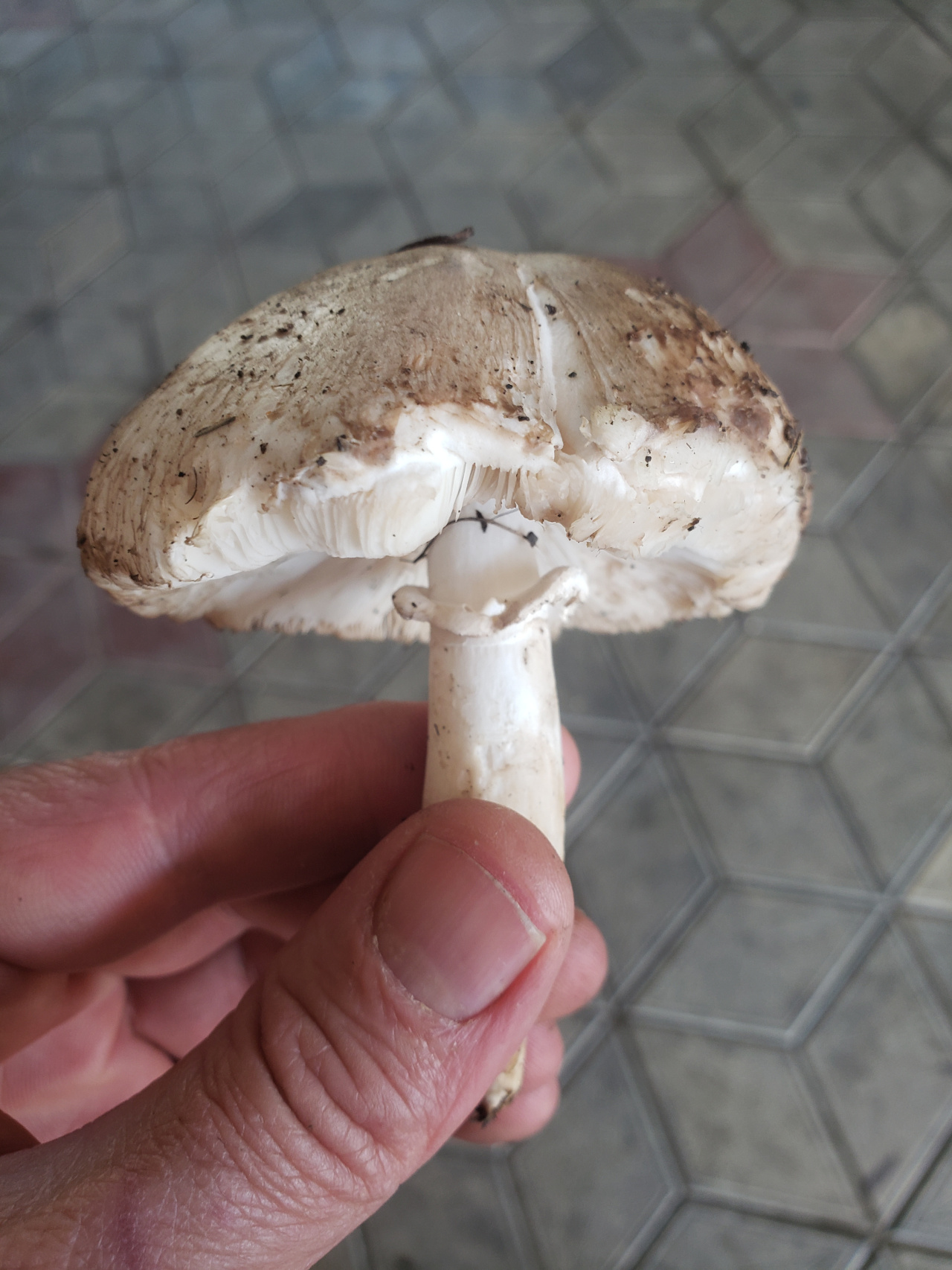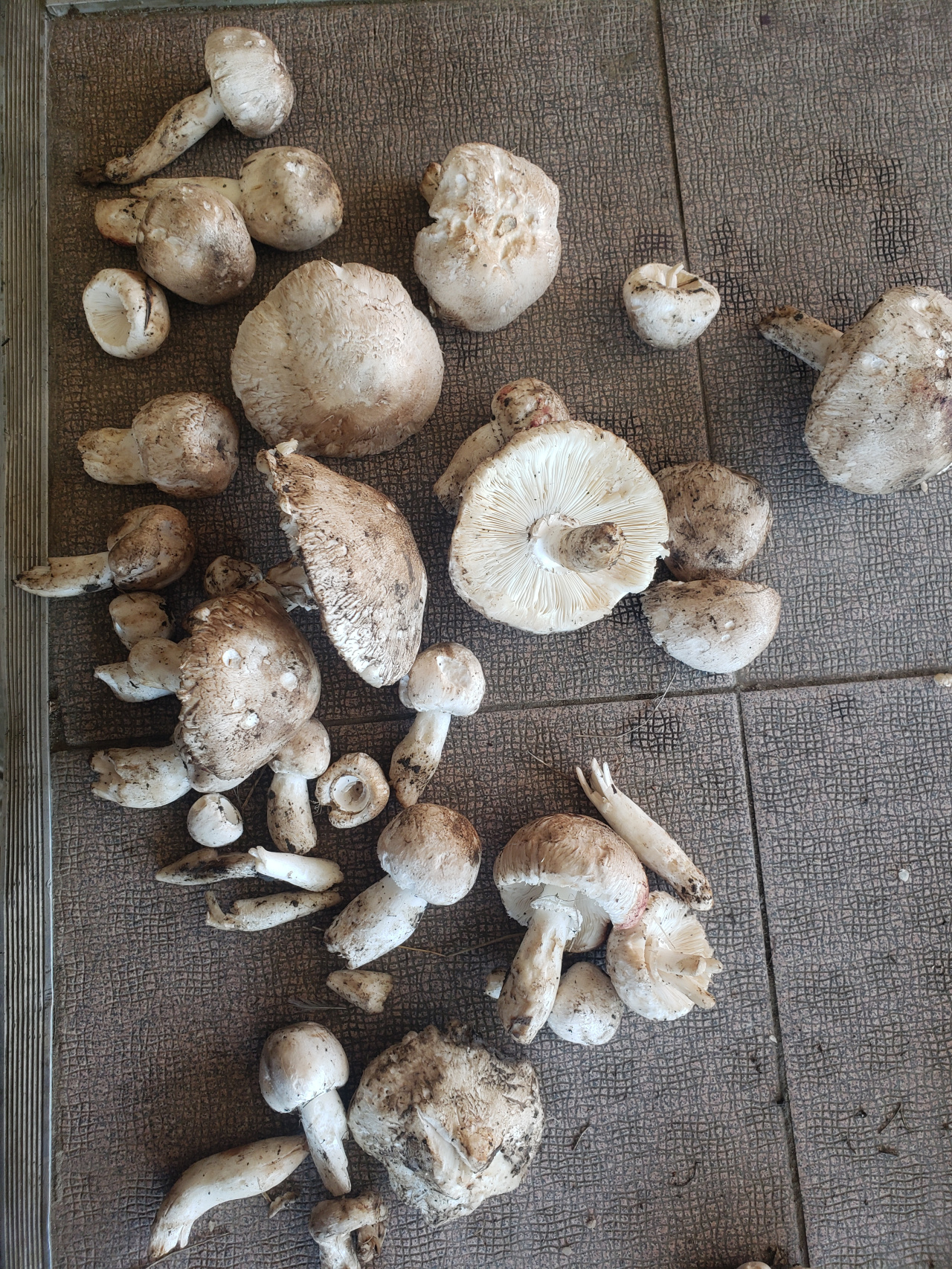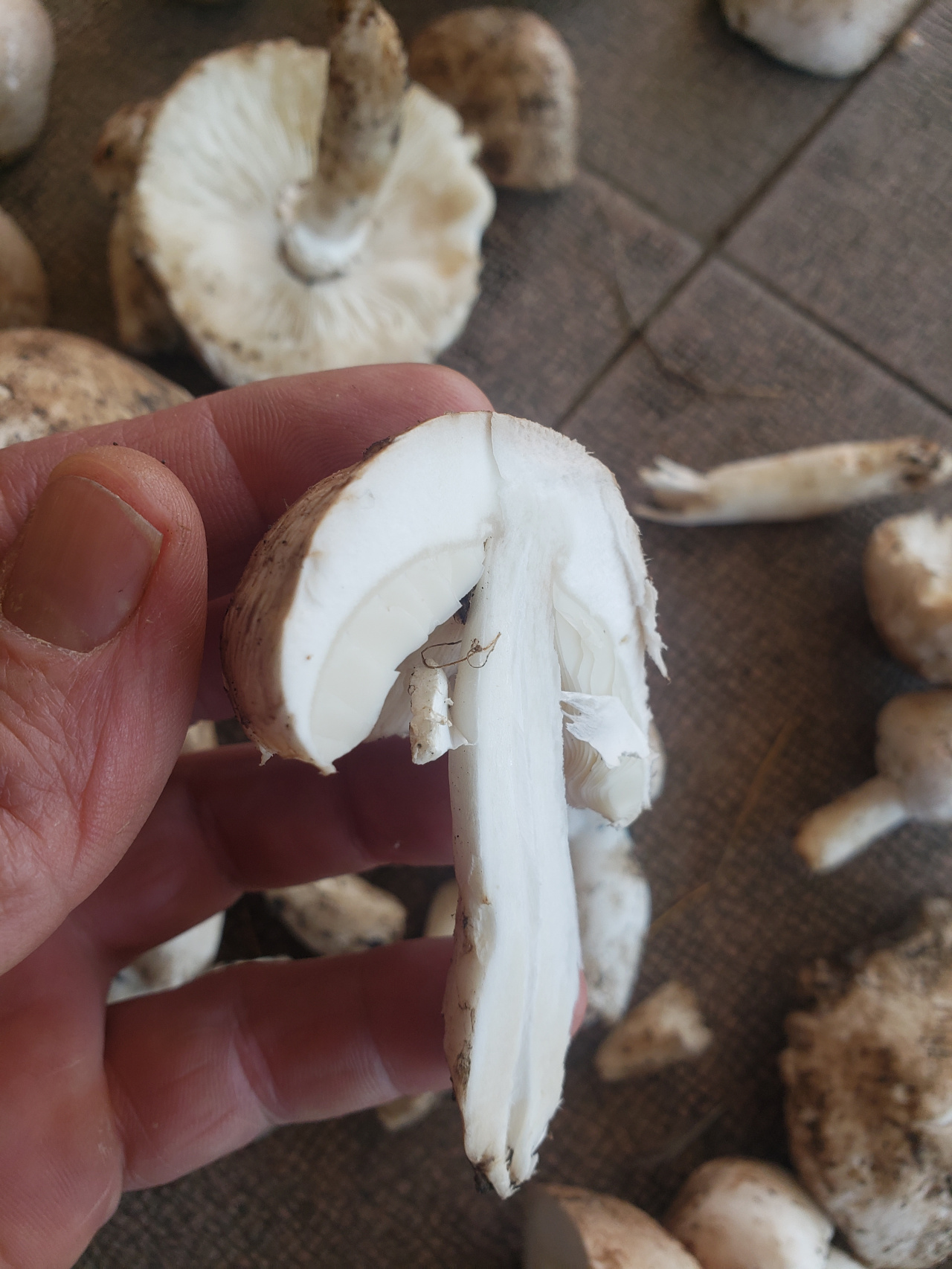 Описание гриба: Похож на шампиньон, собран в поле,на сенокосе,. Запах, влажной кожи, приятный как у шампиньона, цвет на срезе вроде не меняется при надавливании тоже.