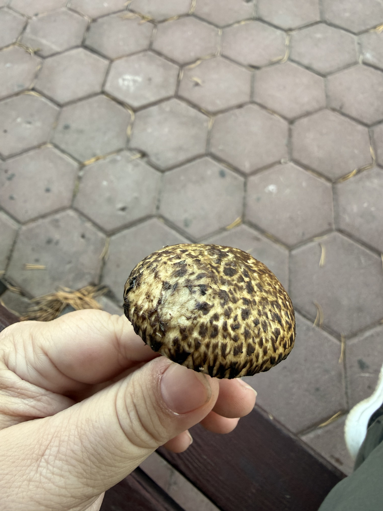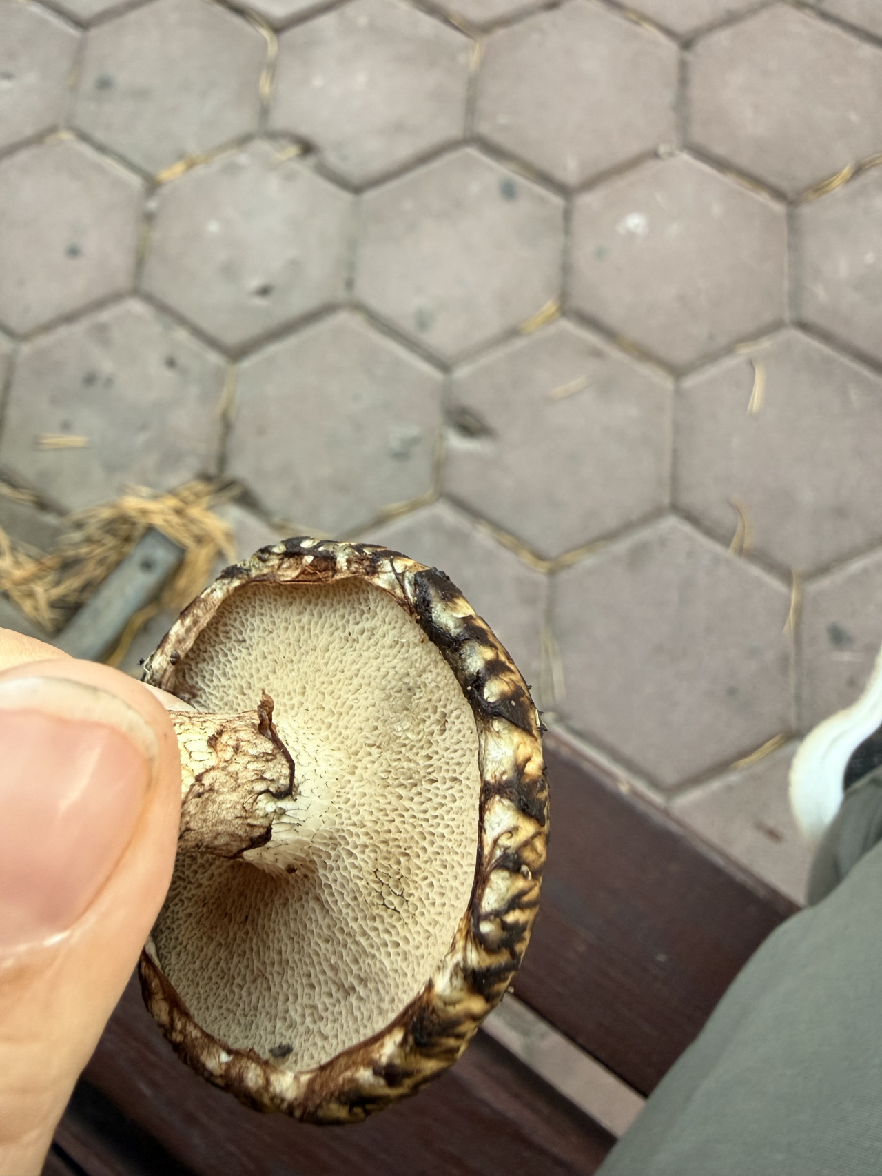 Похож на масленка серого, мог бы быть шишкогриб хлопьеножковый, но у него пластинки