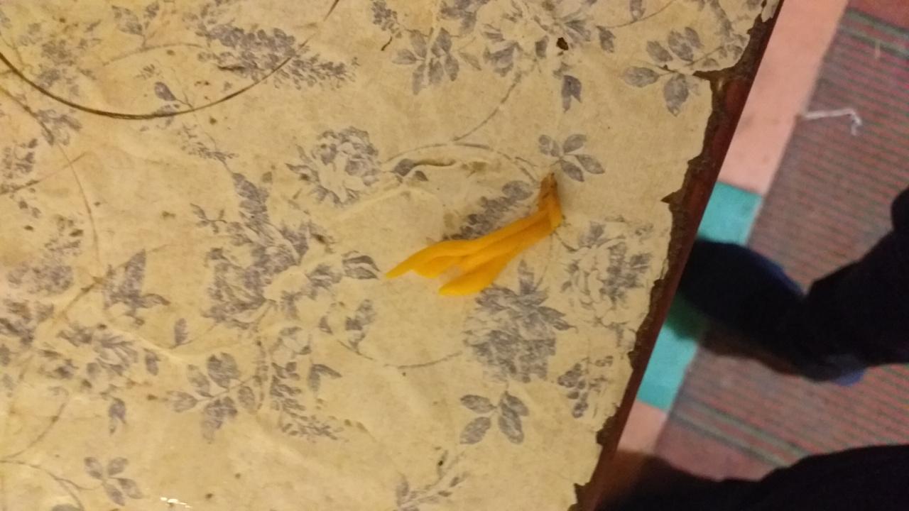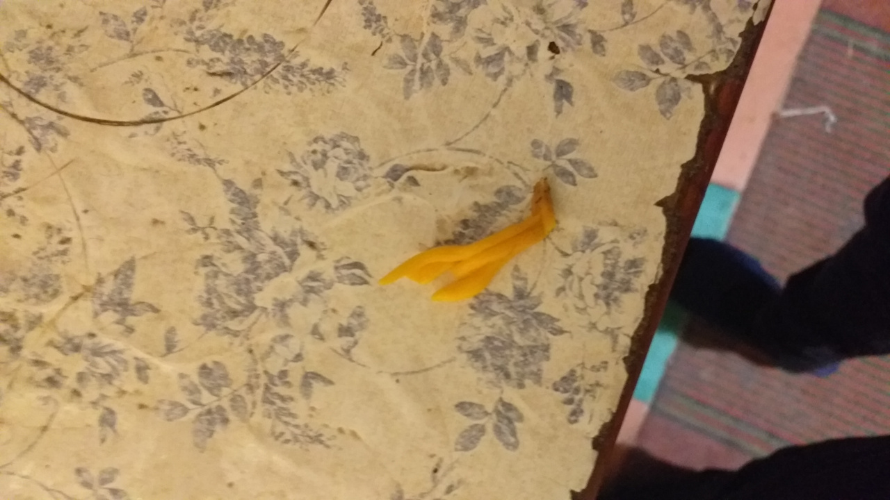 Описание гриба: Рос возле лисичек(лес возле Екб, елки+немного берез-осин), сперва подумали что это молодая лиса, но потом возникли сомнения. Во всяких справочниках молодые лисы уже с толстой ножкой и со шляпкой заметной. А этот по форме похож на три сросшихся «побега», толщиной миллиметра в три и длинной около 3 см. Запаха не заметили, цвет не менял, на ощупь довольно плотный